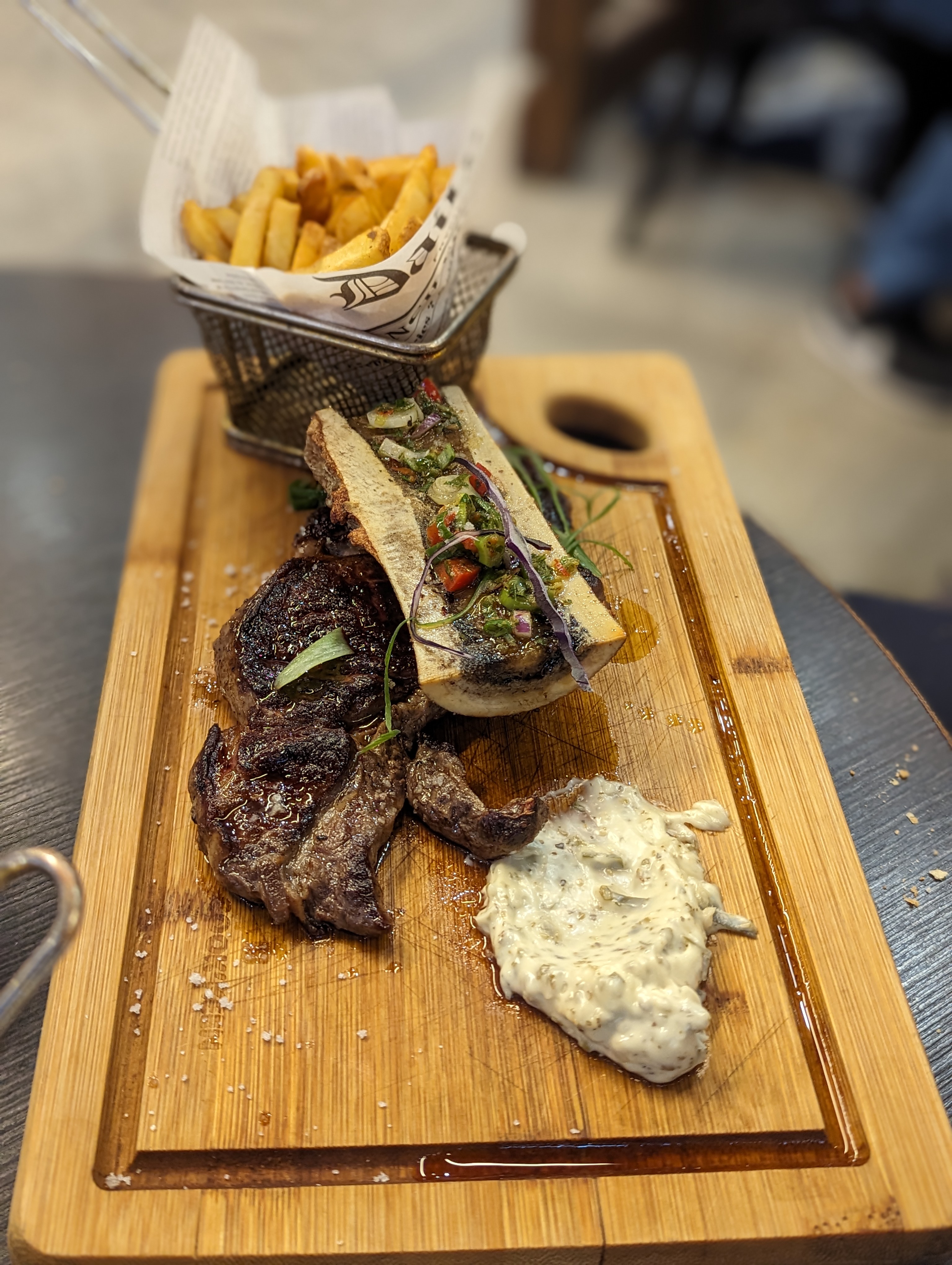 Objectivement: le 1er serveur a été adorable mais alors qu'est ce que ce repas a été catastrophique ... déjà on se trompe en nous servant la commande d'une autre table, ensuite le pain nous devons le demander et il est rassis, la cuisson de la viande n'est pas respecté, les frites sont froides, même les sauces sont infecte ! La viande est nerveuse et l'os à moelle est cru ! Sans parler du burger sans aucun goût en revanche l'addition elle, est bien salée. Il est évident qu'il sera inutile de nous présenter des excuses sur Google car le second serveur qui nous a encaisser ne nous à même pas demandé notre avis.