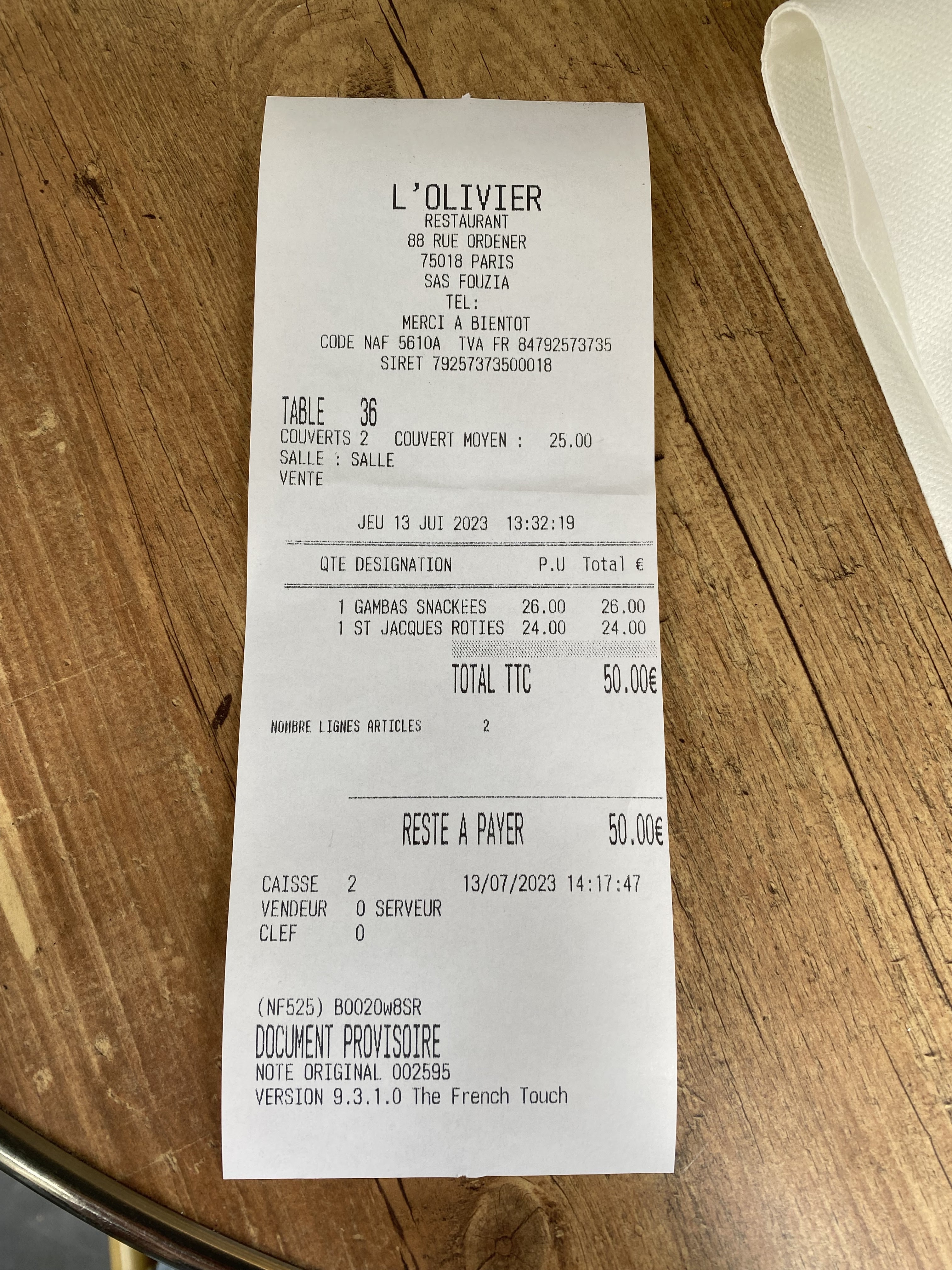 En vacances pour 3 jours sur Paris, nous avons dîner à l'olivier: le saumon, le burger de l'olivier (bœuf angus) avec les frites de patates douces puis un café gourmand et un cœur coulant au chocolat. Tout était parfait, les cuissons, les goûts, la présentation, le service, le personnel. De plus, la salle est décoré avec raffinement et sobriété ce qui donne une atmosphère cosy très agréable.
