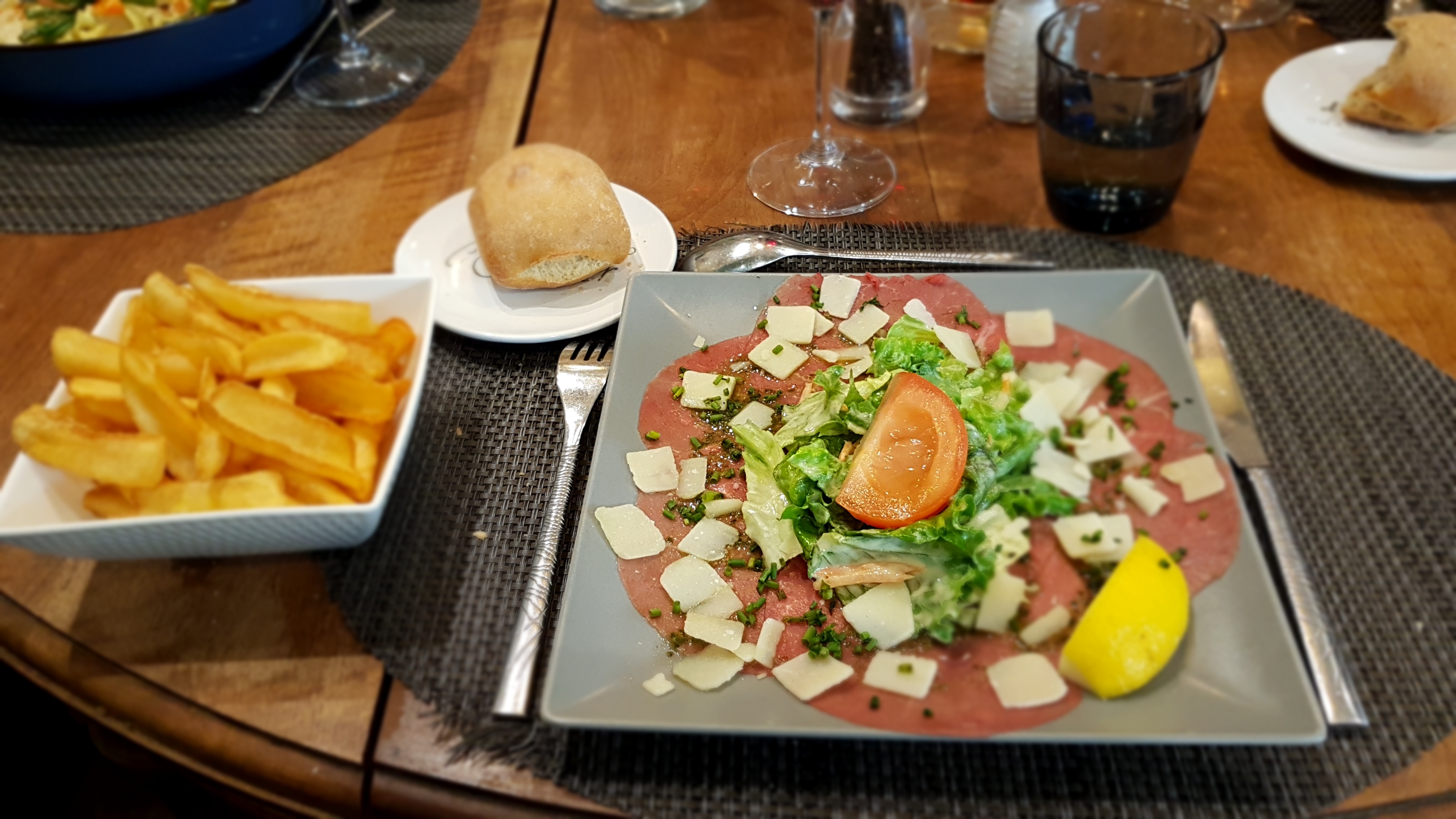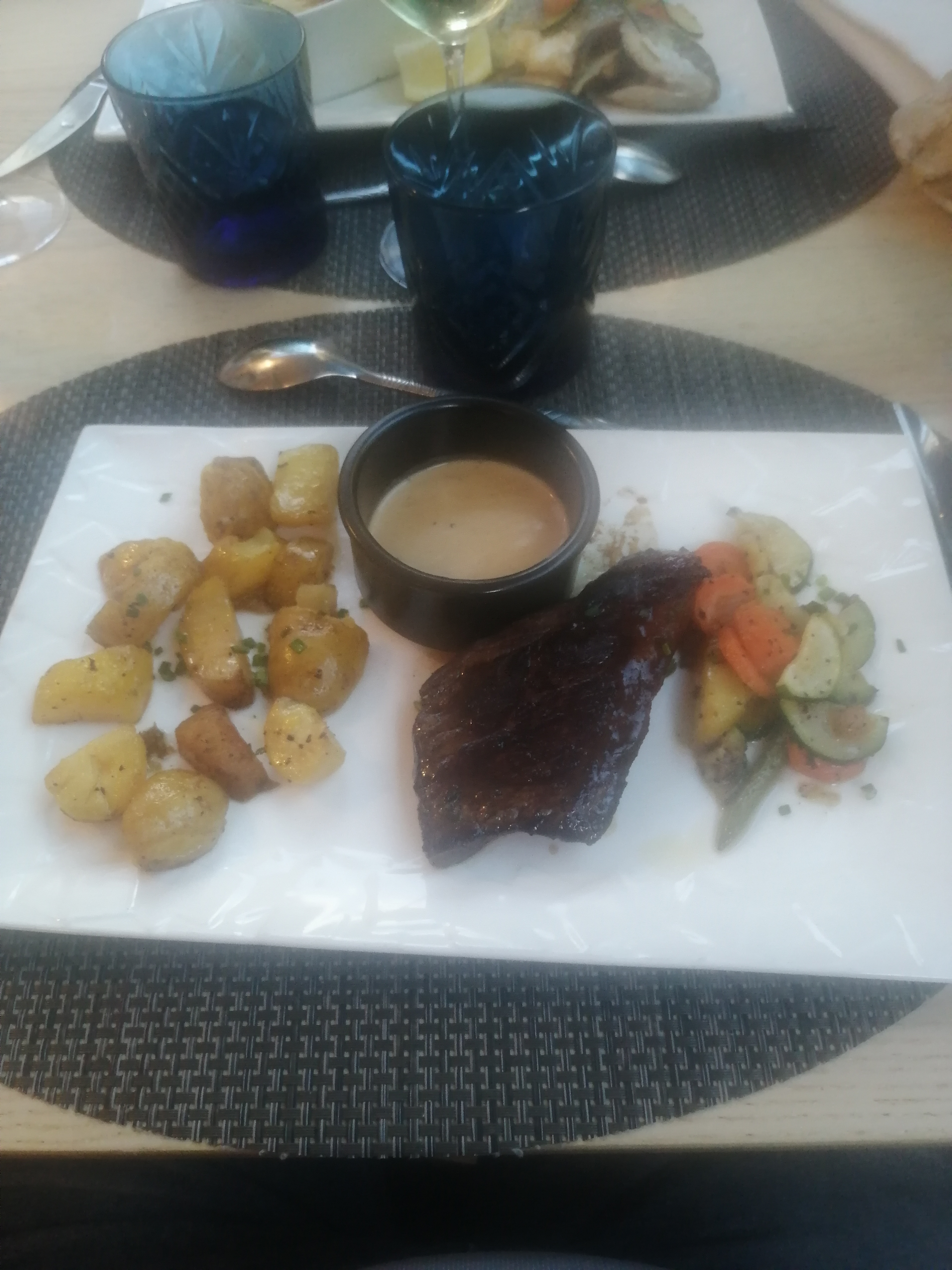 Le set de table était sale. La bouteille d'eau était déjà ouverte quand le serveur nous l a apportée Les plats étaient corrects mais sans plus.