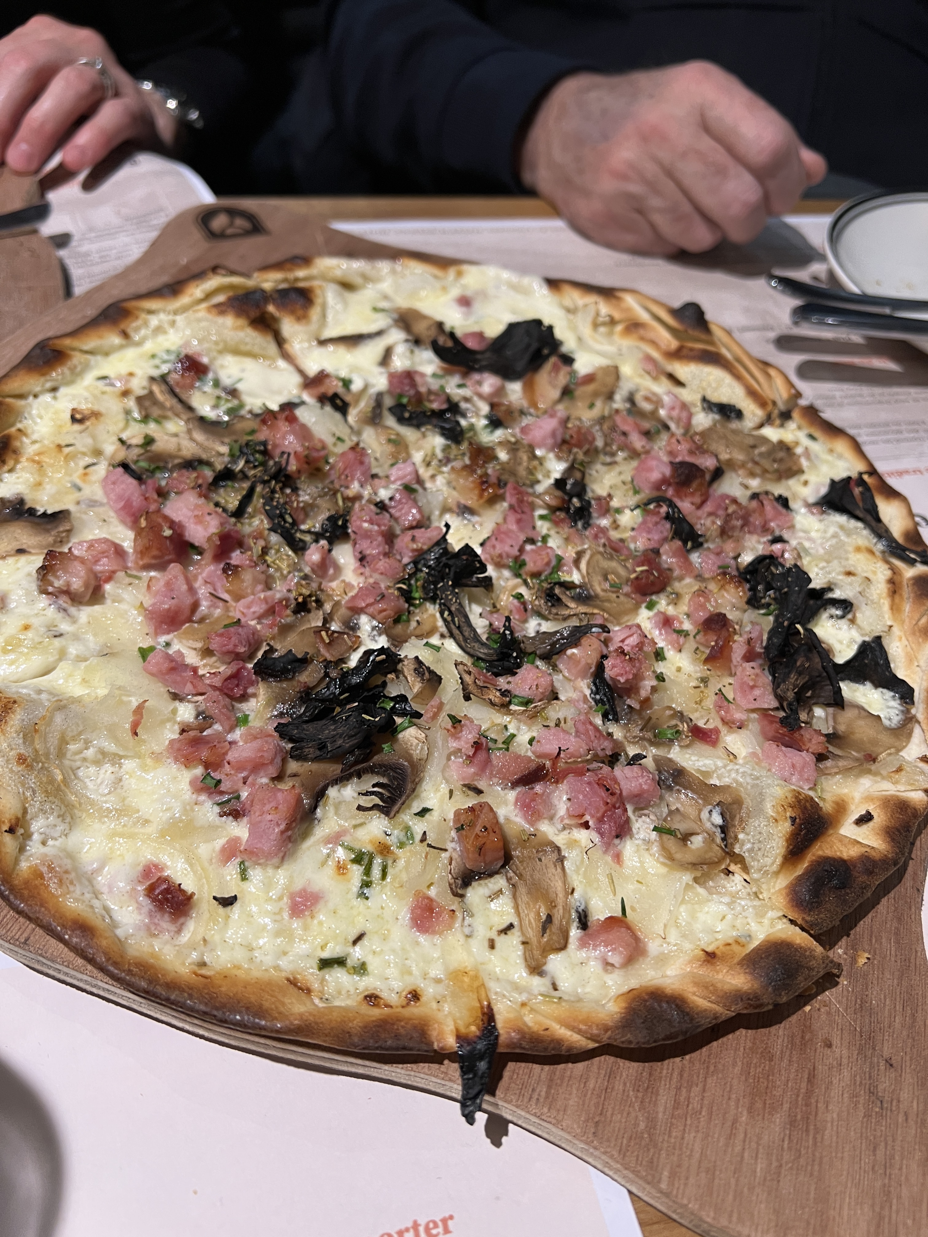 Un vrai plaisir que de revenir manger un tarte flambée cuite au feu de bois !!! J'ai pris une forestière aux trompettes de la mort.