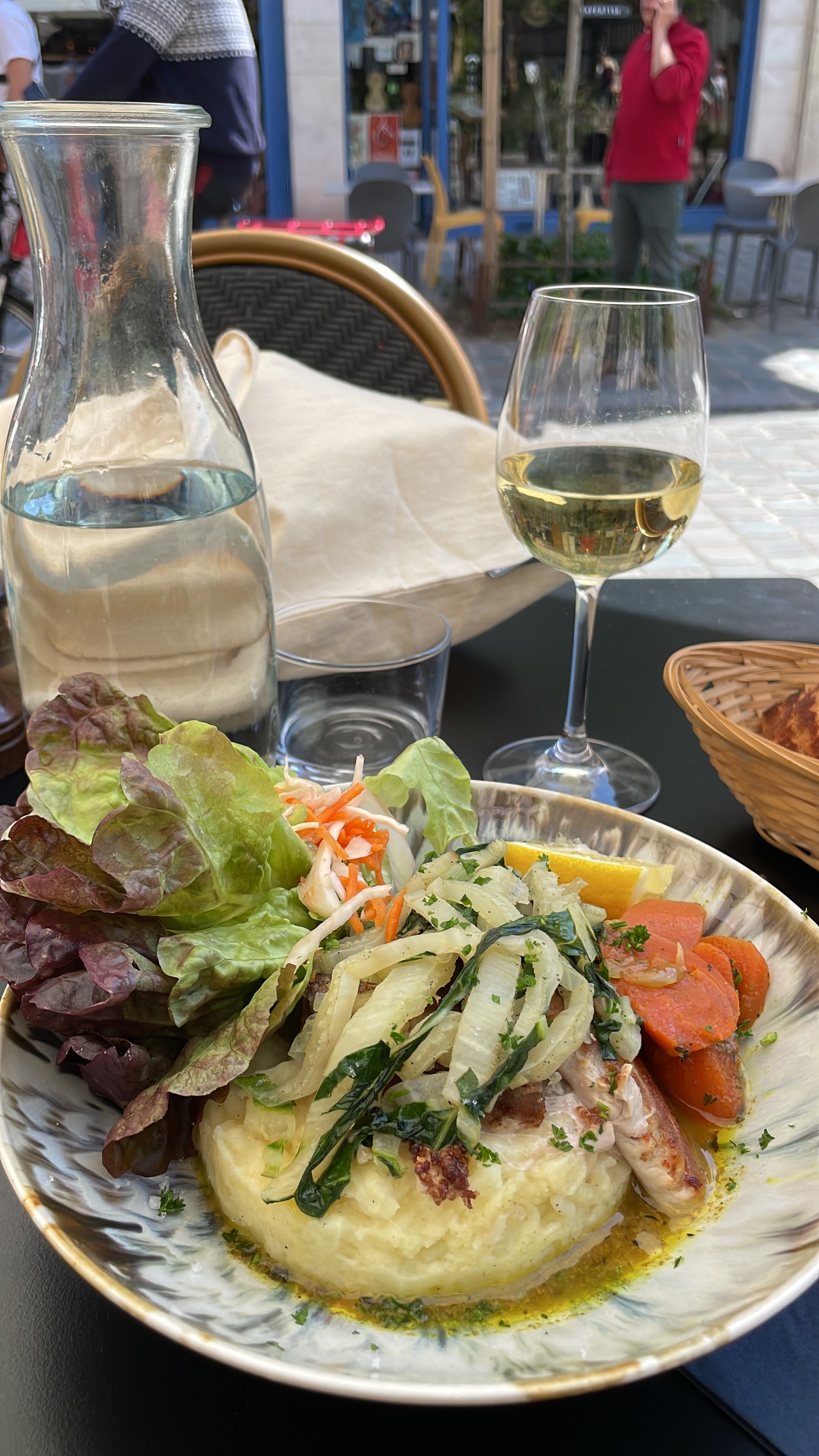 Nous avons adoré ce petit restaurant où nous avions réservé une table car leur carte nous avait plu lors de notre passage dans le quartier. Pas déçus ! Un accueil chaleureux, souriant, de bons conseils pour marier plat et vin. Entrée partagée car conséquente, plat de poisson avec une vraie purée de pommes de terre et du beurre fondu au milieu, comme à la maison, et un gâteau pommes-mirabelles exquis. C'est, de notre séjour ici, ce repas que nous retiendrons pour ses saveurs et son originalité.