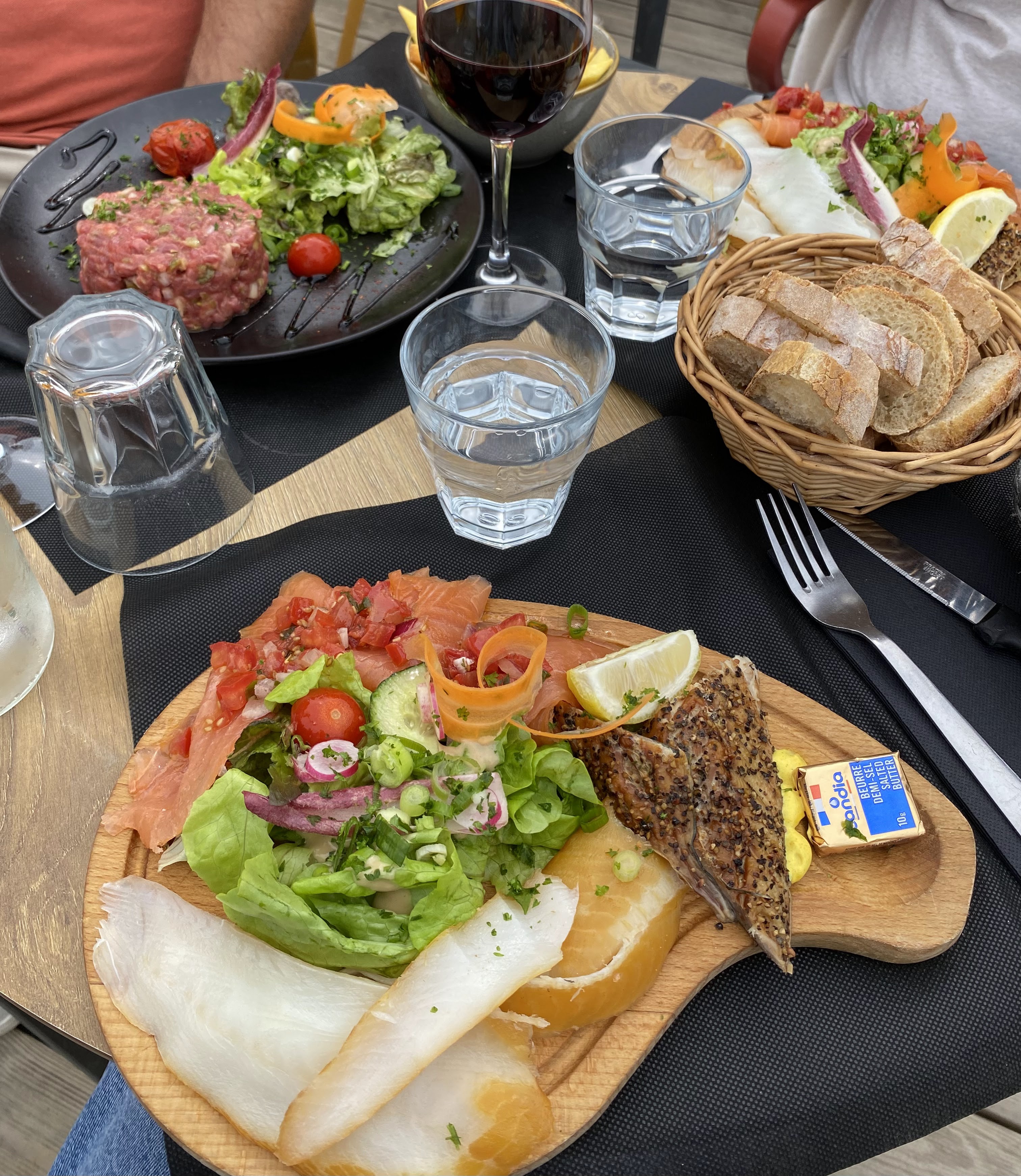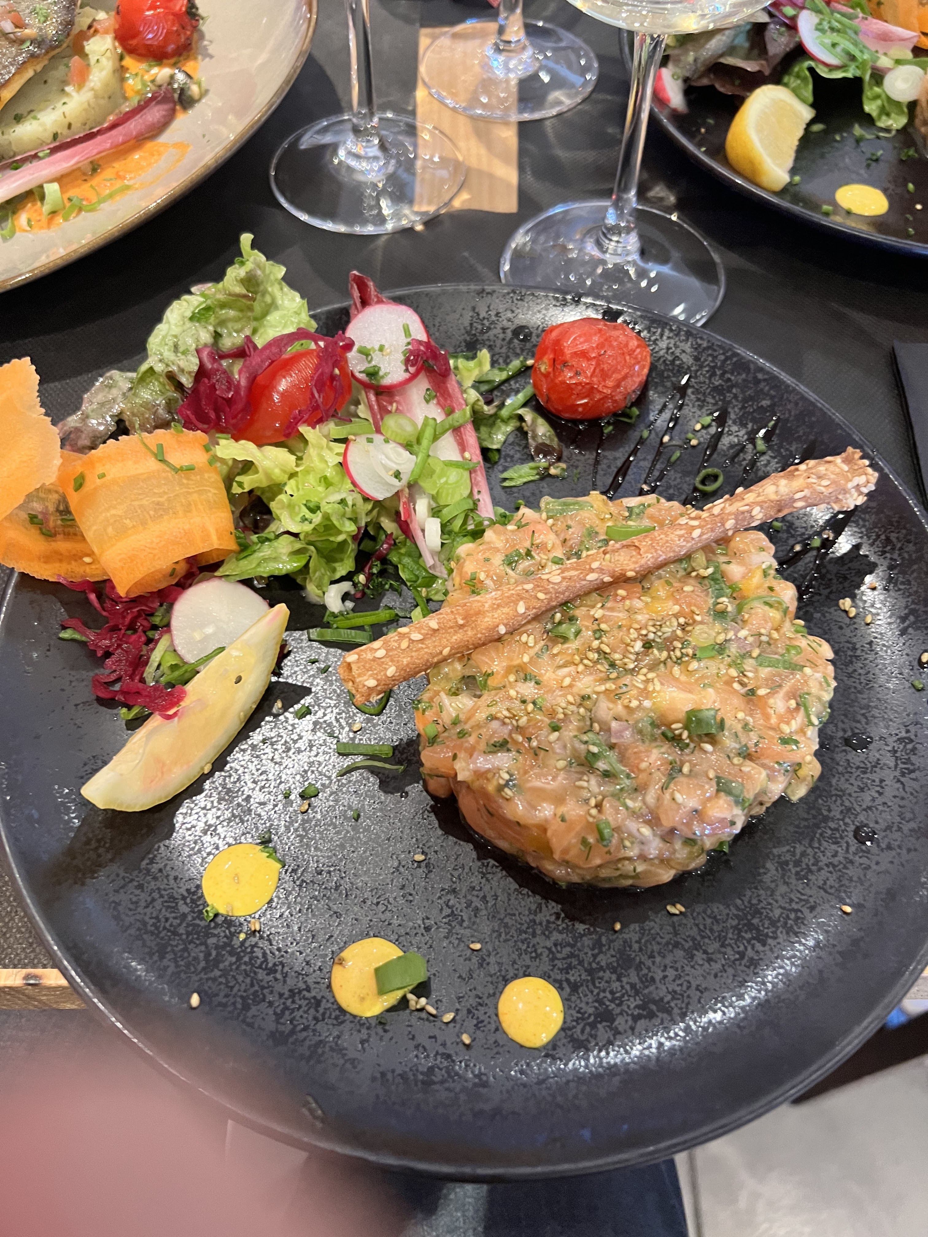 Que dire de l’accueil de la serveuse qui s’est occupée de notre table… le sourire, la gentillesse, la douceur, tout y était! Et pourtant nous étions à la sortie de la grosse période estivale et la fatigue devait sûrement y être. Mais nous ne l’avons en tous cas pas ressenti. Jusqu’à ce qu’elle apporte mon tartare de saumon… je n’ai alors plus juré que par lui! Fraîcheur, ajustement des saveurs, présentation, je ne risque pas d’oublier cette découverte moi qui était septique lors de ma commande quand au mélange des saveurs, ça reste un super souvenir! Une adresse que nous avons noté dans notre répertoire et que nous ne manqueront pas de très vite retrouver! On devrait savoir mettre encore plus d’étoiles!