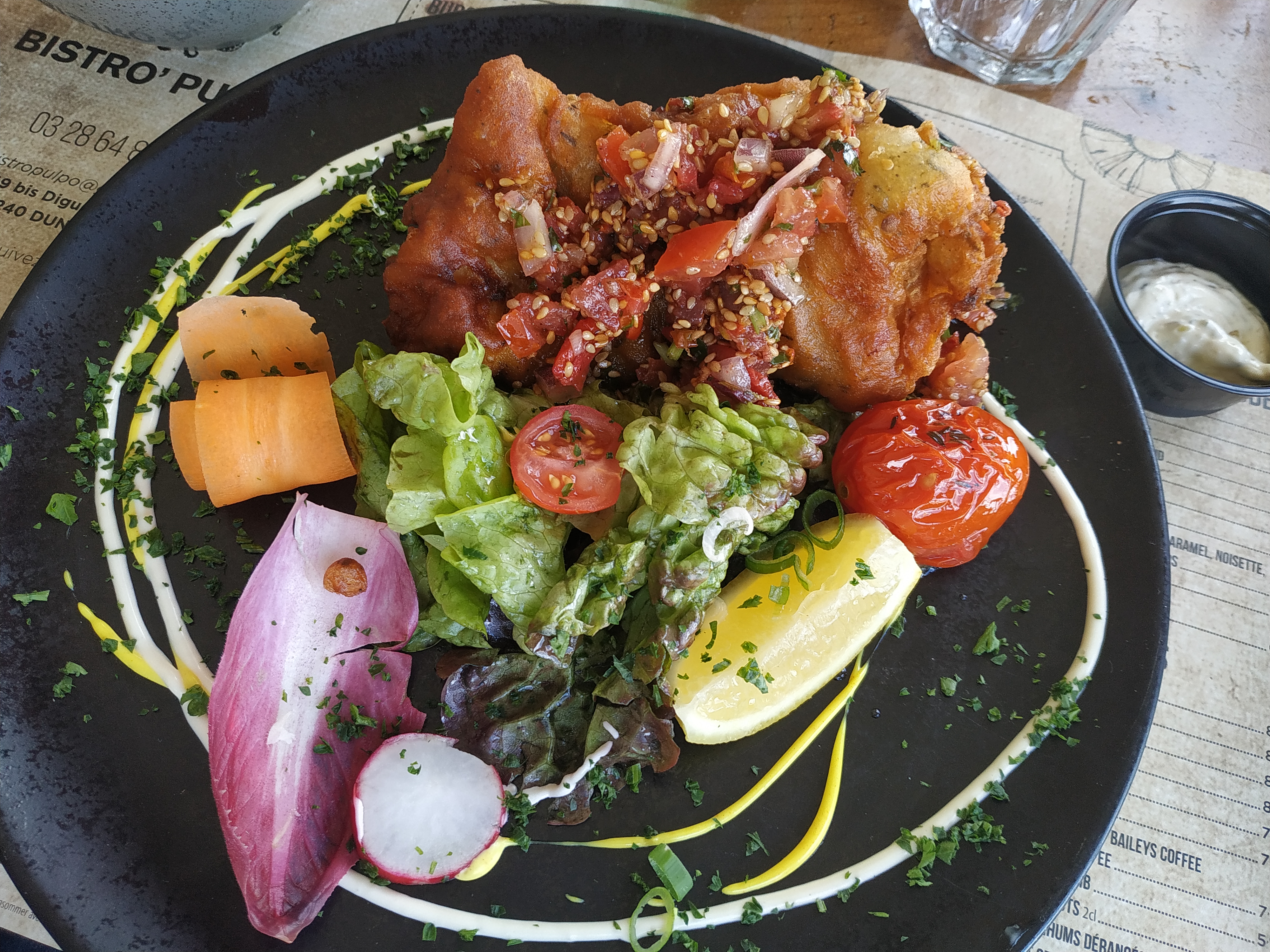 Sur les conseils d' un ami. Ce repas fut vraiment bon. La qualité et la quantité sont présentes avec une belle présentation comme vous pouvez le voir sur les autres photos. La carte a du choix. Petit bémol ce jour là, j'ai trouver le service un peu brouillon ( le restaurant était bien rempli ) mais par contre vraiment très agréable. L erreur sur la taille de ma bière a été excusée et on m'a bien servie en 2 fois ma 50cl . Si vous voulez manger de la qualité, foncé ! Cest vraiment bon et les prix ne sont pas excessif.