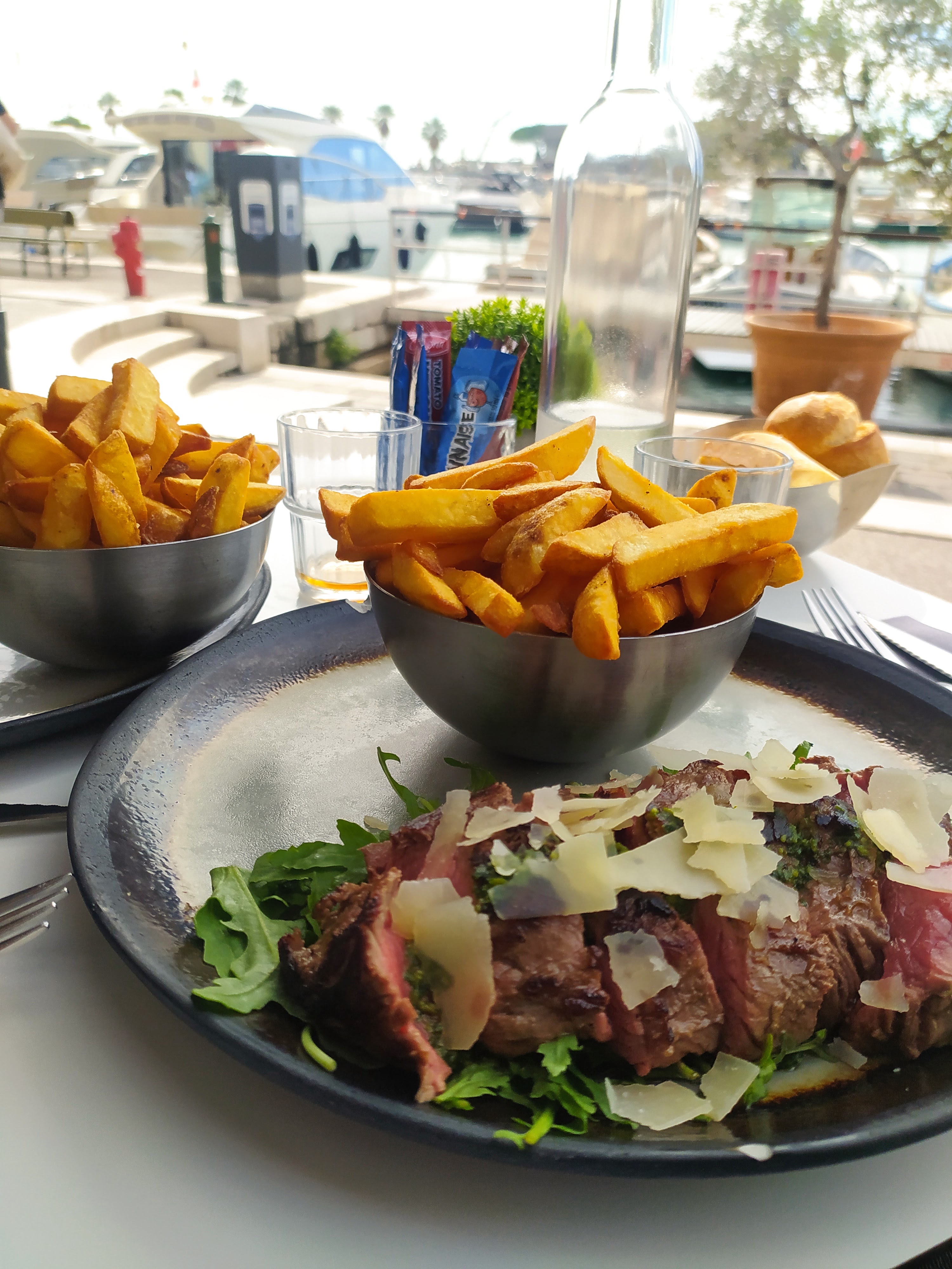 Je ne sais pas si tous ces beaux commentaires sont dues au superbe cadre du port et à l'euphorie des vacanciers, j'ai du mal a comprendre. Les prix sont très élevés, 17 euros la «Pièce du boucher» pour se retrouve avec un minuscule morceau du viande qui ne calerais pas un enfant de 5 ans, une toute petite poignée de frites et deux tranches de salade. On a l'impression de déranger la serveuse à la moindre demande. Point positif, les frites sont faites maison mais la portion est tellement ridicule qu'on les fini en 1 minute.