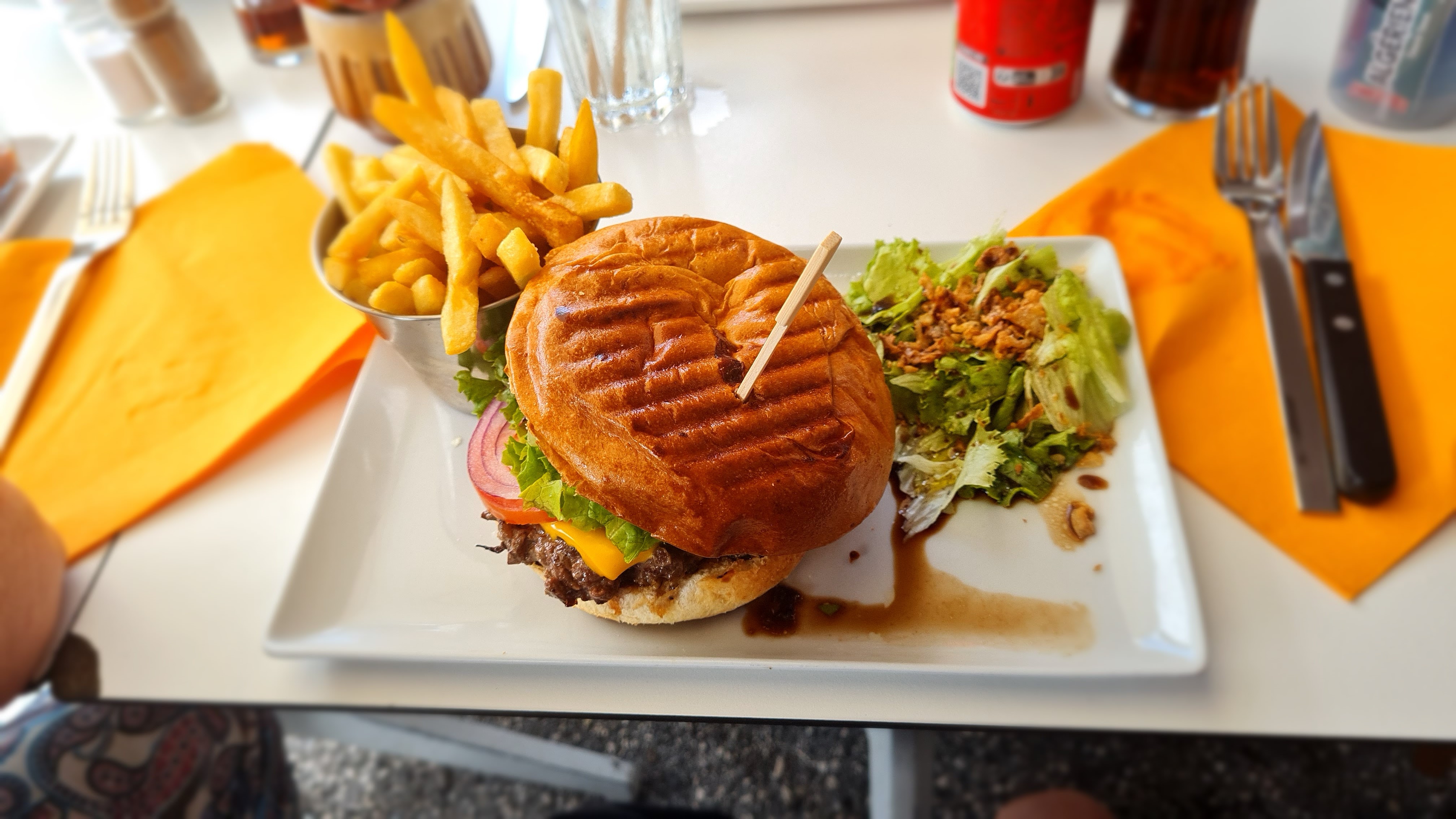 Burger simple mais efficace, frites excellente légère pas grasse du tout et bien croustillante, service moyen ambiance idem