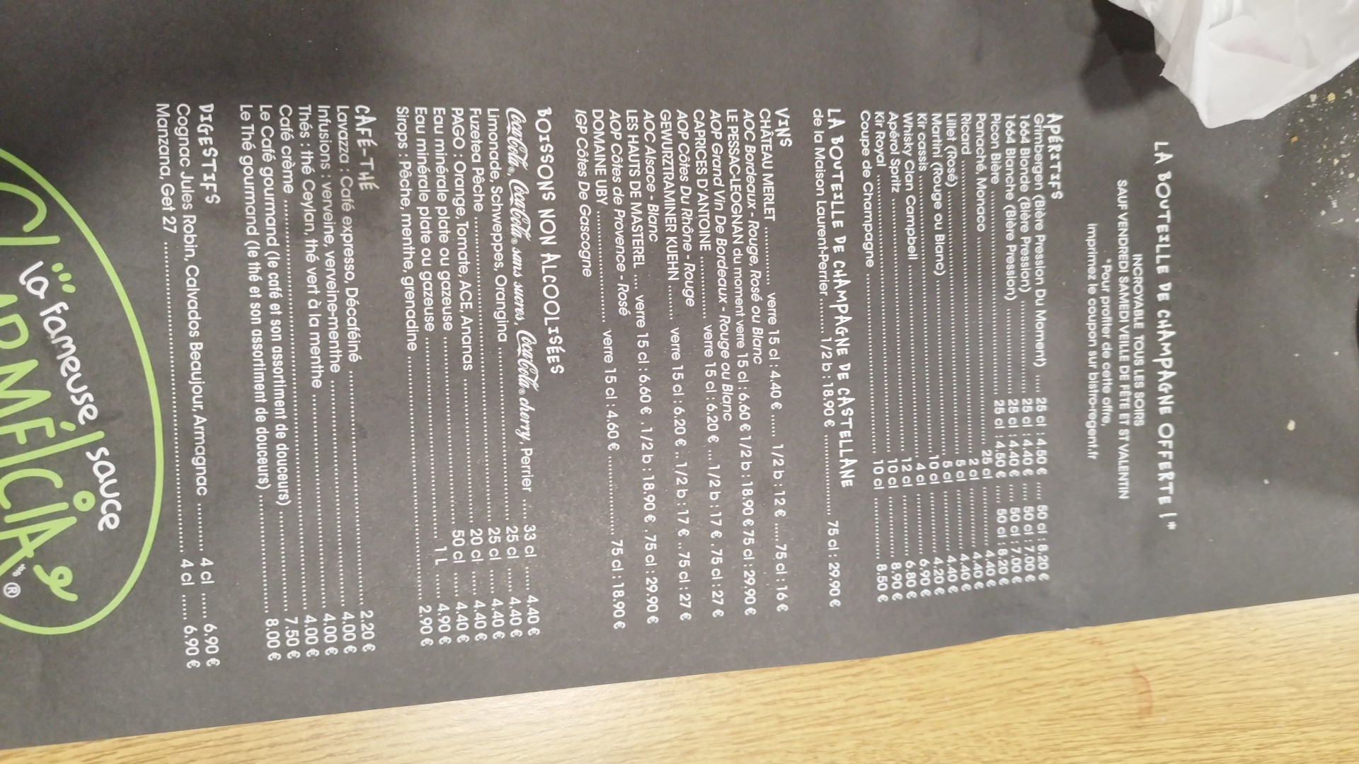 « quand il n’y a pas un grand menu c’est que cela dois être frais » en tout cas la pièce de bœuf grillée était bien meilleurs qu’un buffalo grill, accompagnement à volonté de frites allumettes fraîches, café gourmand copieux, restaurant propre et agréable pour passer un bon repas en famille.