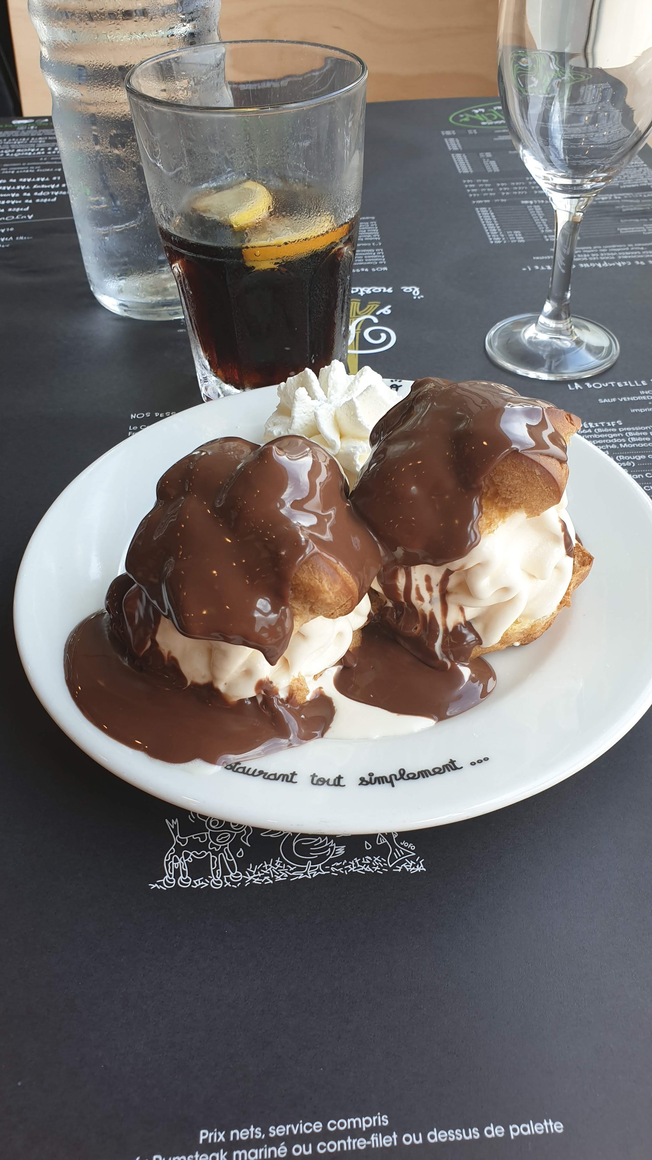 Viande rouge pas terrible, baignant dans une sauce (la même que pour le saumon). Les frites sont bonnes, les profiteroles par contre c'est une mauvaise blague. Ce n'est en rien des profiteroles, Simplement 2 chouquettes coupés en deux, pleines de glace vanille pas terrible, de la chantilly et un peu de chocolat. Bref rien d'exceptionnel. Par contre j'ai été choquée de voir que 0 membre du personnel avait le masque.