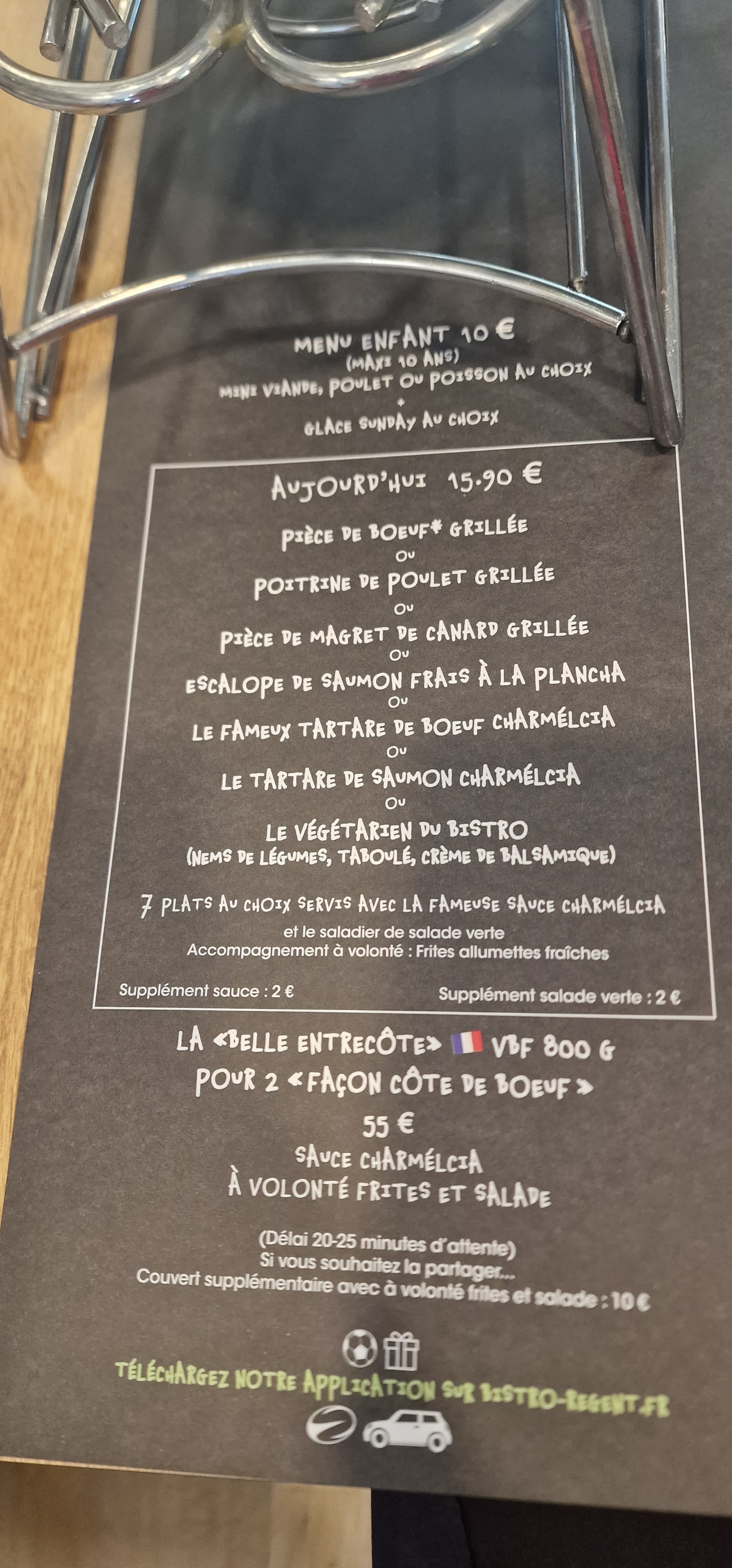 Simple et Rapide ! Menu à 13,90€ avec le choix de 5 plants (viande ou poisson) et frite à volonté, le tout accompagné d’une petite salade verte qui peut être doublé ! Pas d’autres plat ou légumes ! C’est la que c’est dommage, le principe de la simplicité a ses limites car aucun légumes de proposé ( hors la salade incluse) . Autre petit bémol propre à ce restaurant : attention, il fait froid le soir, surtout dans la zone à droite de l’entrée !