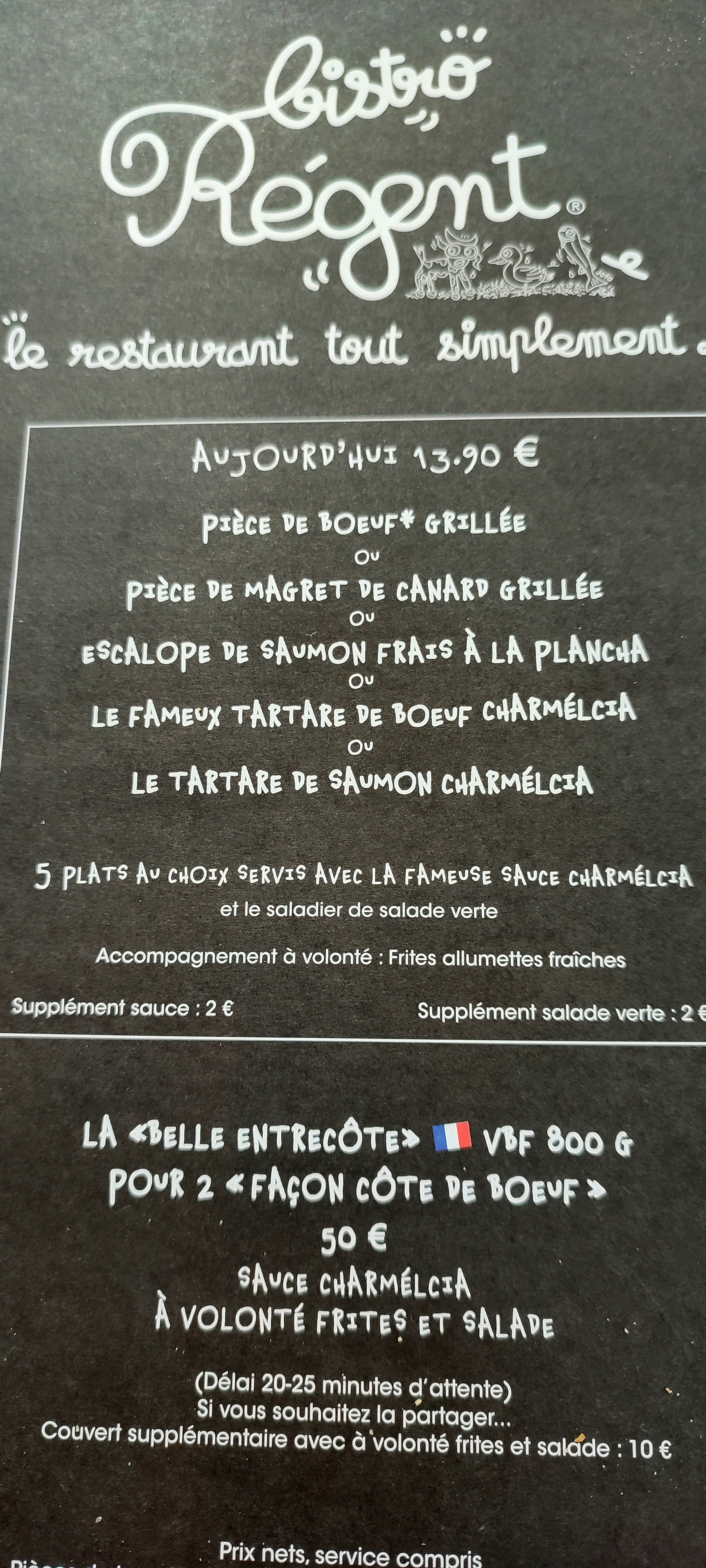 A éviter … Étant une ancienne serveuse d’un autre Bistro Régent, je peux vous dire que celui-là est déplorable : dès le début de service pas de papier dans les toilettes, ni de savon, pas de lumière non plus, chasses cassées et pas de table à langer (pourtant il y a de grands toilettes et c’est un restaurant familial). Nous avons dû demander 3 fois pour avoir un réhausseur pour notre bébé. La magret de canard n’était pas bon (très mauvaise odeur et goût abominable, nous pensons qu’il était périmé ou mal stocké), et sans parler qu’il était trop cuit alors que nous avions demandé rosé. Nous l’avons renvoyé en cuisine et nous en avons eu un autre pas cuit. Les frites étaient trop cuites. Les salières et poivrières étaient dégoûtantes et quand j’ai demandé du sel nous en avons eu une salière avec 10 grain dedans (ce n’est pas une façon de parler). Un staff débordé et aucune organisation (peut être qu’il manquait un ou des serveurs mais c’était vraiment le bordel). Aucune hygiène, pas de carte du menu à l’entrée, pas de carte de la provenance des viandes et poissons. Bref, un service et un restaurant catastrophique (je vous passe tous les détails). Les règles de l’enseigne ne sont pas respectées. C’est une honte pour cette enseigne qui est pourtant géniale ! Et que je recommande a 100% normalement.