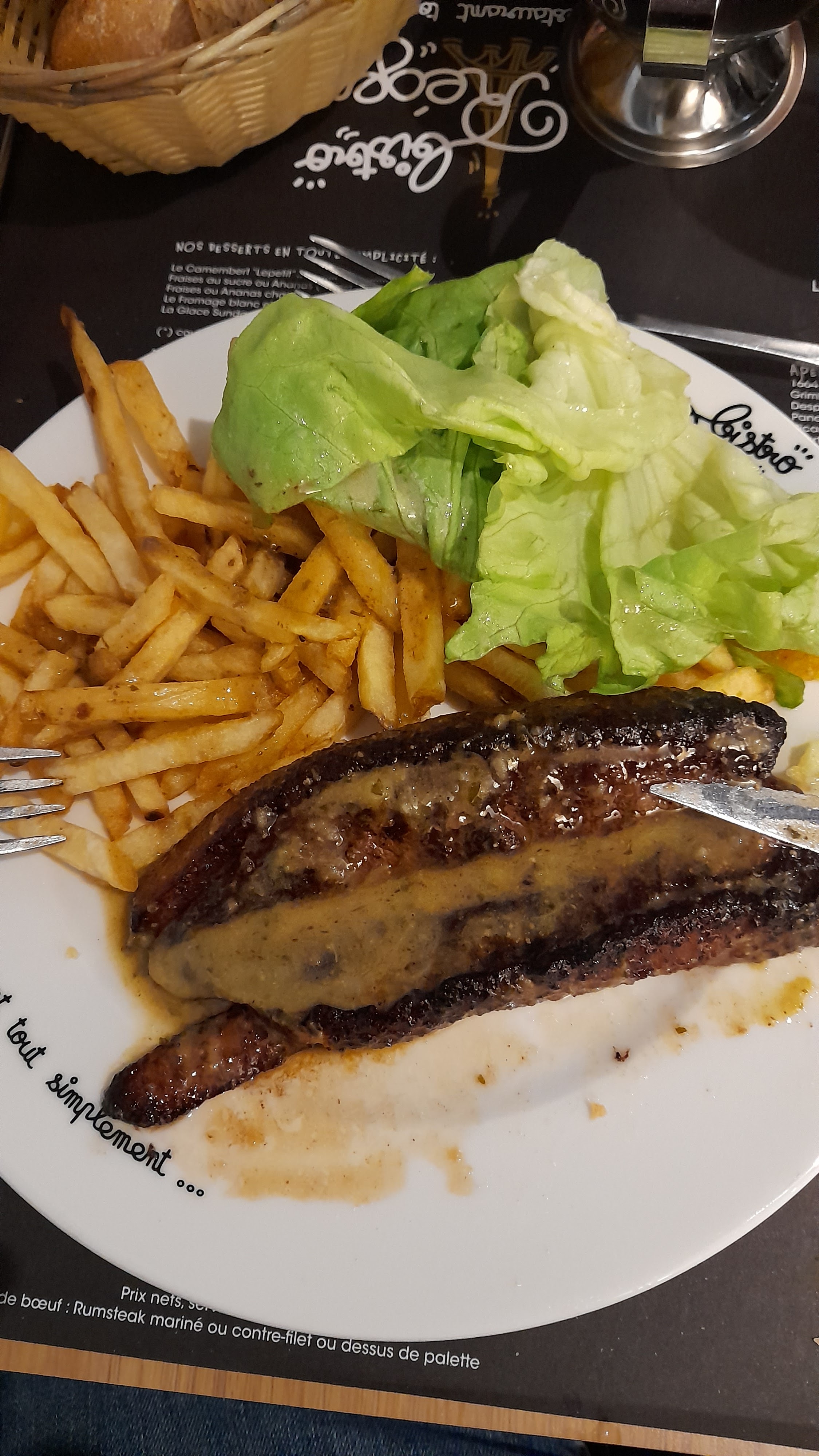 Suggestion pour améliorer la formule viande plus frites à volonté avec la sauce charmelcia. Servir la viande tranchée. Les frites semblent être des surgelés... sinon c'est le bon prix 13,90€.