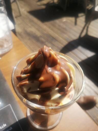 Super accueil avec le sourire. Un vrai plaisir d'être servi par Nawel 🤗, service rapide et efficace, au top. Nous avons pris le tartare, il était bien relevé et de qualité. Les frites sont bonnes aussi. Mes deux garçons ont bien aimés le saumon. Petit regret sur les desserts, notamment les glaces, les profiteroles et même les coupes sont réalisées avec la glace sundae, ce n'est pas une réussite. Pas de goût, et notre fraise melba s'est très vitre transformée en soupe (cette glace sundae fond extrêmement vite et est sans saveur, elle contient énormément d'eau), pour le coup je ne l'ai pas vraiment appréciée. Nous aurions tous les 4, préférés de la vraie glace, onctueuse, crémeuse et goûteuse. Du coup je mets quand même 4 étoiles malgré la grosse déception sur les glaces. Si elles auraient été à la hauteur et délicieuses je serais passée à 5. C'est tellement dommage de finir un repas aussi sympa sur une note si négative.