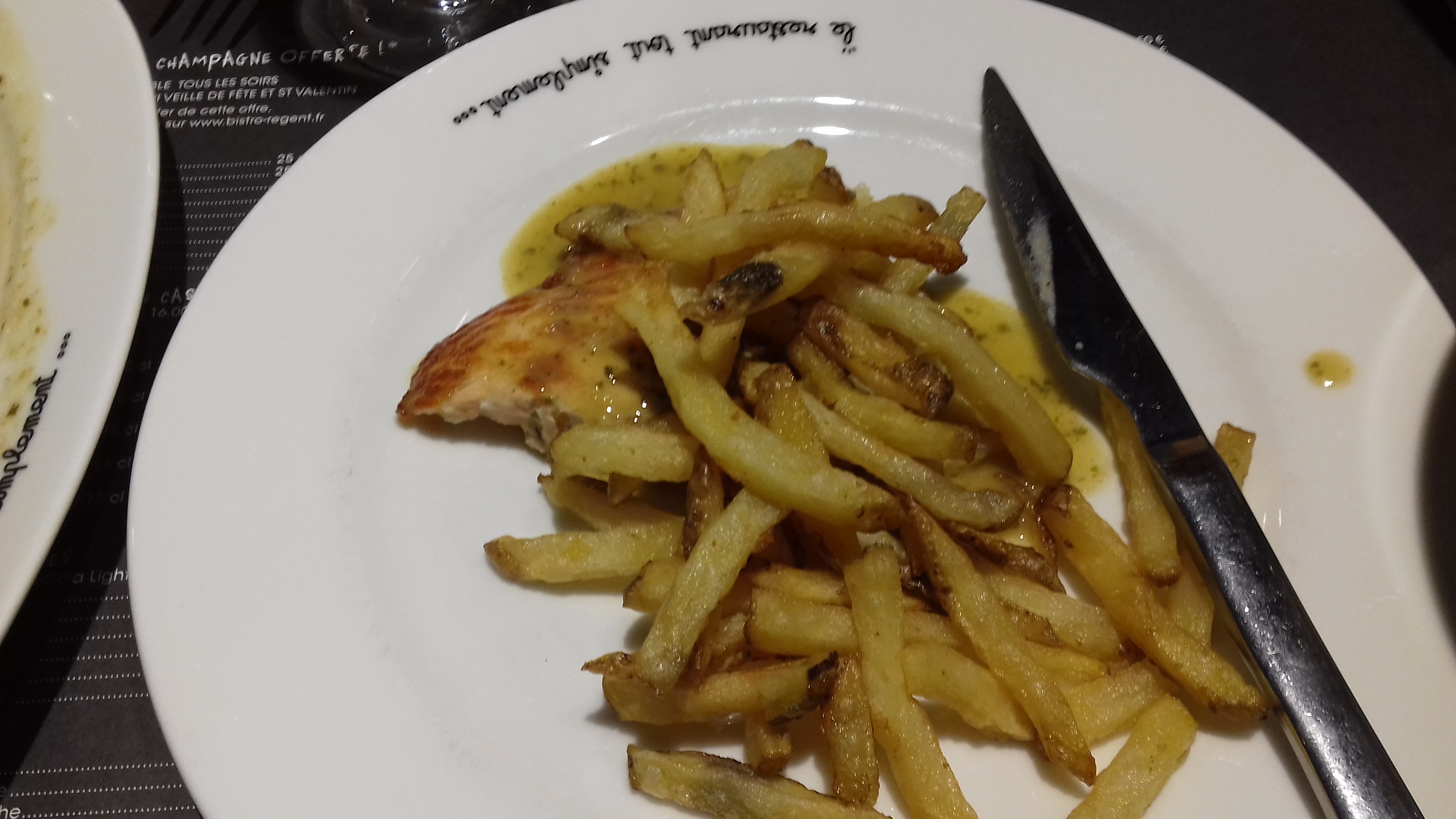 Une fois arrivés au restaurant, il est affiché sur la carte que nous pouvons bénéficier d’une bouteille de champagne offerte, mais cela nous a été refusé car il faut présenter un bon imprimé (le télécharger ne suffit pas), ce qui est infaisable une fois déjà arrivés. Et malgré une grande table, n’ont pas été commerçants.