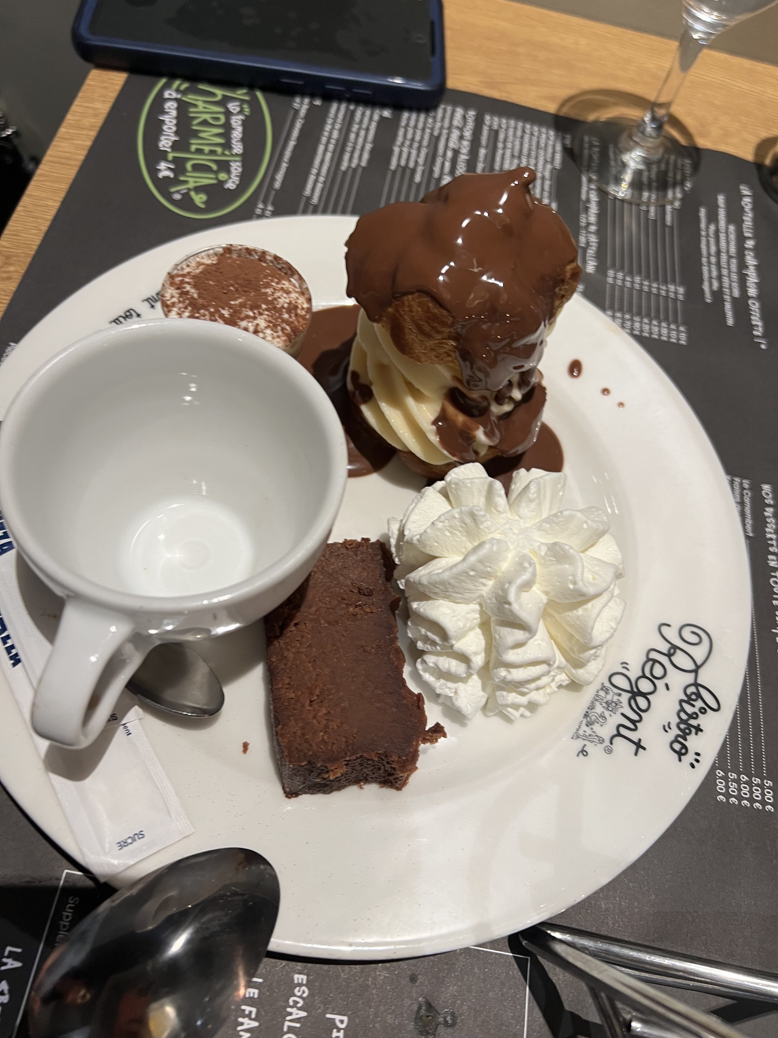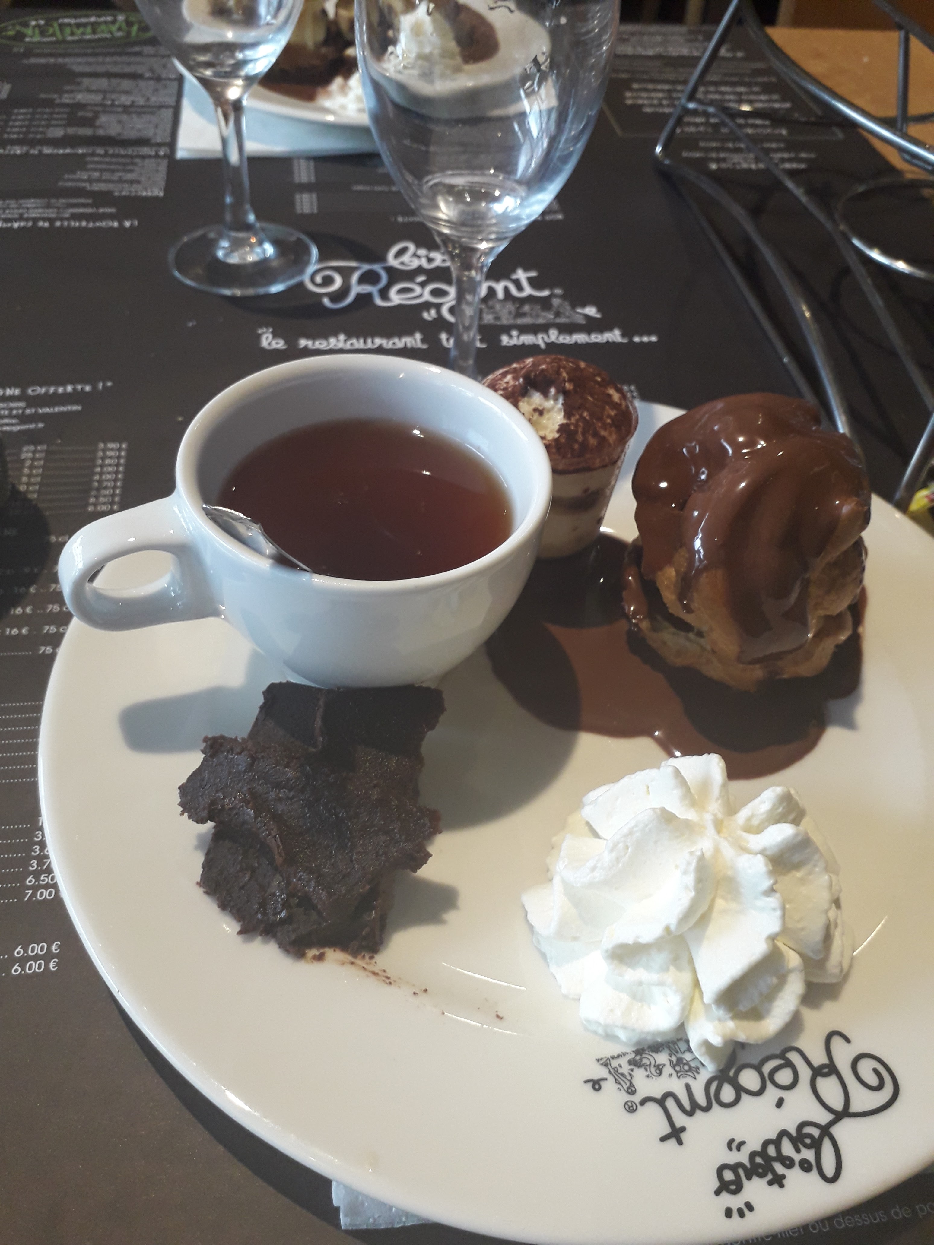 J'avais pris une profiterole en dessert hormis le chou au goût d'ostie et à la texture de chewing-gum mention toute particulière à la glace. La pire glace à la vanille que je n'ai jamais mangée !