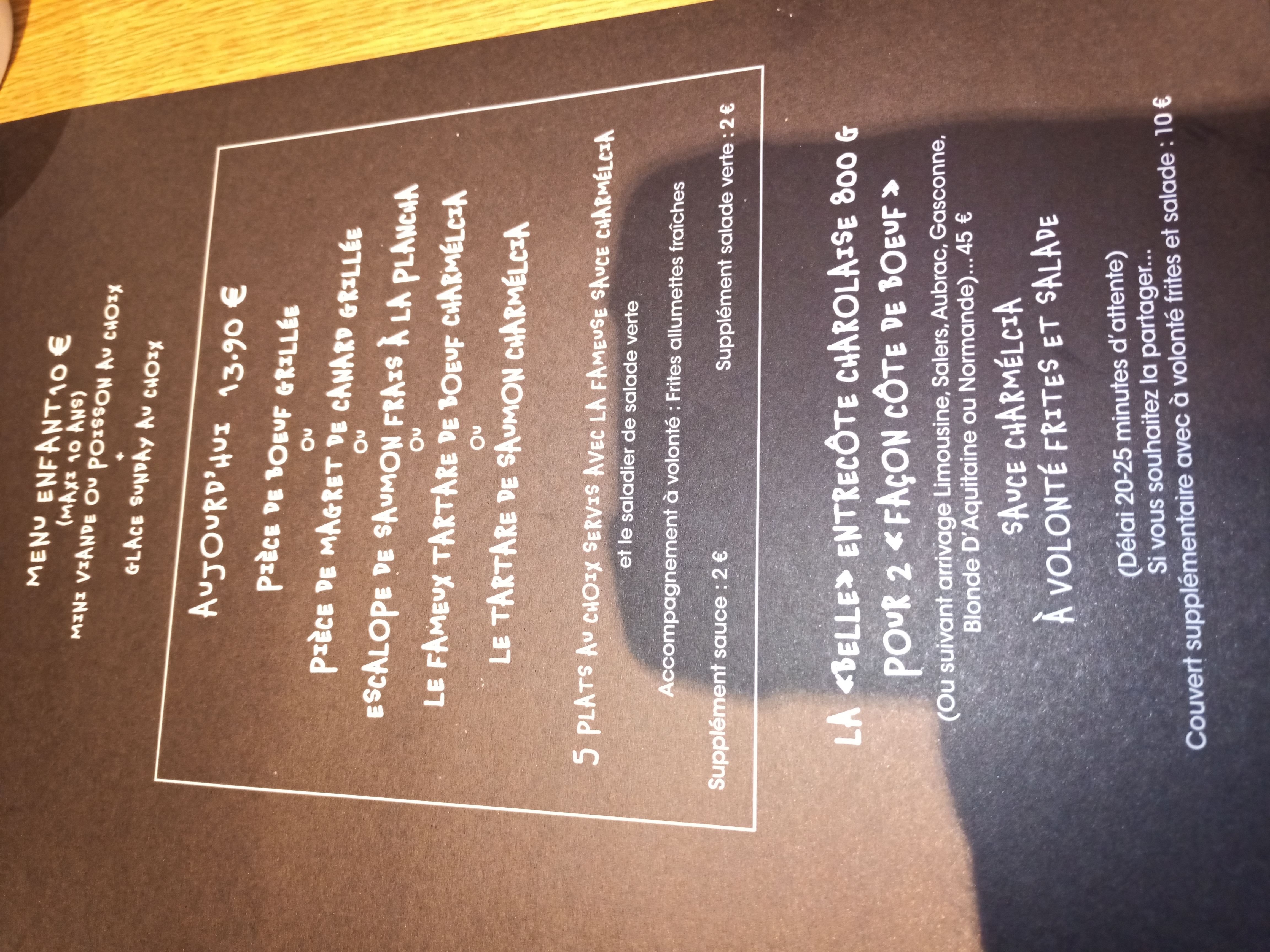 Le restaurant propose à 14, € 90 un choix, nous étions 3 moi j'ai pris un tartare de saumon très bon, la 2ème personne à pris une viande de bœuf très tendre, la 3ème magret et on c'est vraiment régalé avec 1 saladier de salade et un autre de frites. C'est très de proposer pas une immense carte mais du bon.