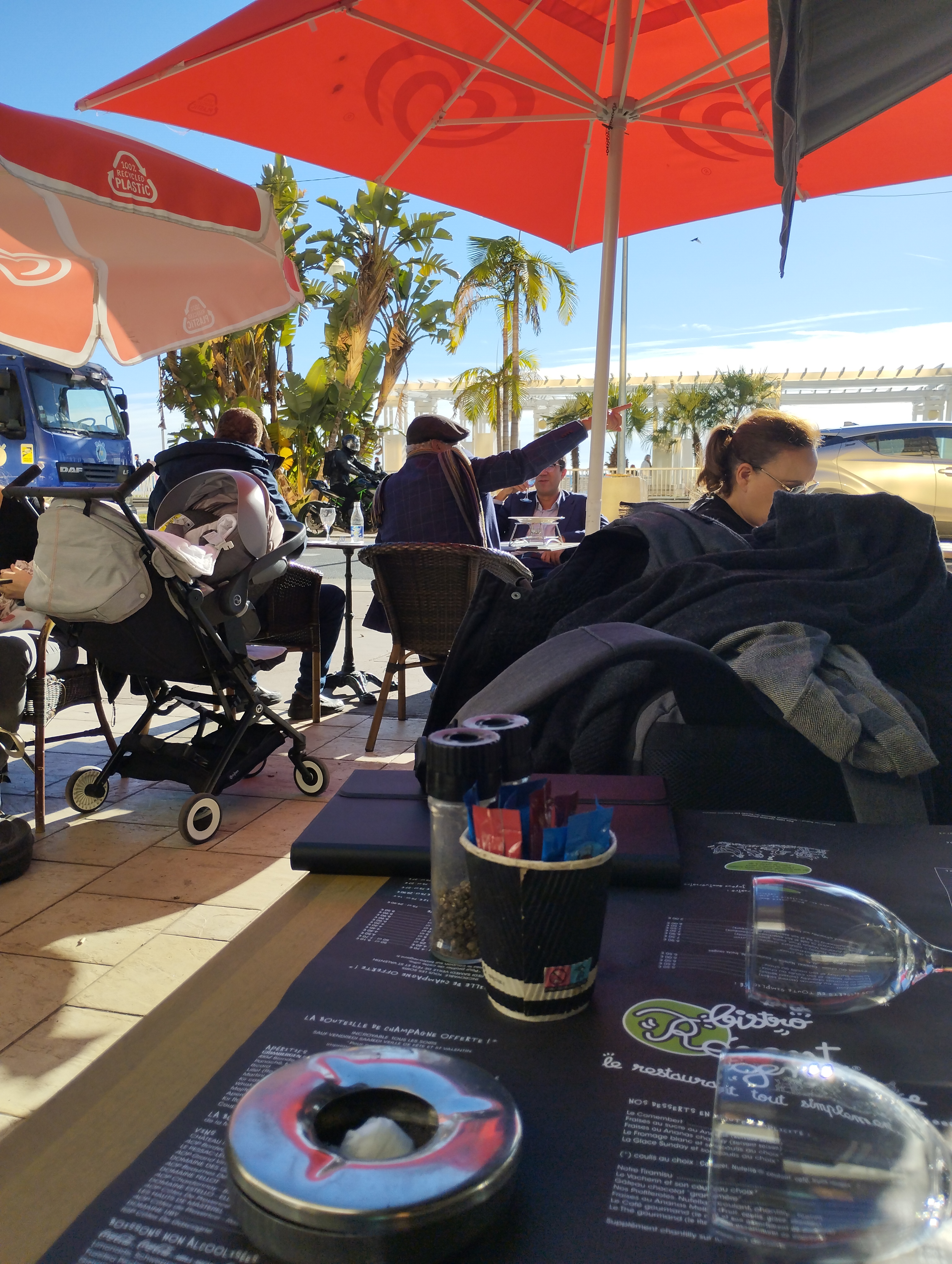 Restaurant à éviter Certes il est situé sur la promenade des anglais mais ne voit pas la mer car on est du mauvais côté Les plats ont l air industriels On ne nous donne pas de couteau à viande car ils n en n ont pas assez pour tous Et donc difficile de couper le magret Salade servie provient d'un sachet de salade Seul le tiramisu est bon