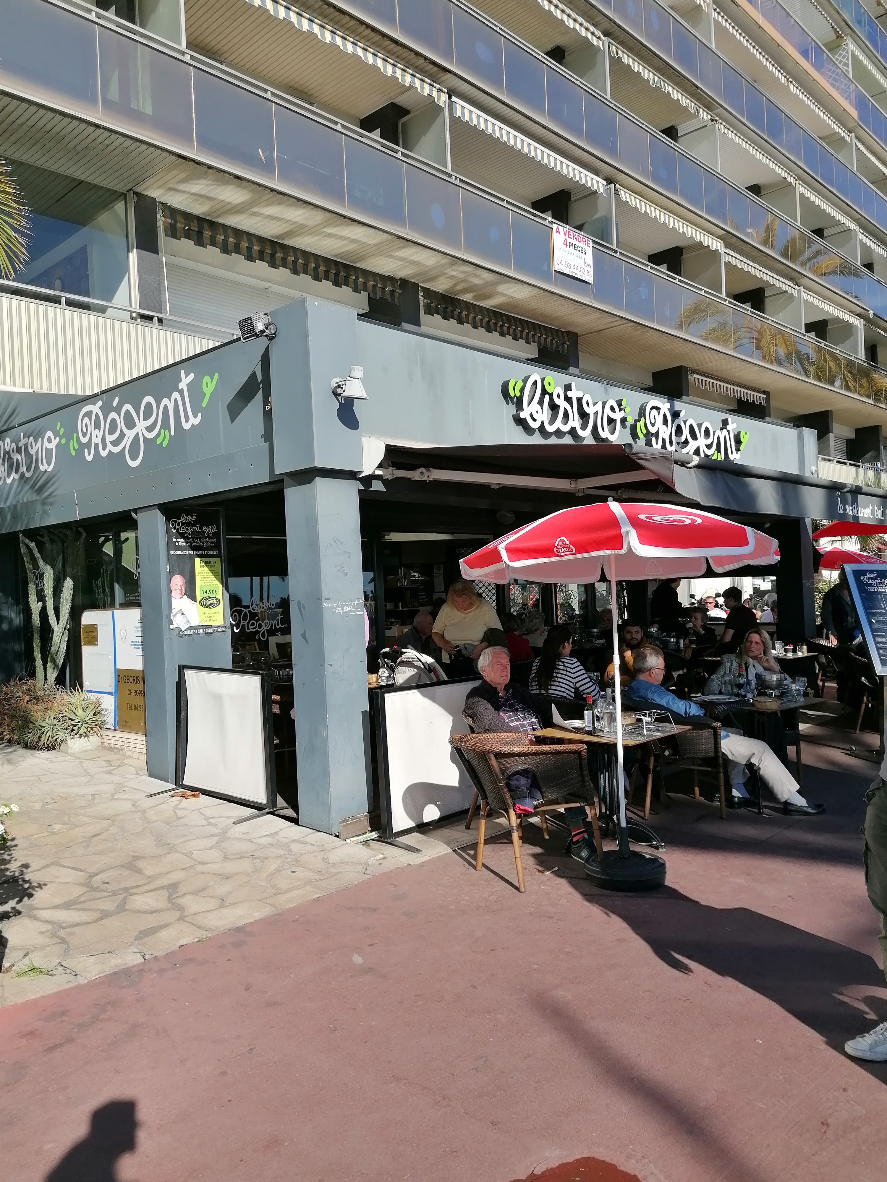 Étant un grand fan de la chaîne bistro régent , ayant fait celui de pessac , eisynes, victoire, talence, Toulouse, Aix en Provence, annecy, Tour celui de Nice était vraiment déplorable. Les viandes sont froides, pas à la cuisson demandées, nous devons nous même nous lever pour redemander des frites… la terrasse est dans un état pitoyable. Le vin n’a pas été ouvert devant nous , sûrement du vin en cubi mis en bouteille vu l’état des étiquettes. La porte d’entrée est ouverte à coup de pied par le responsable et fume la cigarette électronique à l’intérieur. Aucune indication pour les toilettes , pour votre information ils sont tout au fond dans le noir. Seul point positif, l’état des toilettes et les brosses à dents à 2 euros sont proposés dans les toilettes.