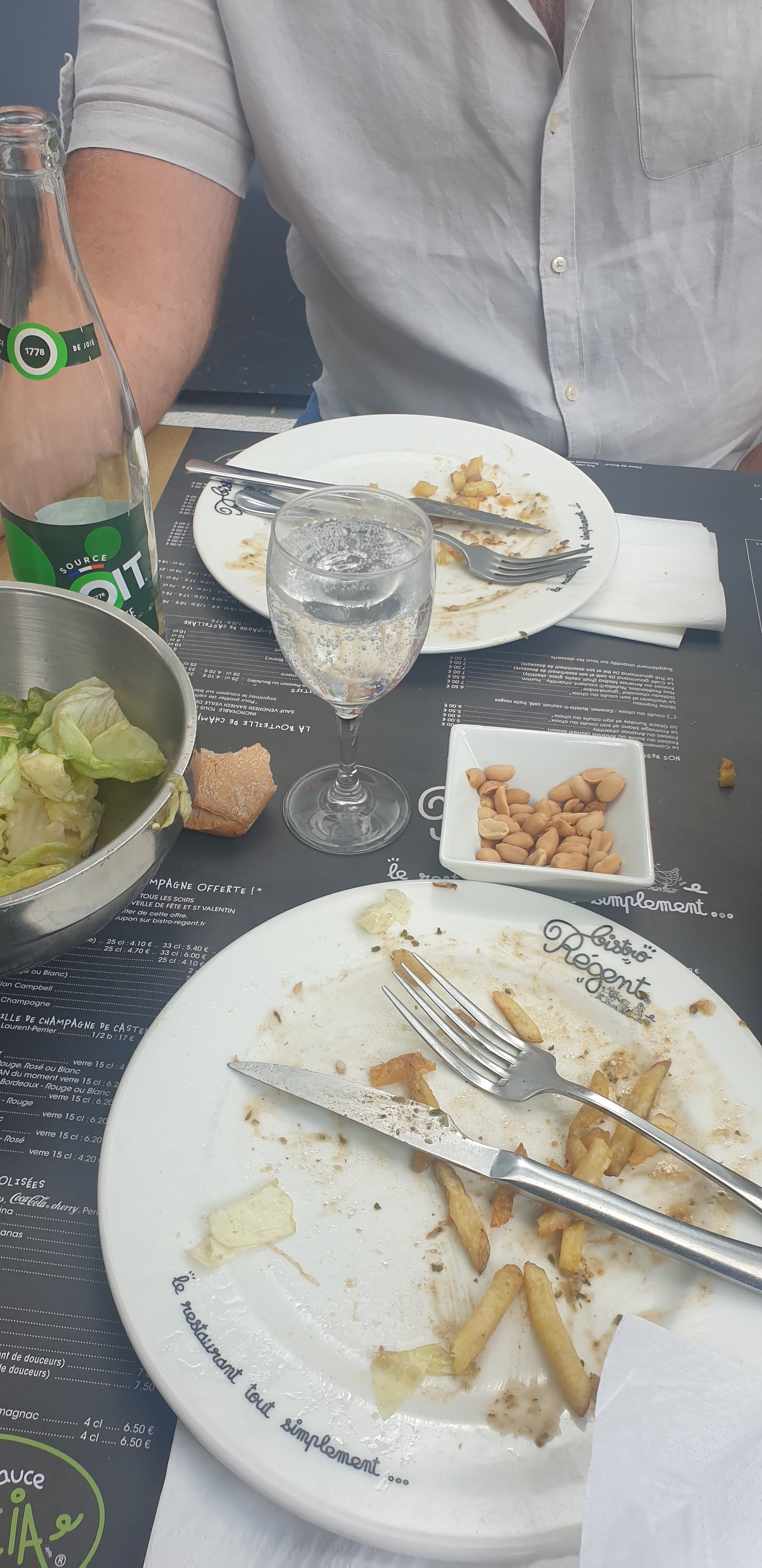 UN VERRE POUR 2 Très déçue pour notre premier déjeuner dans ce bistrot. On prend un apéritif qu'on nous sert rapidement accompagné de quelques cacahuètes. Pas le temps de boire 2 gorgées qu'on nous ramène notre plat, servi avec des frites froides et nos 2 viandes dans le même plat alors qu'elles étaient différentes poulet pour moi et boeuf pour mon mari. Surtout que la table d'à côté à eu le droit à 2 assiettes différentes. On nous amène un seul verre pour une demie pétillante ??? Y aurait pas un problème ??? On boit donc dans le même verre et cela ne choque personne, je demande à mon mari une deuxième tournée de frites, mais les serveurs jouent à cache cache, mon mari arrive tout de même avant que je termine ma viande tiède a en choper un au passage. Les cacahuètes nous ont accompagnées tout le repas ainsi que les verres apéritifs. Je ne recommande PAS DU TOUT. Le seul point positif est la sauce qui elle est excellente, mais est-ce que cela vaut le coup quand on subit son repas ??? Je ne crois pas non.