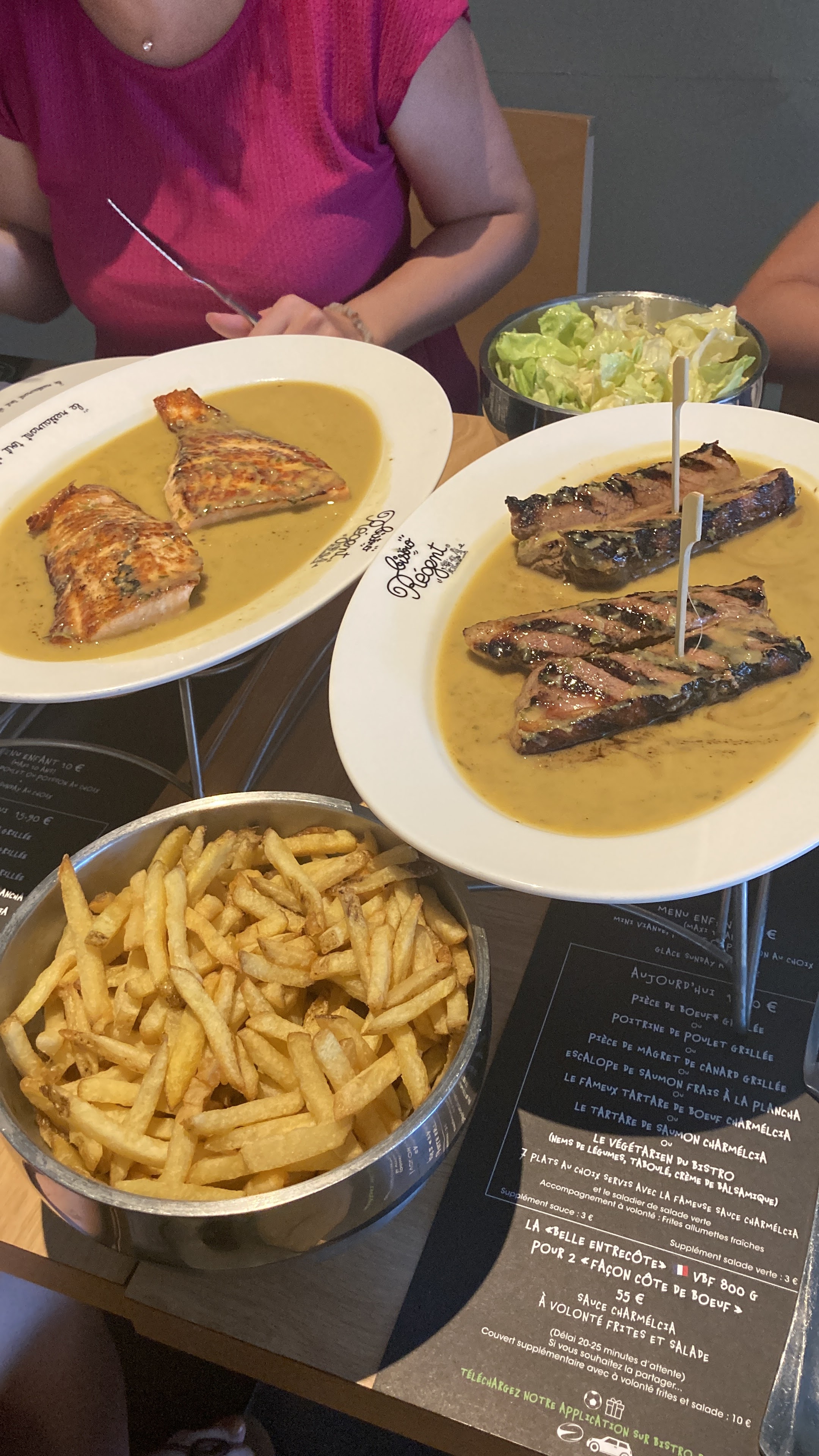 Piece du boucher dure , saumon excellent , frites nulles trop cuite tiramisou nul que de la chantilly et très peu de biscuit ('indigeste) par contre sauce excellent et la salade verte , je pense ne plus revenir dans ce restaurent