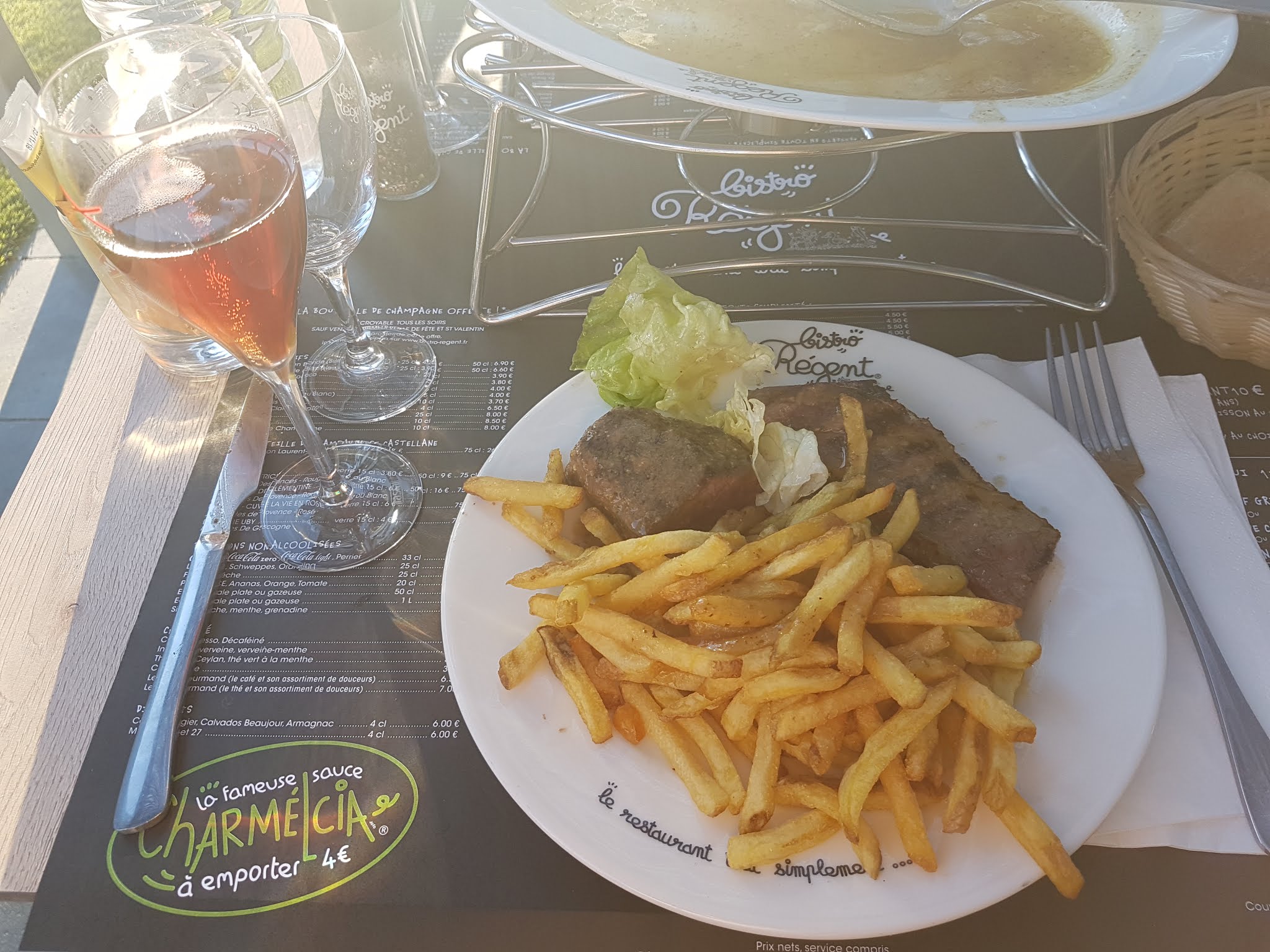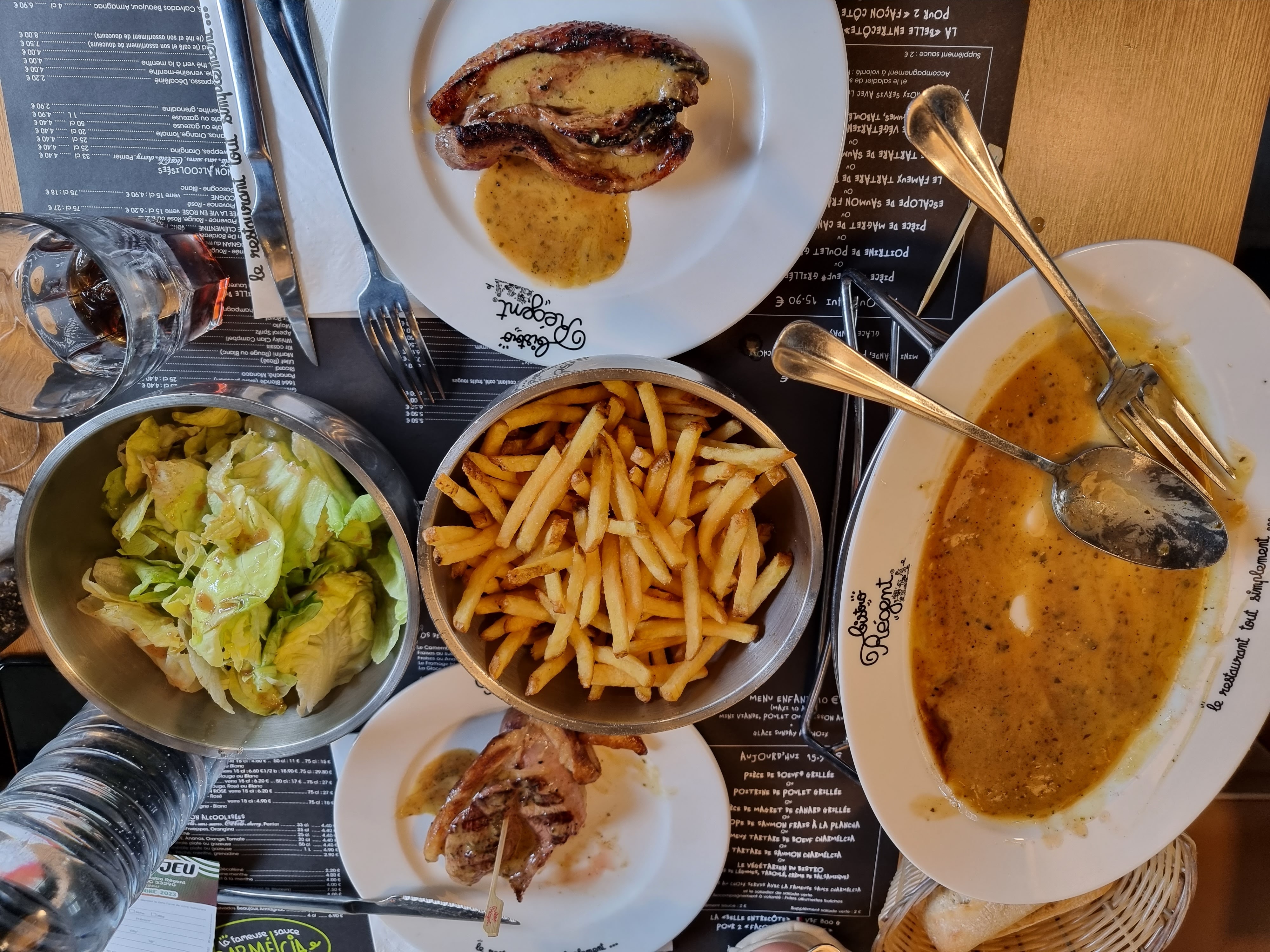 Bon passage au Bistro Régent de Aix-en-Provence. Nous sommes passés pour diner et on apprécie la présence d'un parking gratuit à proximité immédiate. L'accueil sur place est rapide et nous avons été servis rapidement. Le menu à 15€90 midi et soir est intéressant bien que les portions puissent être limites pour les gros appétits. Bon point pour les frites à volontés, dommage que ce ne soit pas le cas pour la salade. En bref, une bonne adresse dans le secteur pour manger à prix raisonnable. A essayer.