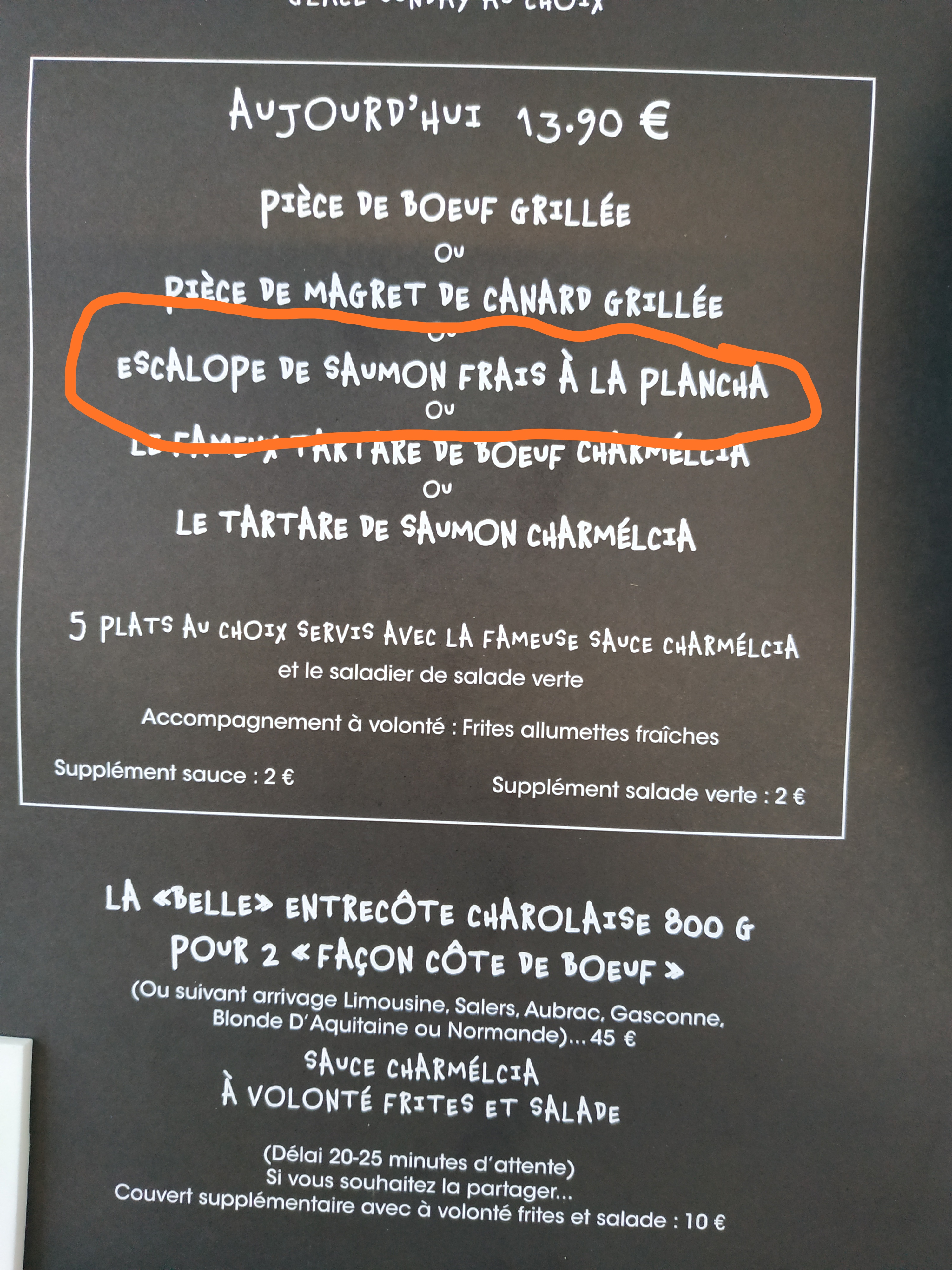 Il faut aller dans cet établissement en connaissance de cause. Certes les choix sont très restreints (3 viandes 2 poissons et un seul accompagnement) mais permettent une qualité certaine. Je mets un petit bémol quant au choix des accompagnements et des sauces. Il est vrai que si la sauce charmelcia ne contentent pas vos papilles, ça risque d'être embêtant car aucune autre n'est proposée même avec un supplément ( personnellement je trouve qu'elle se marie bien avec le poisson, mais ça ne va pas du tout avec la viande). Même remarque pour l'accompagnement frites salade, aucun autre légumes ou accompagnement proposé, ce qui limite les combinaisons... Du coup, on va y manger une fois, deux fois, puis on va se lasser. Dommage ! En outre, personnel très sympathique, mais en sous effectif. Deux serveurs un samedi soir, c'est trop juste. Conclusion : bonne qualité, bonne ambiance, rapport qualité prix très intéressant... Mais il manque un petit roulement sur la carte pour varier accompagnements et sauces, et donner l'envie à chacun de revenir avec la surprise de se dire tiens tiens, avec quoi je vais bien pouvoir combiner la viande cette fois ci ? ...