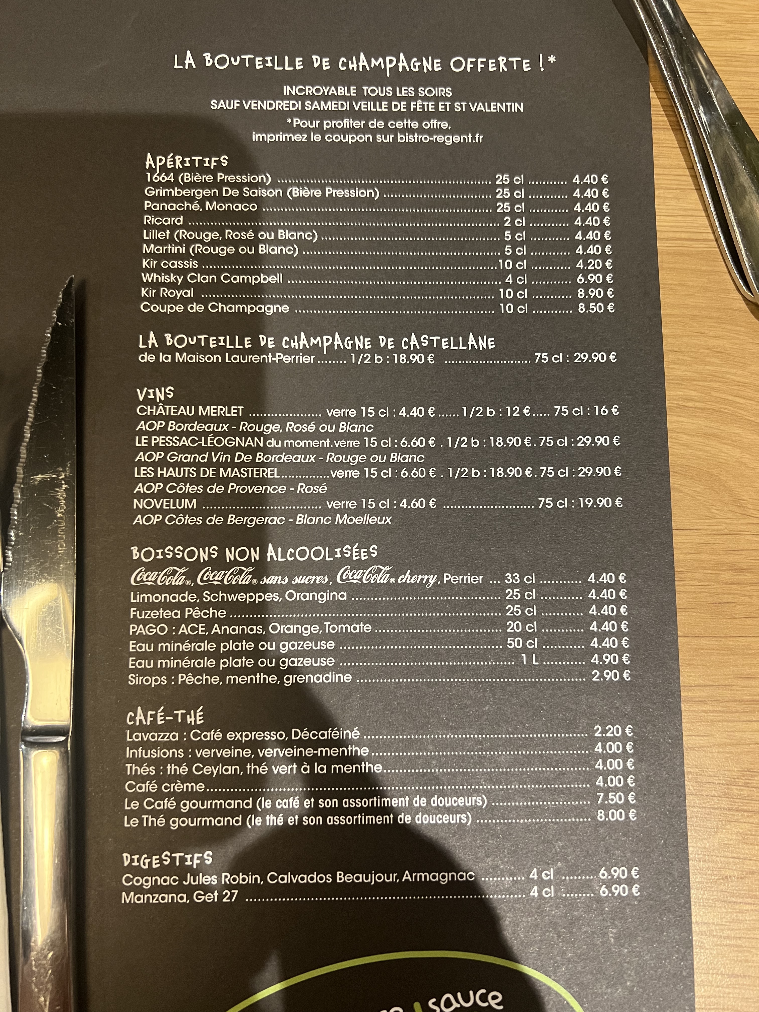 Qualité moyenne par rapport à d'autres bistro regent. Serveur qui débarrasse avec un grand sac poubelle à la main, c est bof.