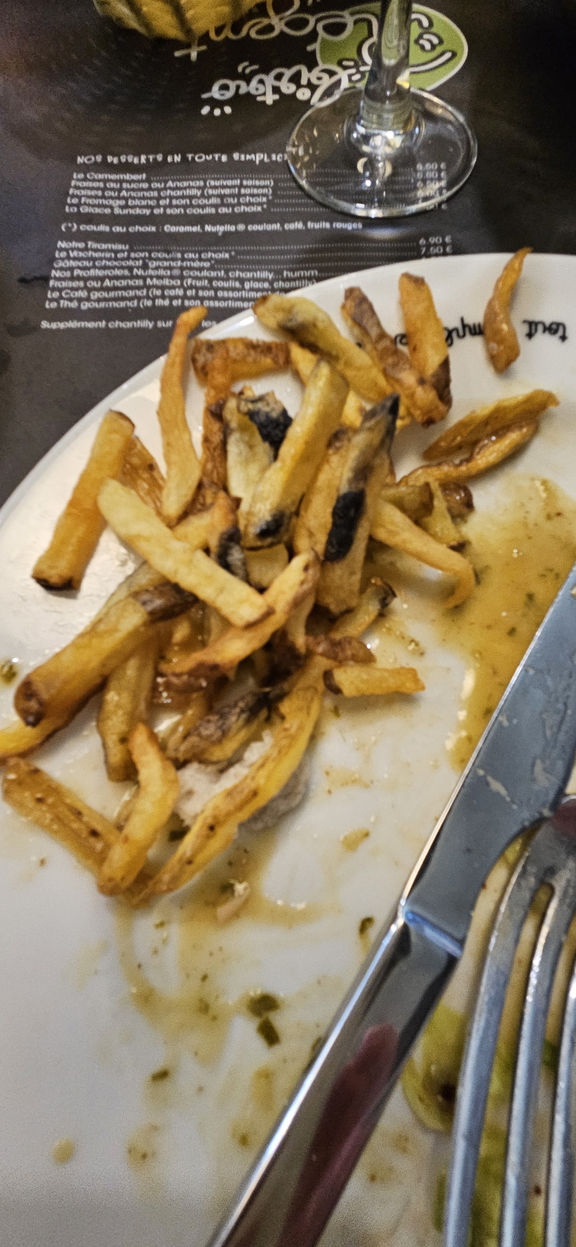 Frites sèches car beaucoup trop cuite. Sauce viande trop liquide (certainement allongée...). Très forte affluence, ceci explique peut-être cela...