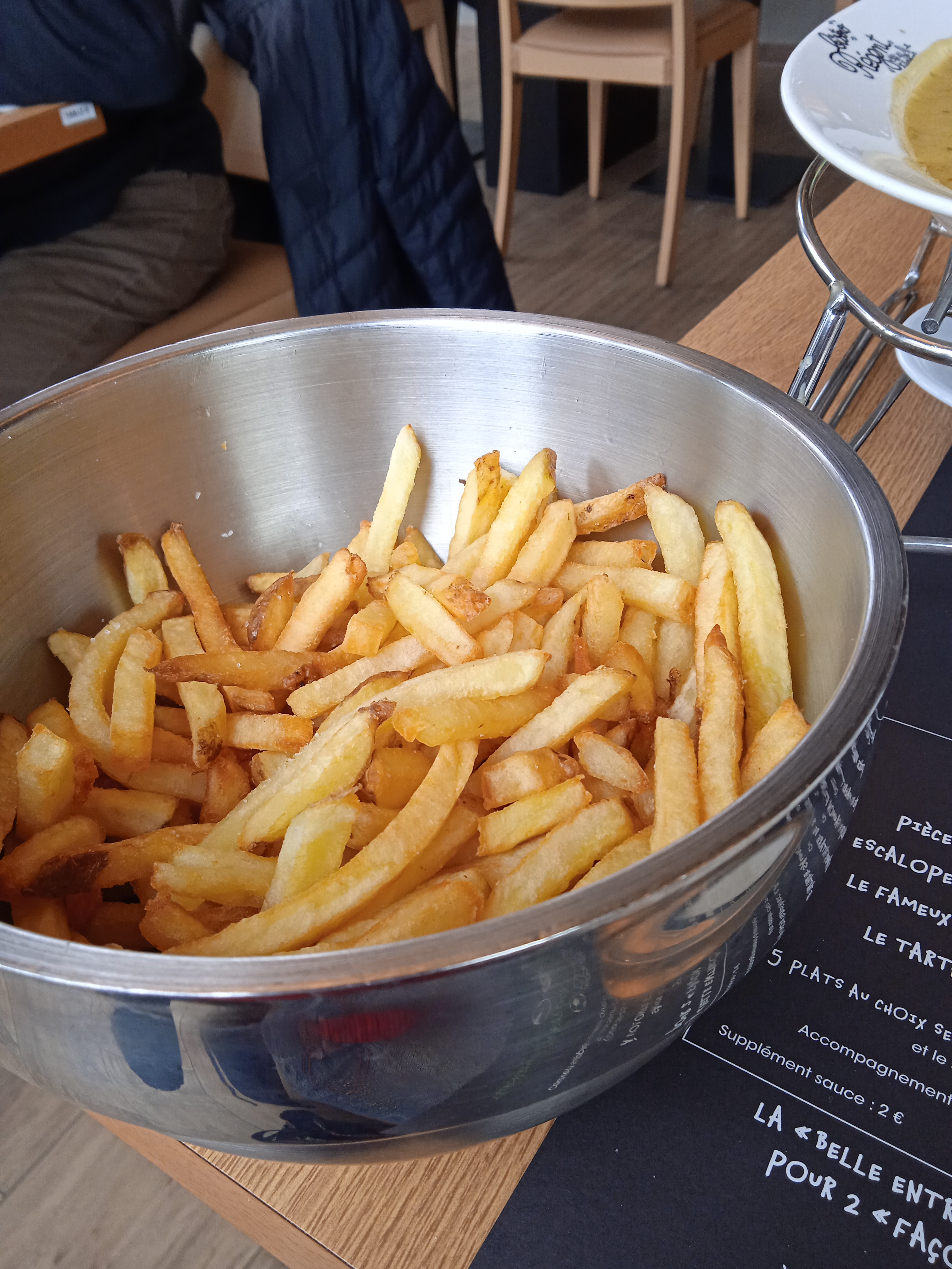 Le concept de ce restaurant est intéressant. Quel que soit le plat choisi l accompagnement ( frites maison ) est à volonté. Une salade l accompagne. La sauce unique est plus discutable. Le service était tout à fait correct malgré le nombre de clients, important, et le coup de feu lors de la pause déjeuner. Il manquait facilement 2 personnes supplémentaires. Je tire mon chapeau aux cuisiniers et serveurs qui malgré le rush ont gardé le sourire et sont extrêmement professionnels.