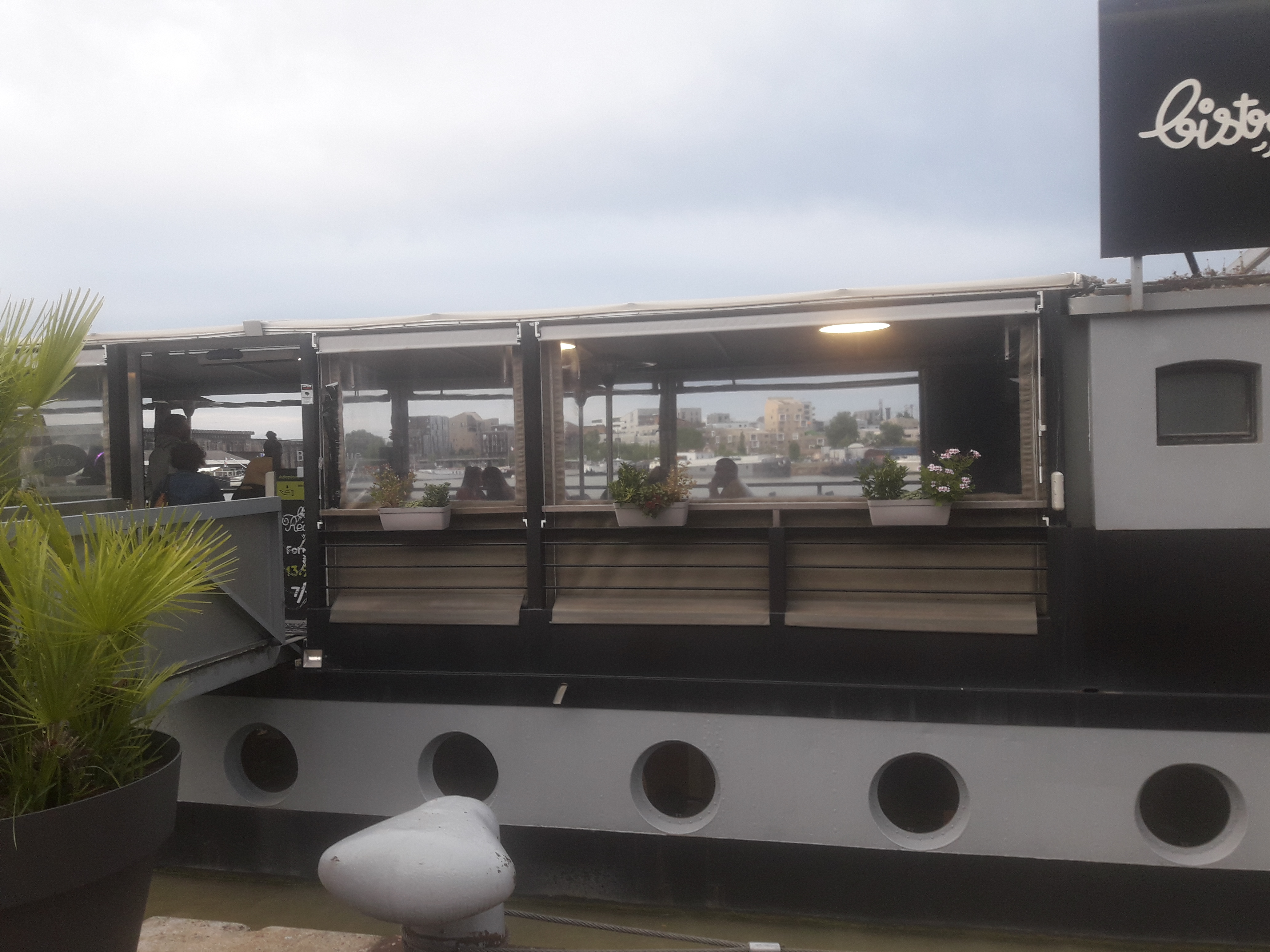 Le restaurant est situé sur un bateau au bacalan. Ce n'est pas facile pour se garer. Nous avons été un samedi midi avec réservation. Le personnel est accueillant et souriant. Le service est rapide . Table trop petite pour 2 . Le poulet, le saumon et les frites sont bons. Les desserts vraiment copieux . Petit bémol ..manque de choix dans les plats