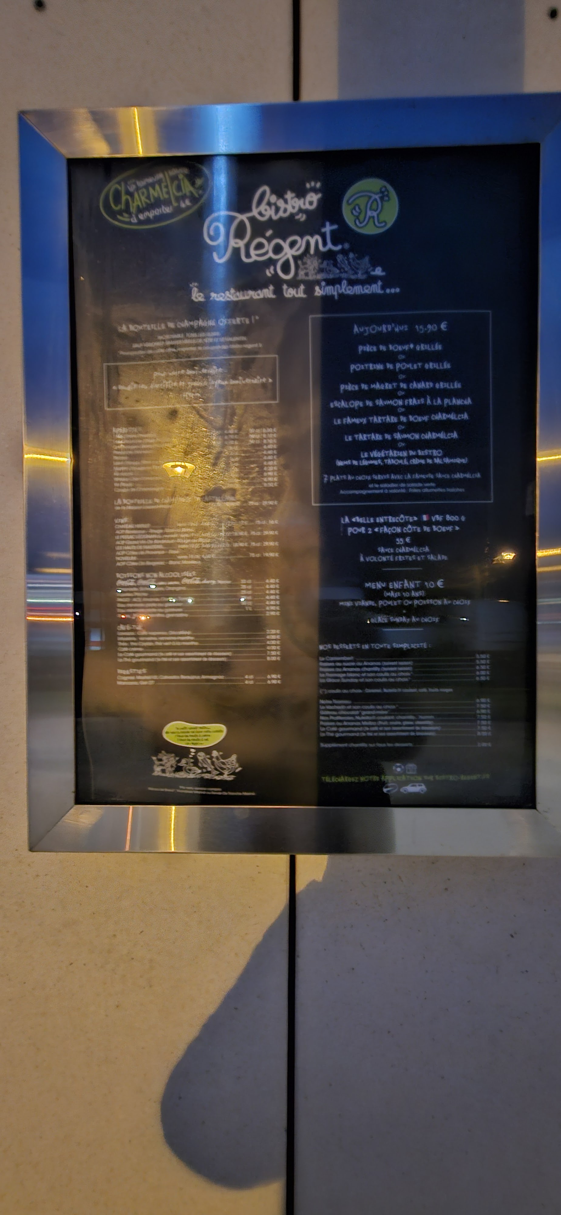 Nous étions 4 amis. On avait réservé par téléphone au dernier moment. Magret de canard toujours aussi bon et toujours accompagnés des très bonnes frites avec sa succulente salade ! Jamais déçu du bistrot régent !