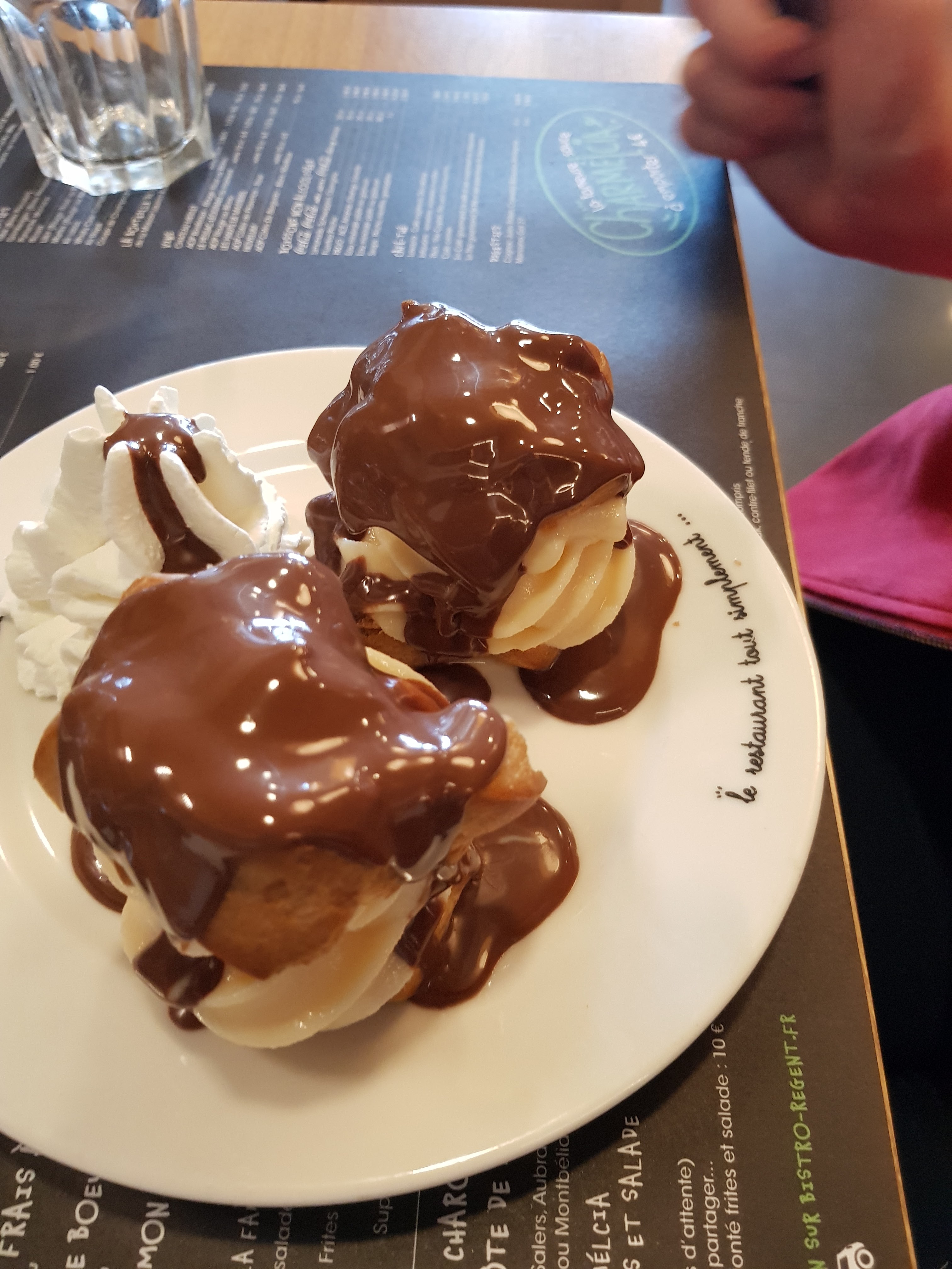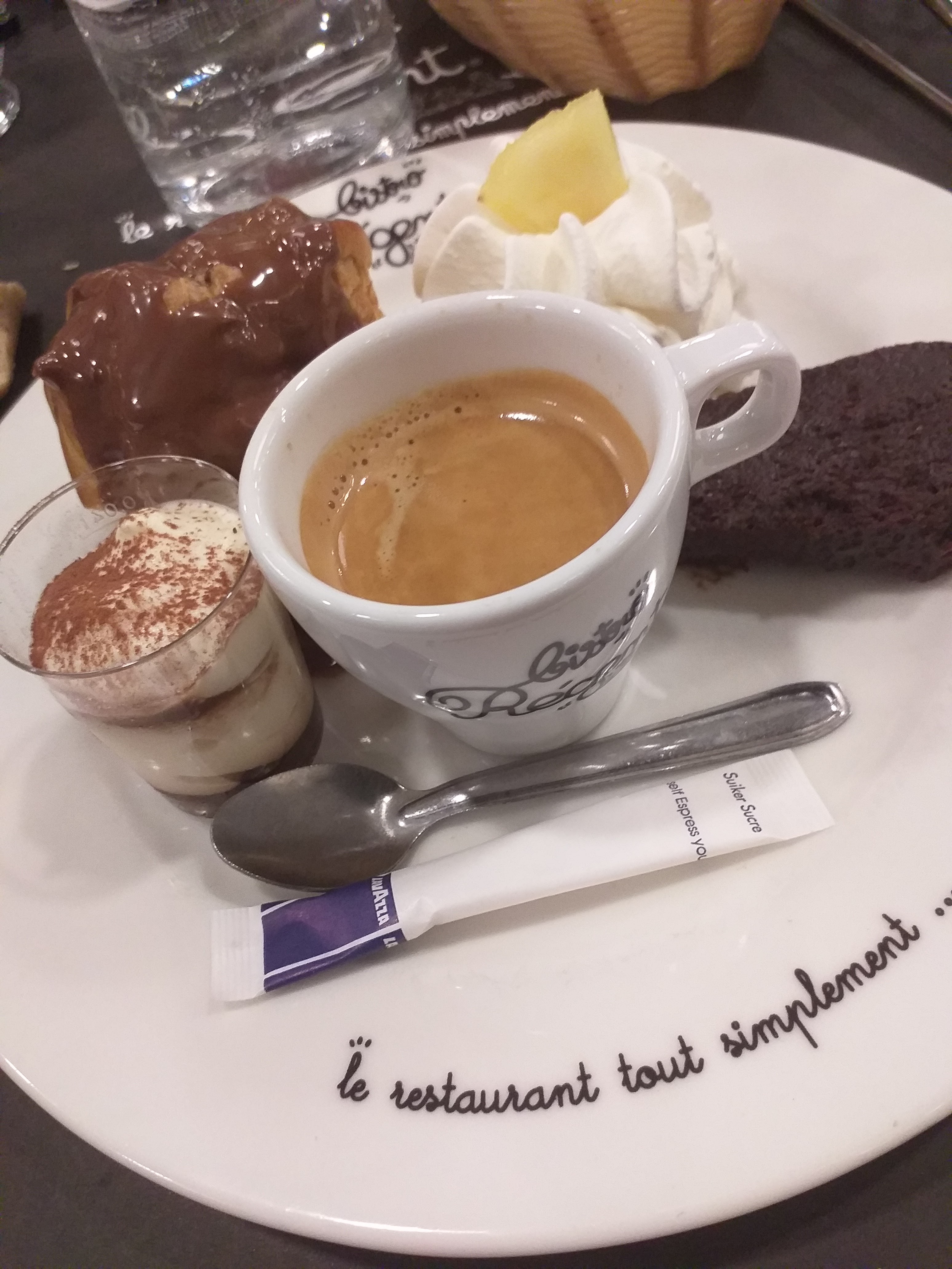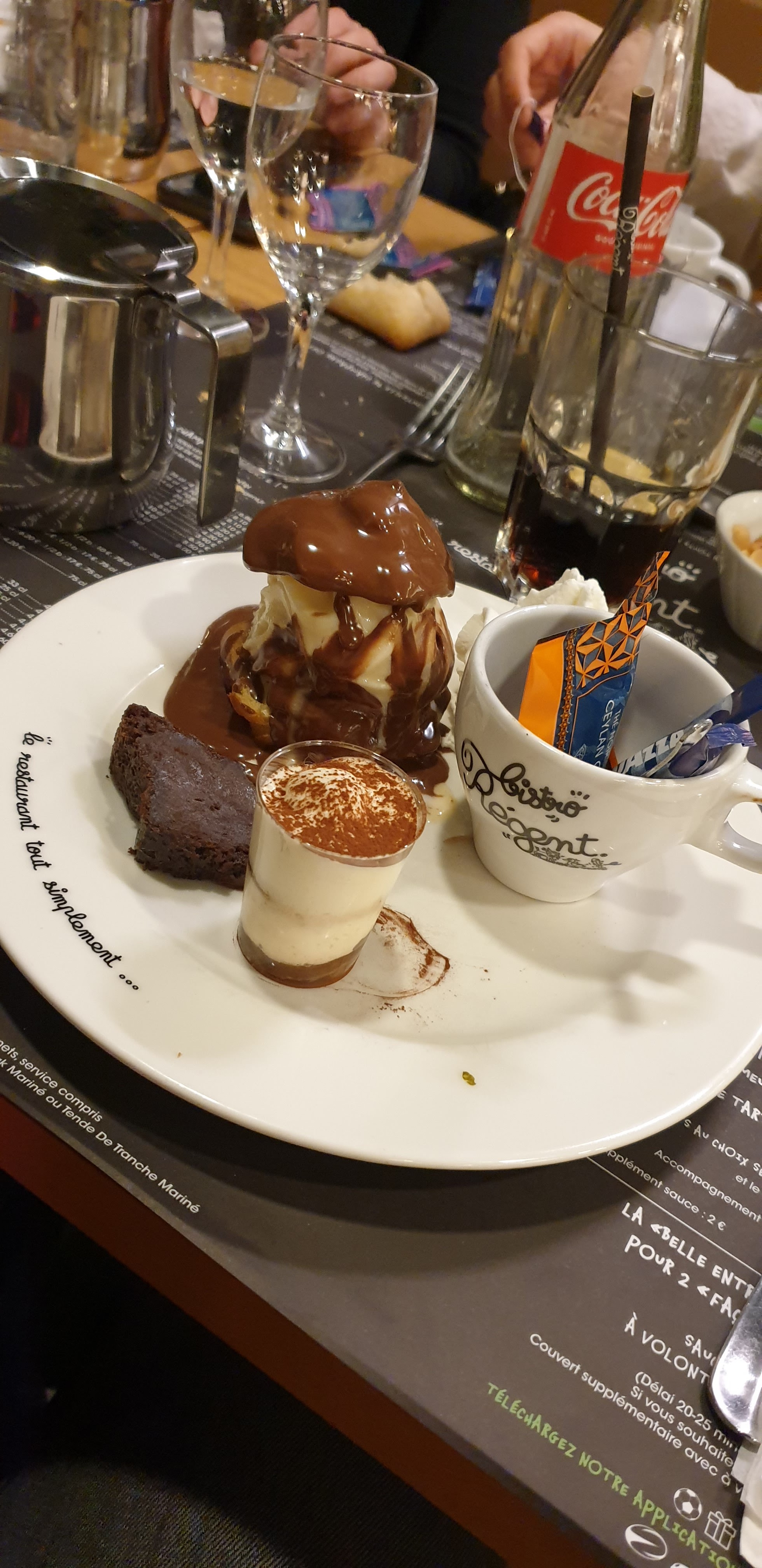 Je ne suis pas une inconditionnelle des bistrots régents, je ne comprends pas l'engouement pour cette chaîne qui ne casse pas des briques avec des prix trop élevés à mon sens, mais il avait le mérite de servir encore ce jour là à l'heure où je souhaitais déjeuner. Le sirop de ma fille trop dosé, inbuvable même en transvidant dans un autre verre et en ajoutant de l'eau. Le canard demandé rosé ne l'était pas Ma fille - qui n'avait pas pris de menu enfant - a pris un dessert classique, mais je pense qu'elle a tout de même eu le plus petit du menu enfant car très petit je trouve pour le prix et arrivé sans Chantilly pourtant noté sur la carte. Bref, ce n'est pas mauvais mais au même prix on trouve beaucoup mieux.