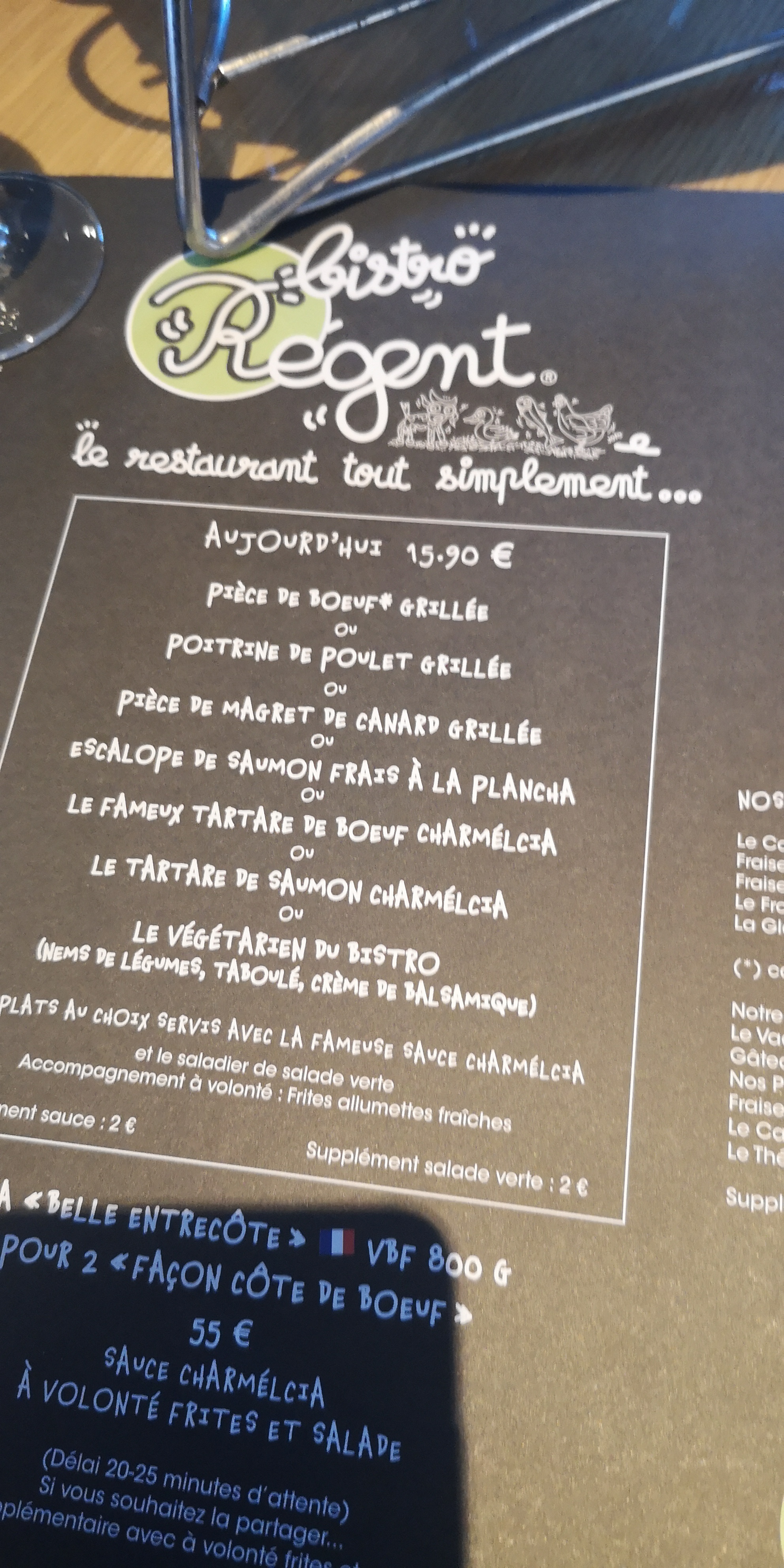 Le concept est efficace(peu de choix de plats, cuisine simple, mais c'est frais et bon), on est toujours ravis d'avoir les frites maison à volonté et le bol de salade en accompagnement. Le vin rouge (Pessac Leognan) est top rapport qualité/prix. Petit regret: Il y a vraiment beaucoup de sauce dans les plats(magret, bœuf et saumon).