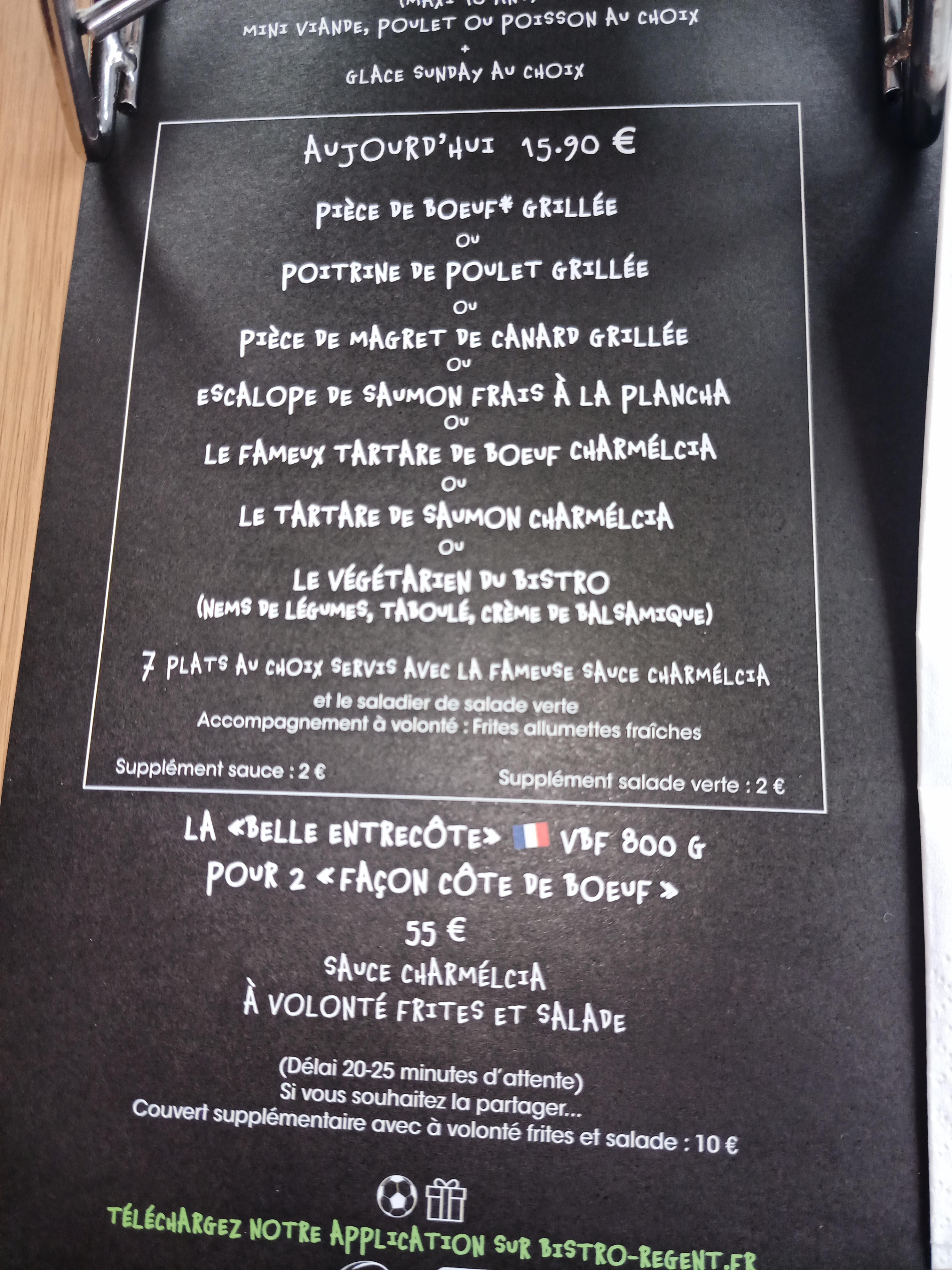 Bon accueil. Menu unique avec un choix entre 7 plats, pas d'entree, pas de dessert.Frites à volonté.Un saladier de salade très assaisonnée, 2 euros en supplement si vous en redemandez. Le Menu pour 15.90 euros. Plat: tartare, bœuf grillé, poulet grillé, saumon, vegetarien avec nems,.. Si vous rajoutez un dessert faut compter de 6.90 à 8euros supplémentaires: profiteroles, sunday, tiramisu, gâteau au chocolat, café ou thé gourmand, ... Menu enfant à 10 euros mini viande, mini poulet accompagné de frites, et un mini sunday en dessert sauce caramel, Nutella fondant ou fruits rouges. Le jus de fruit: 4.40 euros. Ils vendent leur sauce Charmelcia en caisse pour 4 euros, à laquelle il faut rajouter 250gr de beurre. Service rapide. Restaurant de plein pied accessible aux personnes à mobilité réduite.