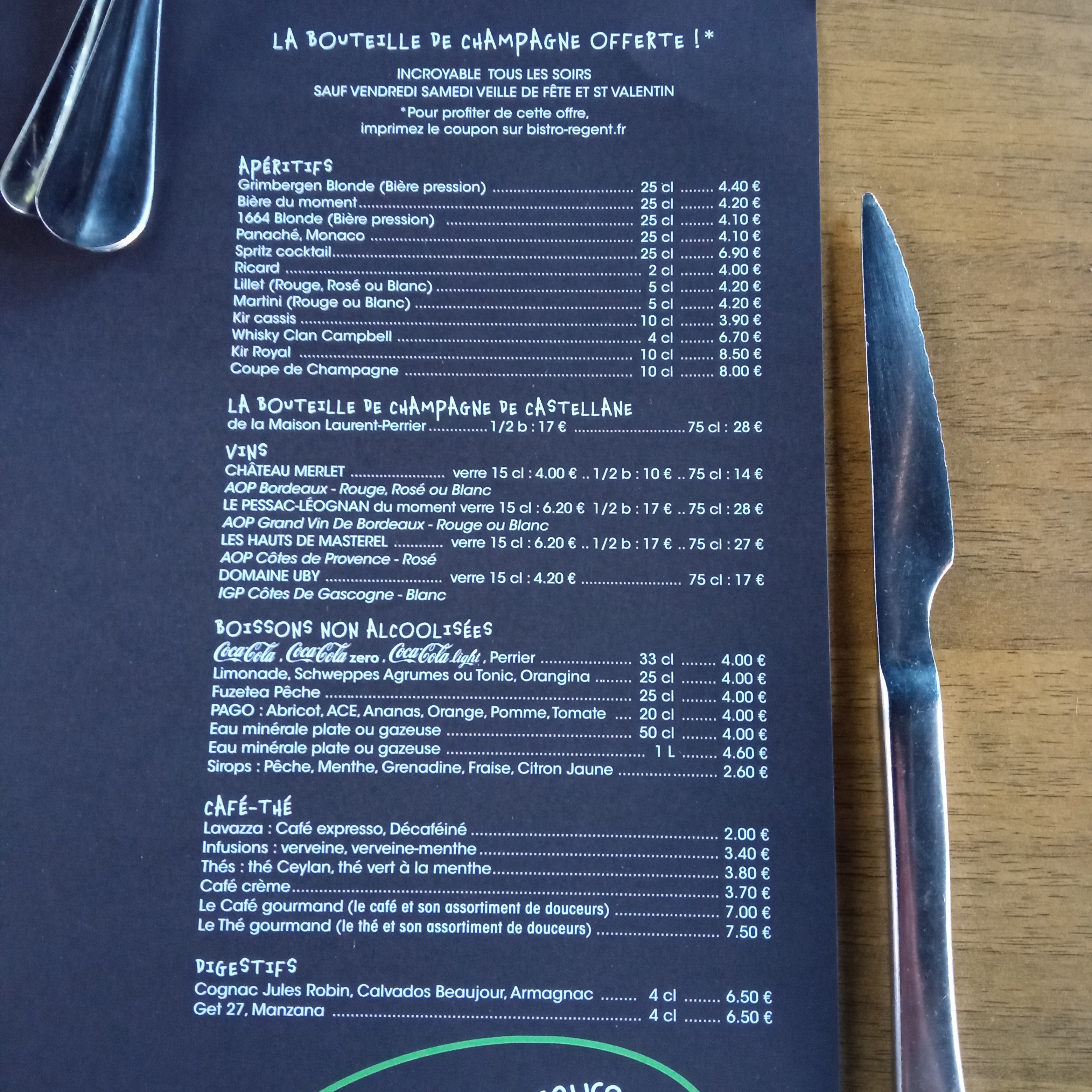 J'y suis allé ce dimanche midi 12/01/2020. Et mon amie et moi avons été extrêmement déçus : la carte a un choix extrêmement réduit et, de plus, la serveuse a annoncé qu'il n'avait pas été livré en viande de bœuf. Donc adieu le tartare ! Je me suis rabattu sur la pièce de bœuf (avec la fameuse sauce !) et on m'a servi une pièce de viande tout juste décongelée : le jus était de l'eau ! A la fin du repas, après le café gourmand nous avons commandé un deuxième café. Au dire de la serveuse ce n'était pas possible : la machine avait été déjà nettoyée et ils ne voulaient pas la salir de nouveau ! Il était à peine 13h45 ! J'ai appris que le Régent faisait partie d'une chaine de restos et qu'elle appartenait au chef Etchebest (dont les portraits sont d'ailleurs affichés en grand sur les murs. Hé bien Monsieur Etchebest, ce n'est pas à votre honneur ! vous devriez être aussi exigeant avec les gérants (chefs, gérants et serveurs) de vos restos que vous l'êtes dans vos émissions TV populaires. Vous devriez balayer devant votre porte avant d'aller le faire chez les autres. Bien entendu je ne recommande pas ce restaurant !