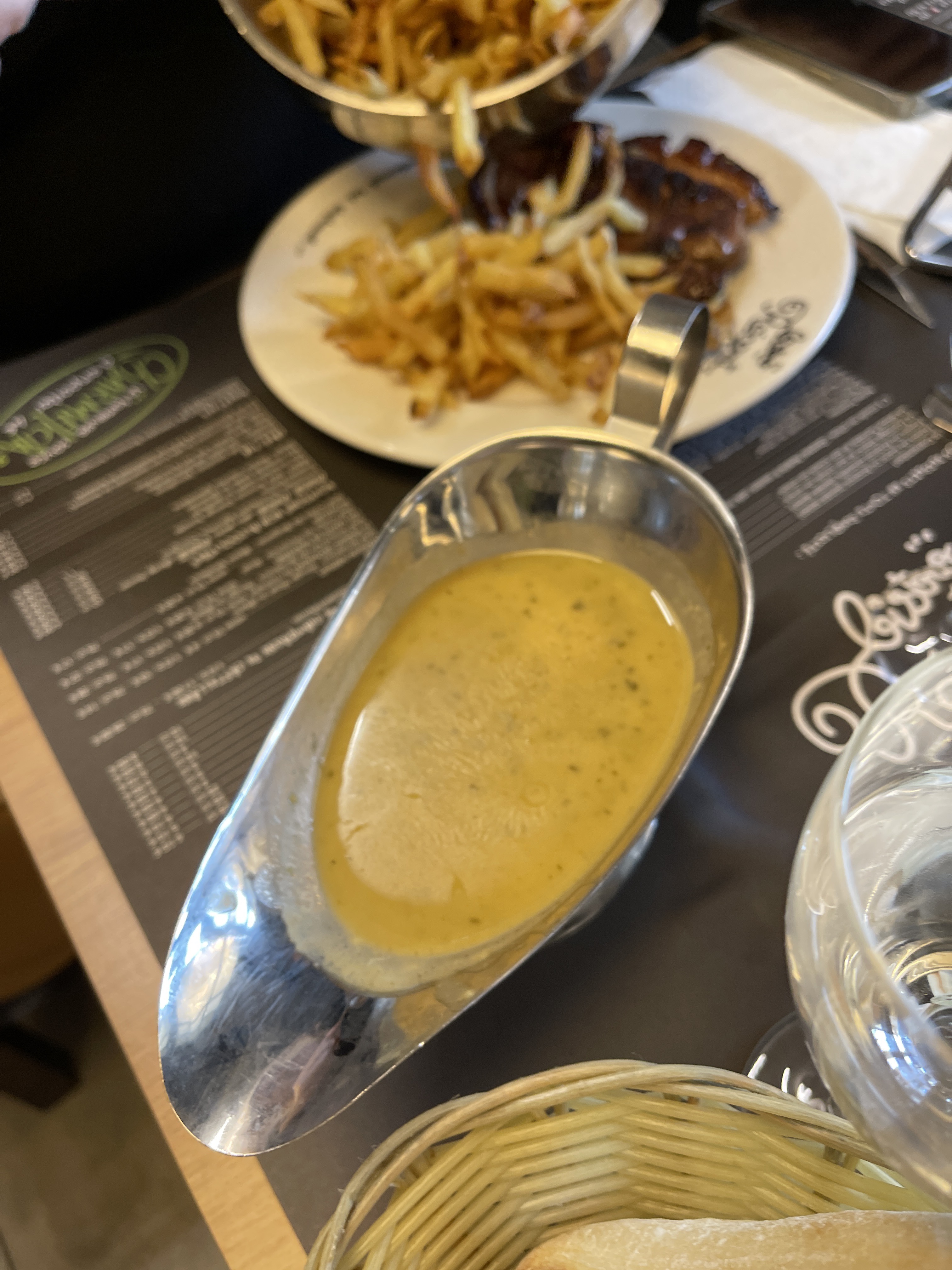 Déjeuner pour 2 réservé à l'avance. Personnel bienveillant et aimable. On aurait peut être préféré manger côté rue mais pas trop grave. On demandera la prochaine fois. Viande cuite à nos souhaits, frites chaudes, sauce impeccable et salade bien fraîche. Seul bémol. Avions demandé que la viande de ma fille ne soit pas servie dans la sauce au cas qu'elle ne l'aime, mais les 2 viandes étaient servies dans le même plat en sauce. Peut être aussi séparer comptoir en 2 pour encaissement et service boissons ? On y retournera car repas correct.