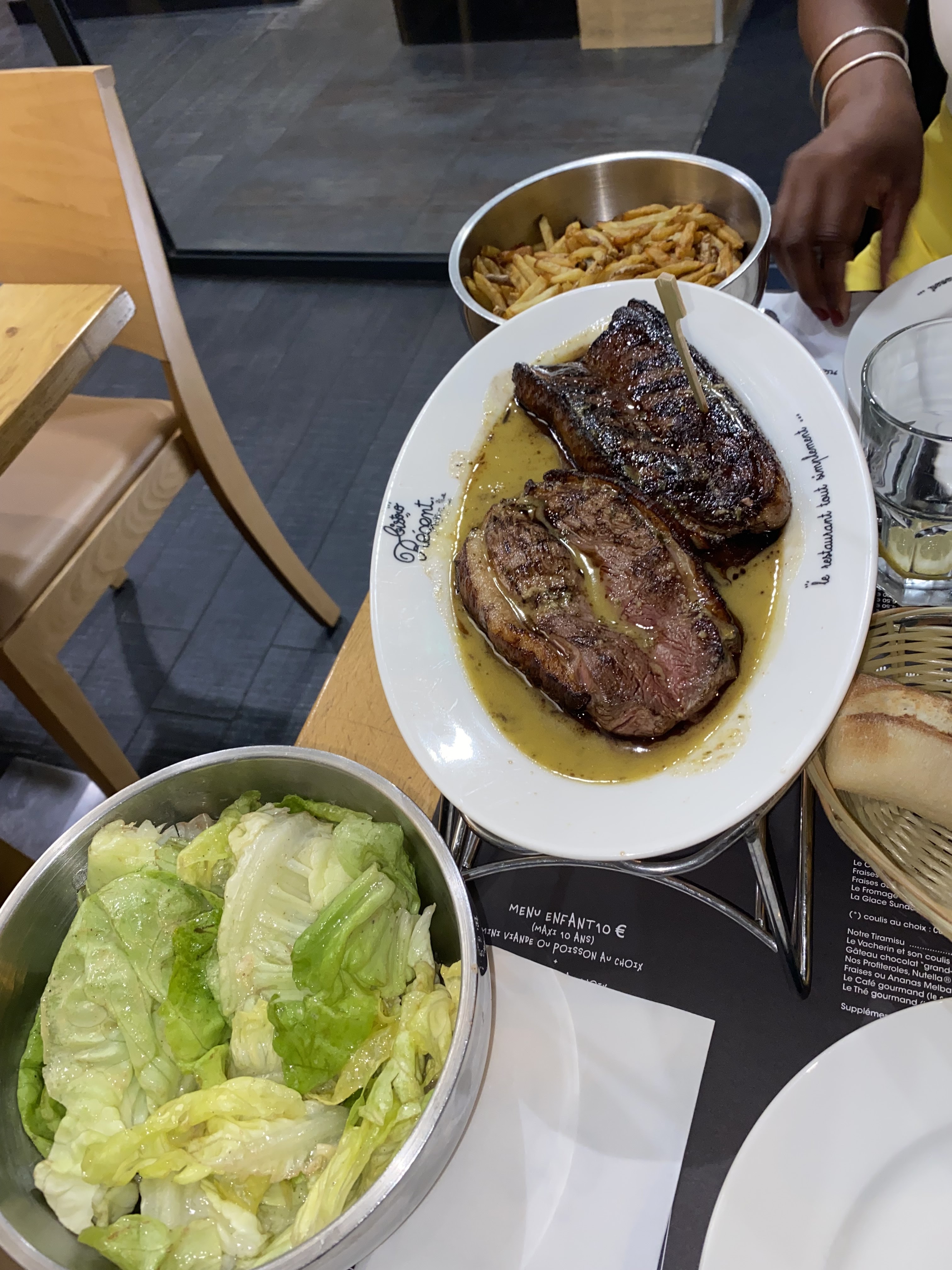 Le concept et challenge viande + salade + frites est concrétisé dans l' assiette. En revanche, les vins proposés ne sont pas à la hauteur malgré les prix appliqués qui sont ceux du marché. Pourquoi ? Là est le mystère ! Enfin concernant les desserts pour y être aller à plusieurs reprises et avoir testé différentes suggestions, ce n'est leur point fort. Dommage que ce soit les éléments accessoires qui fassent chuter l'appréciation.