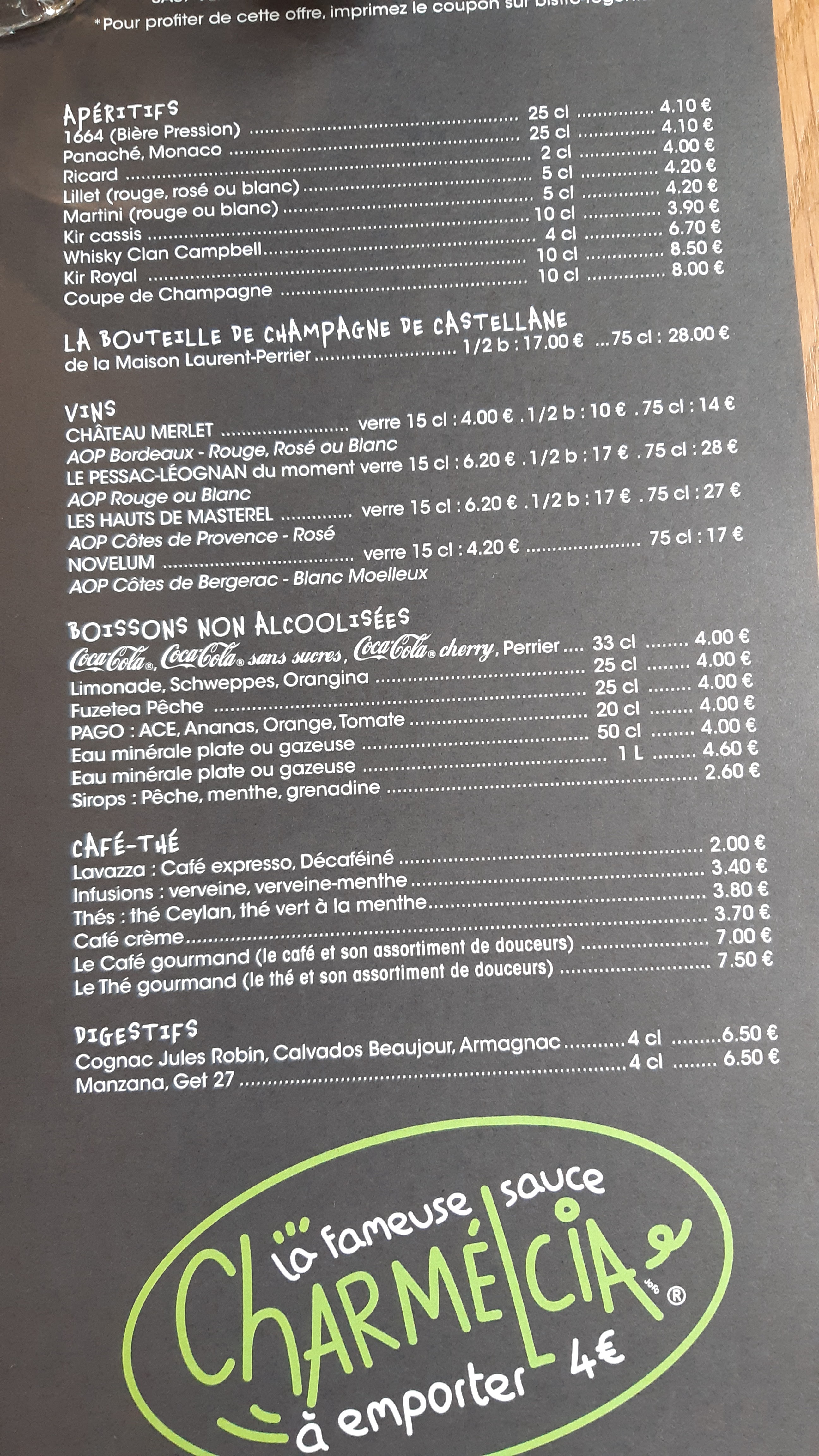Vraiment déçue ! On peut avoir une bouteille de champagne offerte mais il faut imprimer le bon alors que ce n'est ABSOLUMENT PAS écrit dessus, le serveur me dit que c'est écrit sur le dessous de table, effectivement je vais imprimer mon coupon pendant que je suis au restaurant, biiien sûr ! Bien pensé 👍 On fait un coucou a l'écologie, aux dépenses de papier et aux personnes qui n'ont pas d'imprimante ! Votre Champagne offert à la table sous conditions que chaque convive commande au minimum une formule à 13,90€. Offre non cumulable : un bon par table le soir.Téléchargez sans attendre votre coupon TÉLÉCHARGEZ PAS IMPRIMEZ, mettez vous d'accord ! Le personnel est gentil, et c'est la seule chose positive dans ce lieux, sur 4 personnes : 2 plats froids et 1 plat mal cuit. 1 saladier de frites pour une table de 4 c'est très limite. Heureusement qu'on avait 10min a tuer pour en avoir un autre.
