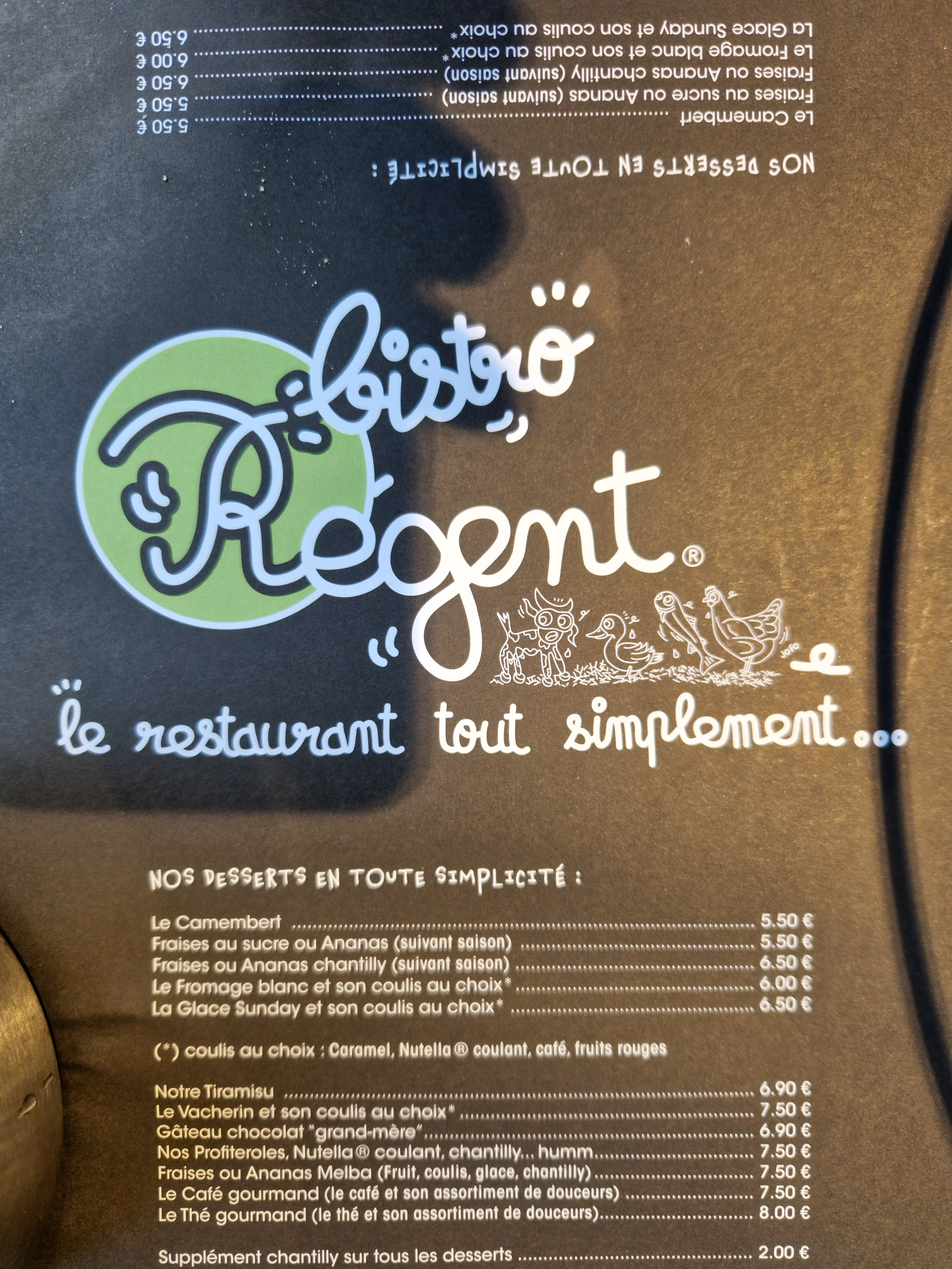 Nous sommes allés manger et nous avons été très déçus. Commandé un magret de canard déjà là moitié de gras et puis très peu de sauce . On en redemandé et la serveuse nous en apporte sans rien nous dire .. Et au moment de payer l'addition on nous facture un supplément pour la sauce . C'est pareil pour la salade alors qu'il est écrit nul part. Au contraire on lit à volonté. Nous allons dans d'autres bistrot Régent et on ne nous a jamais fait payer un supplément pour la sauce . C'est abusé on prend le client pour des vaches à lait .