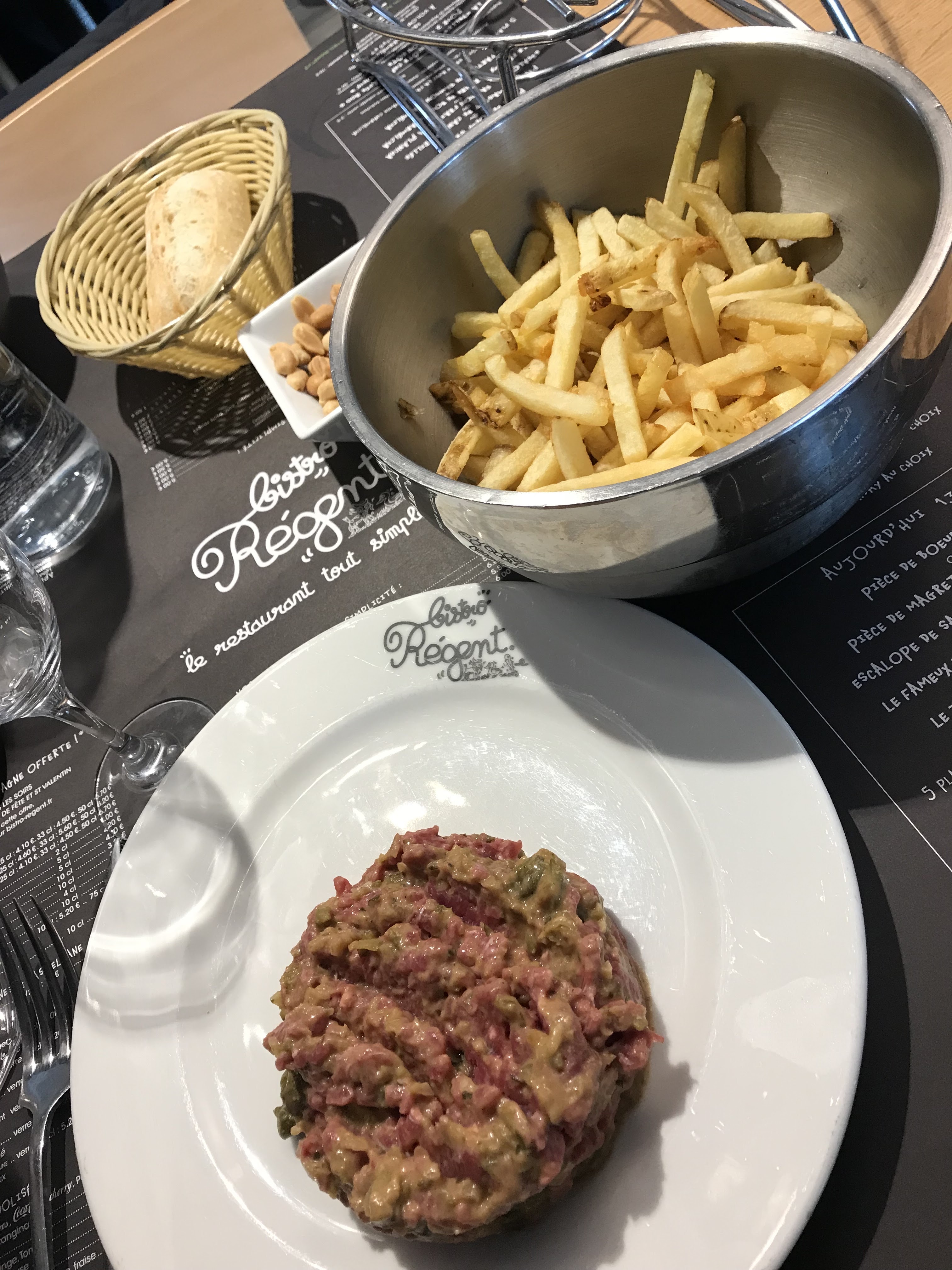 Première découverte du bistro régent : le concept de la chaîne est particulier. Le chauffe plat ne sert à rien mise à part prendre de la place sur la table sachant que le plat de viande est servi sur ce chauffe plat . Nous prenons la viande une fois servi donc cela ne sert à rien . De plus mélanger dans le même plat du canard et du bœuf avec leur sauce particulière ( il faut aimer ) c’est pas top! Le jus des deux viandes se mélangent ensemble , pas terrible . Oui c’est le concept de cette chaîne mais pourquoi ne pas changer et proposer une belle assiette : viande , frite et salade + choix de différentes sauces ( une bonne béarnaise maison par ex ) Le point positif : la salade super bonne , une « vraie « bonne salade avec une sauce vinaigrette maison Le dessert : nous avons pris des profiteroles : bonnes sans plus Nous avons fait part de tout cela auprès du serveur mais il nous a dit c’est le concept de la chaîne ! Nous avons voulu tester mais nous ne reviendrons pas . Il y a d’autres restaurants sur tours nord au goût du jour dans leur déco, dans la présentation des plats et surtout bien meilleur…