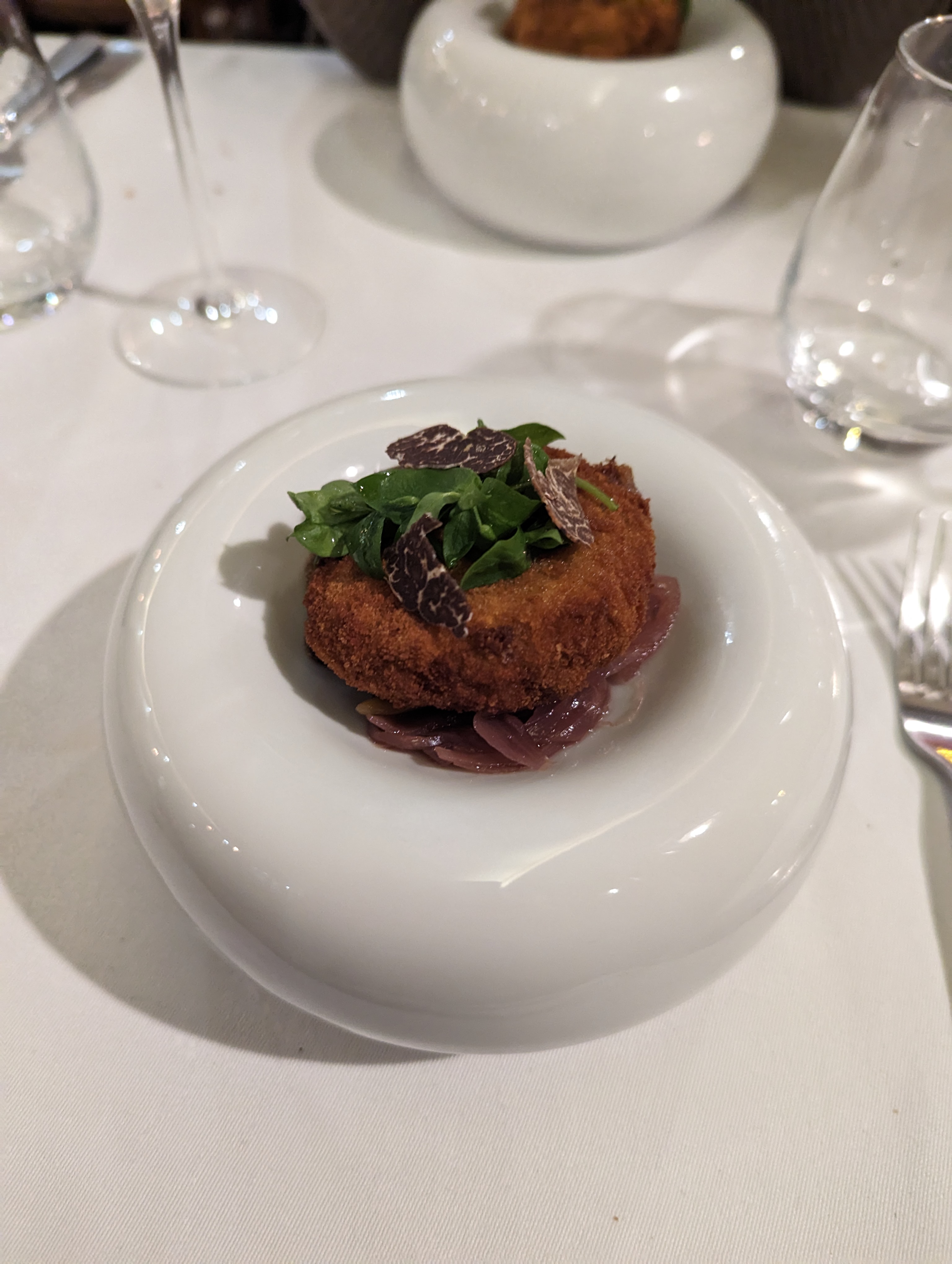 Menu 5 temps Truffes à chaque plat jusqu'au fromage, ça fait un peu je veux montrer que mon restaurant est gastronomique... Bon mais sans plus, écoeuré par la truffe à la fin. Je ne mange pas de poisson, il était apparemment impossible de me préparer un petit quelque chose pour remplacer l'amuse bouche, ce que je trouve très bizarre. Un chef dans une cuisine de restaurant qui se dit bistronomique, et à ce prix, devrait pourtant en être capable.