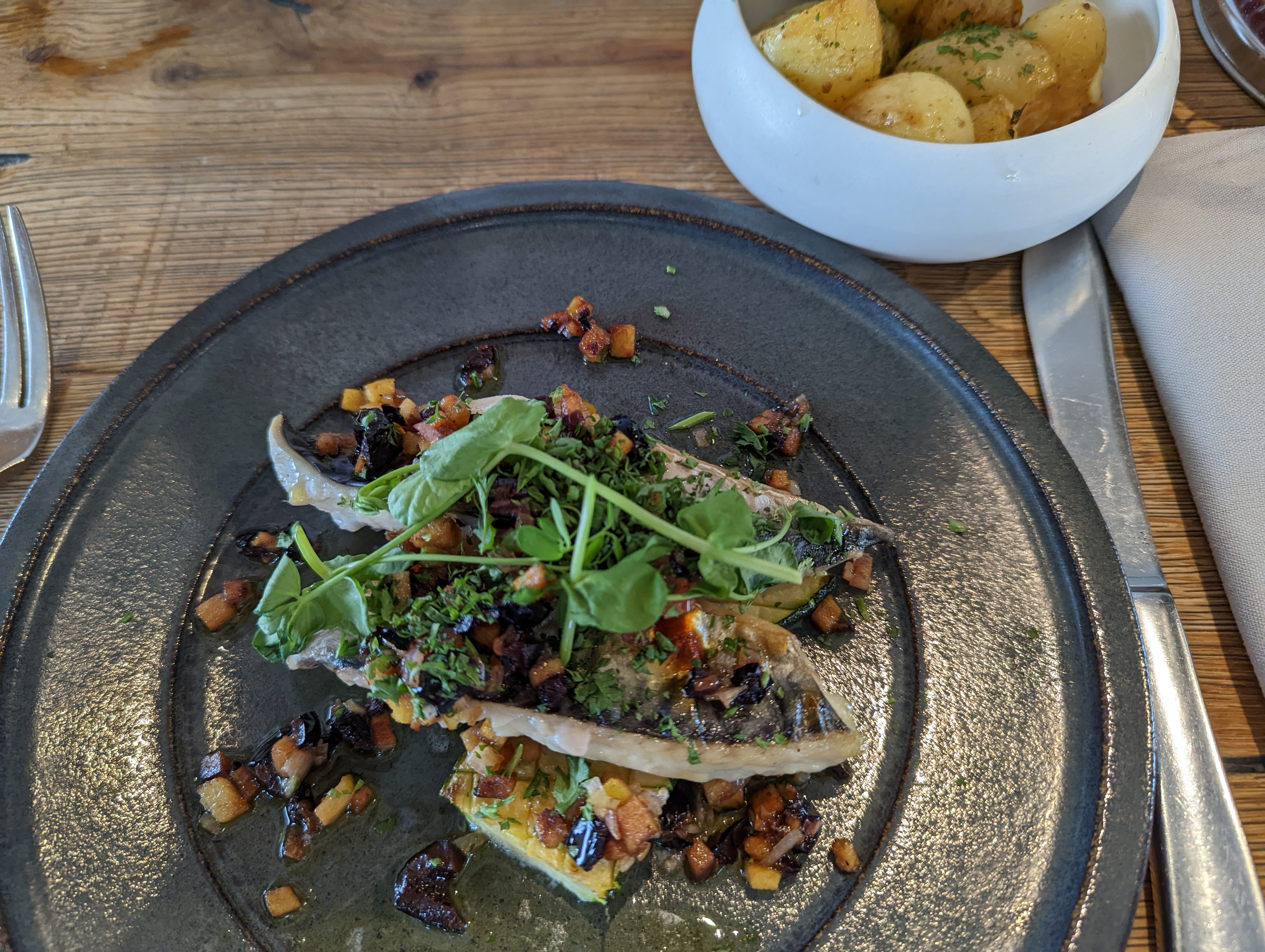 Bon point pour la carte : resserrée, produits locaux et de saison. Les portions sont minces, vous aurez la place pour entrée, plat et dessert. Aucun des trois ne vous laissera de souvenir impérissable. Cadre agréable, les tables sont bien espacées, bon service. Quel dommage de ne pas avoir complété l'offre de l'étoilé d'à côté avec une brasserie, plus décontractée et moins prétentieuse que ce bistrot !