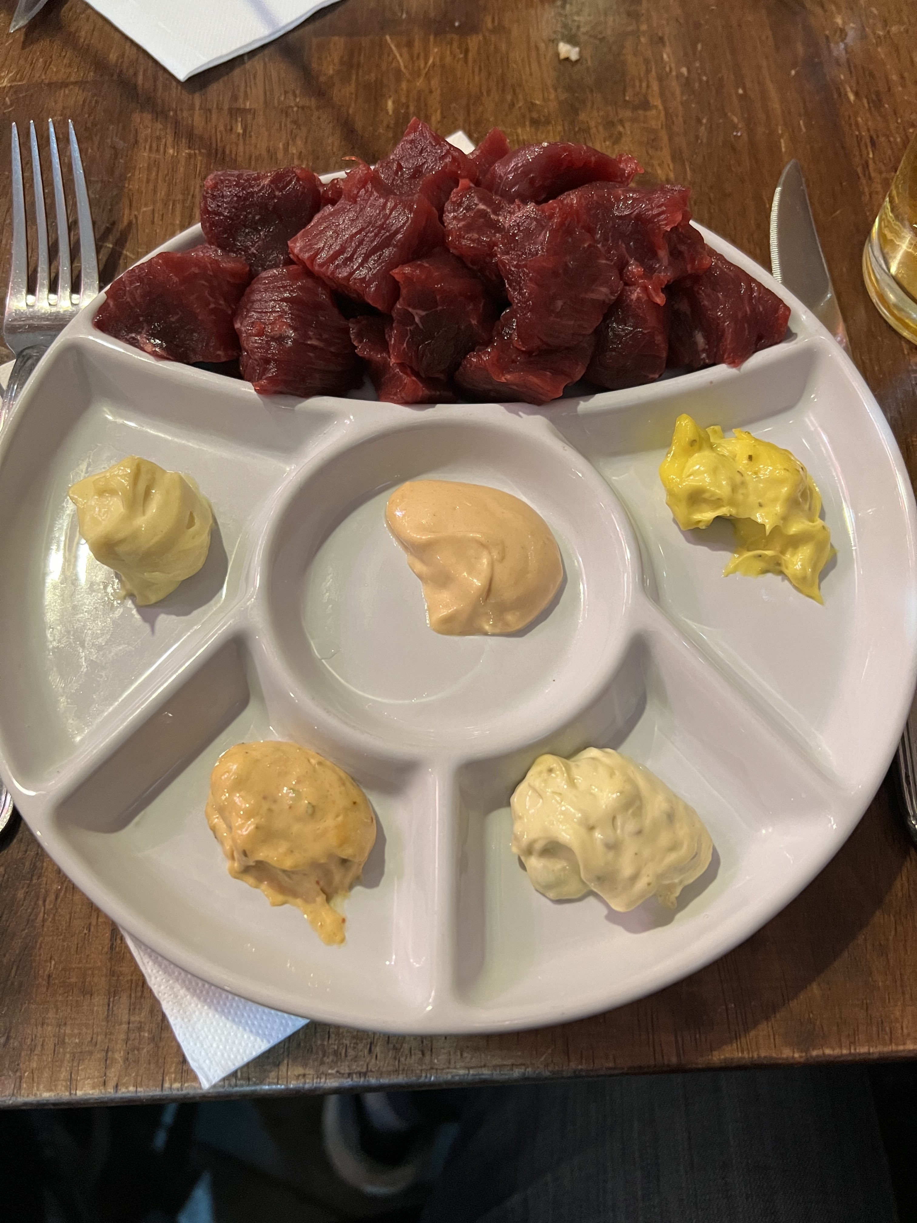 si vous regardez a un bon restaurant pour manger les meilleurs viandes (en forme fondue et aussi le steak) c’est le seul endroit ou vous devez visiter. puisque les serveurs sont tres gentils et l’acceuil etait trop bon. Je suis venue de Turquie et je pense que les plats sont tres convenables pour notre gout habituel. mes plats preferes sont “fondue a la bourguignonne et le pave du boeuf”. Un restaurant tres sympa et delicieux.