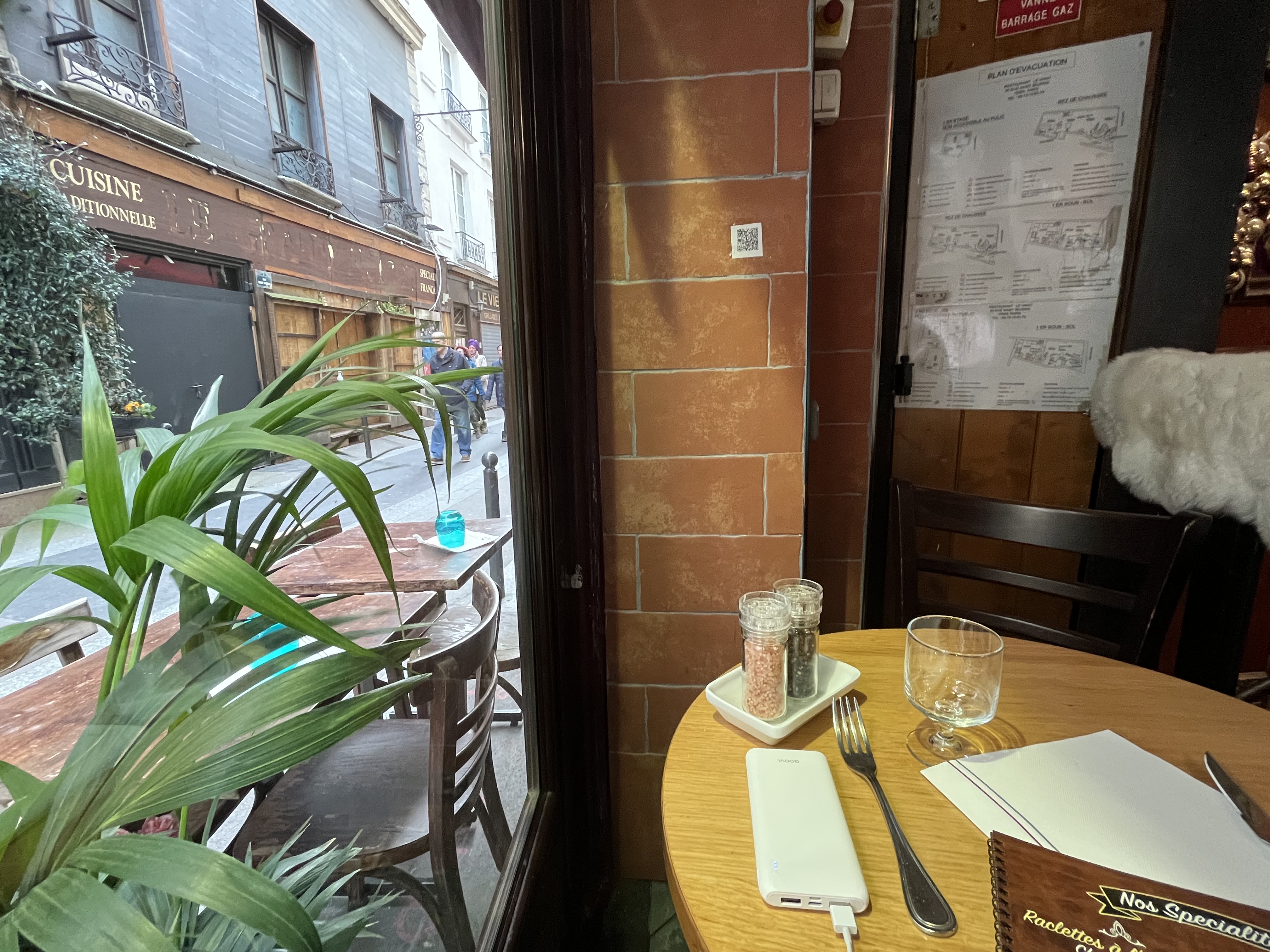 Nous avons trouvé le restaurant par hasard en cherchant un endroit pour déjeuner. Notre groupe était composé de huit personnes, le serveur a immédiatement rejoint 2 tables et nous a assis confortablement. Extrêmement sympathique, nous a conseillé sur le menu et a immédiatement pris nos commandes. Le personnel est sympathique et la vue sur Saint Séverin est incroyable ! La soupe à l'oignon était excellente et très savoureuse ! La fondue au fromage à raclette était également délicieuse et largement suffisante pour deux personnes, voire trois. Endroit vraiment sympa avec une cuisine française traditionnelle. Je peux recommander cet endroit à tout le monde.