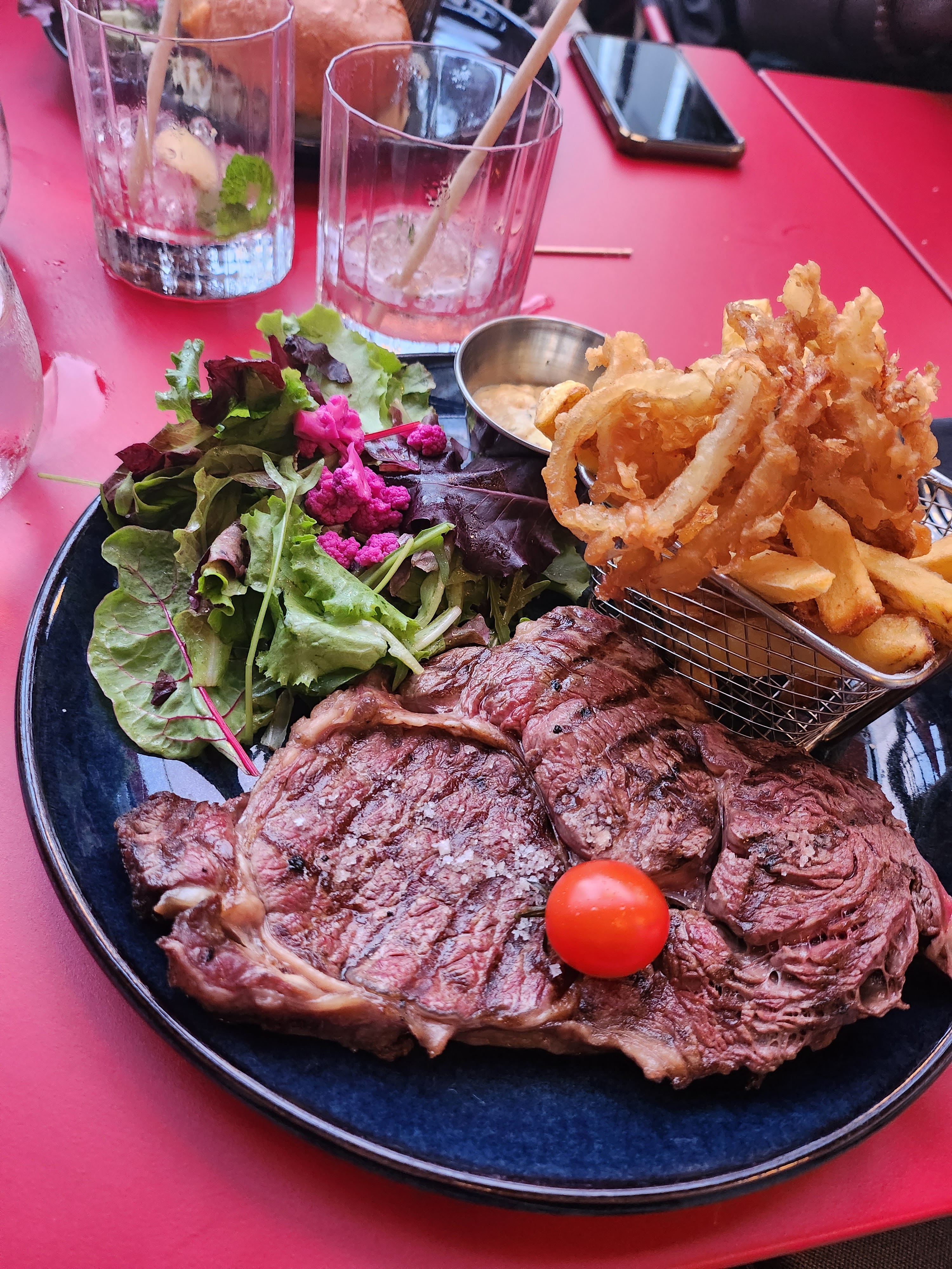 Nous avons dîné avec notre famille. Bonne ambiance, belle cuisine ouverte, toilettes propres et personnel vraiment sympathique ❤️ Menu enfant 10,50 € un petit « steak » (c'était plutôt de la viande tranchée) et des frites et un dessert de 2 boules de glace avec de la chantilly. Pour commencer, nous avons eu une bonne salade italienne de bon goût 🥗 Astuce ! Nous avons eu l'entrecôte et le burger 51. Malheureusement, au moment de servir, les deux plats (en particulier la viande) devenaient déjà froids. Nous avons donc dû manger rapidement notre dîner. Les frites étaient chaudes. Délicieux vin rouge🍷 Un peu trop cher pour ce que c'est, mais nous avons quand même apprécié notre séjour ! Vous ne pouvez pas payer de pourboire numérique au personnel, alors apportez de l'argent liquide !