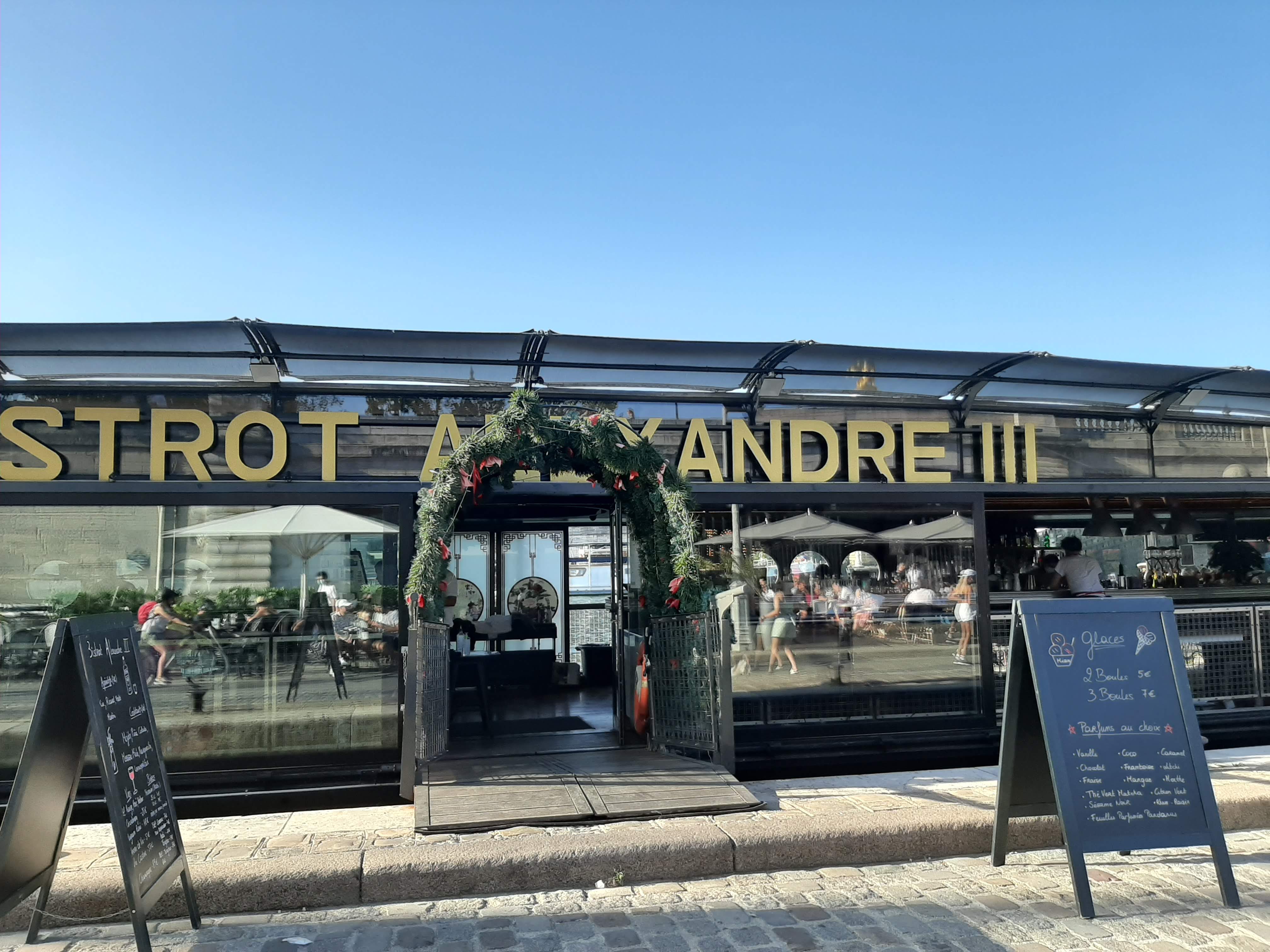 Victime de son succès, aux beaux jours, cette péniche est tout simplement rempli. Il faut dire que l'endroit est plutôt agréable, au pied du pont Alexandre III. Niveau nourriture, ça reste de la restauration rapide.