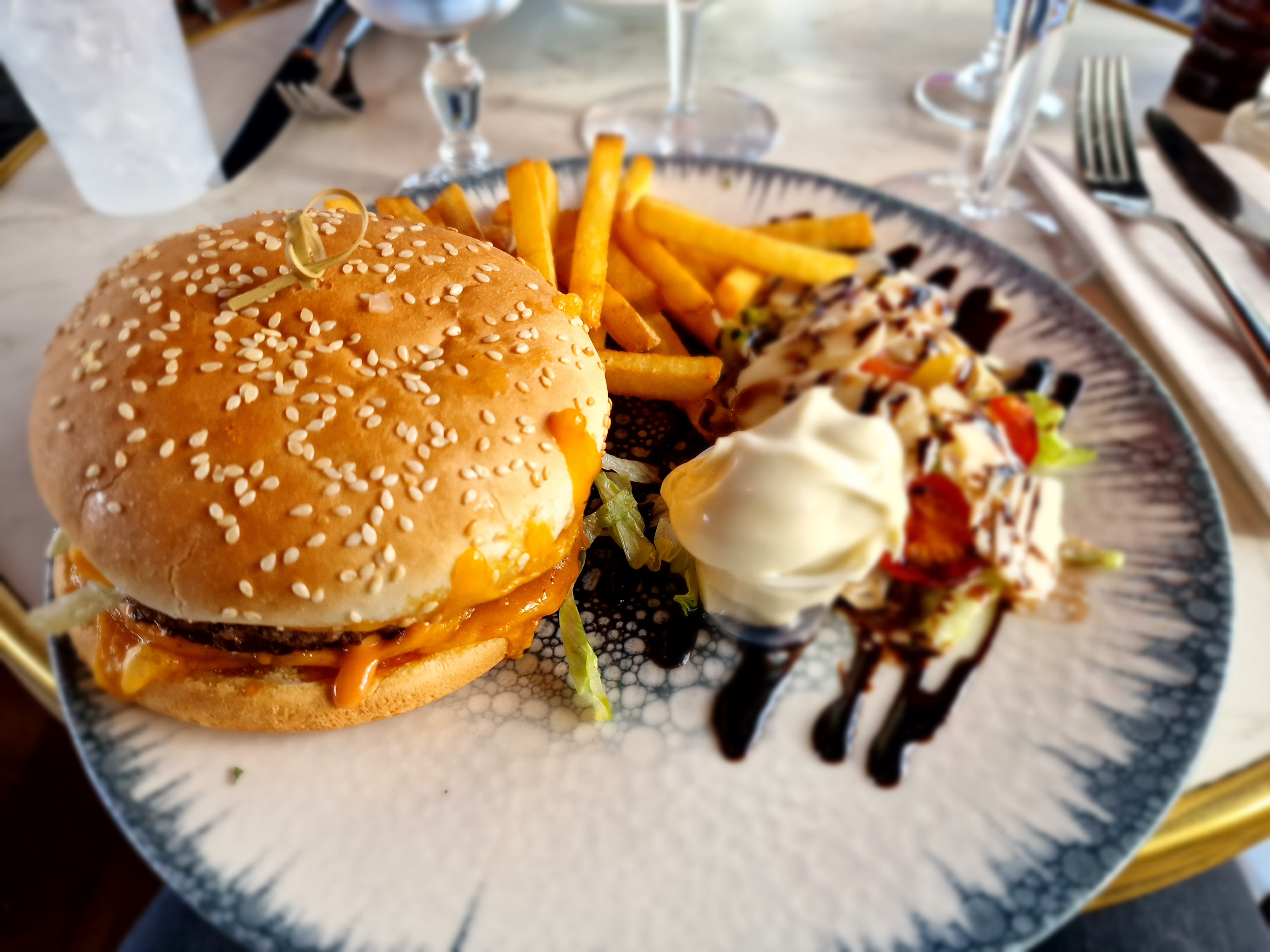 Les prix sont exorbitants pour ce qui est servi. Tout semble surgelé (pain réchauffé à la dernière minute). Le dessert est visiblement resté en attente un moment (crème chantilly arrivée liquide dans l'assiette). Carafe d'eau sale( faire un effort sur les verres et la carafe serait un +). On paye clairement le cadre. Petit bonus : malade dans la nuit !