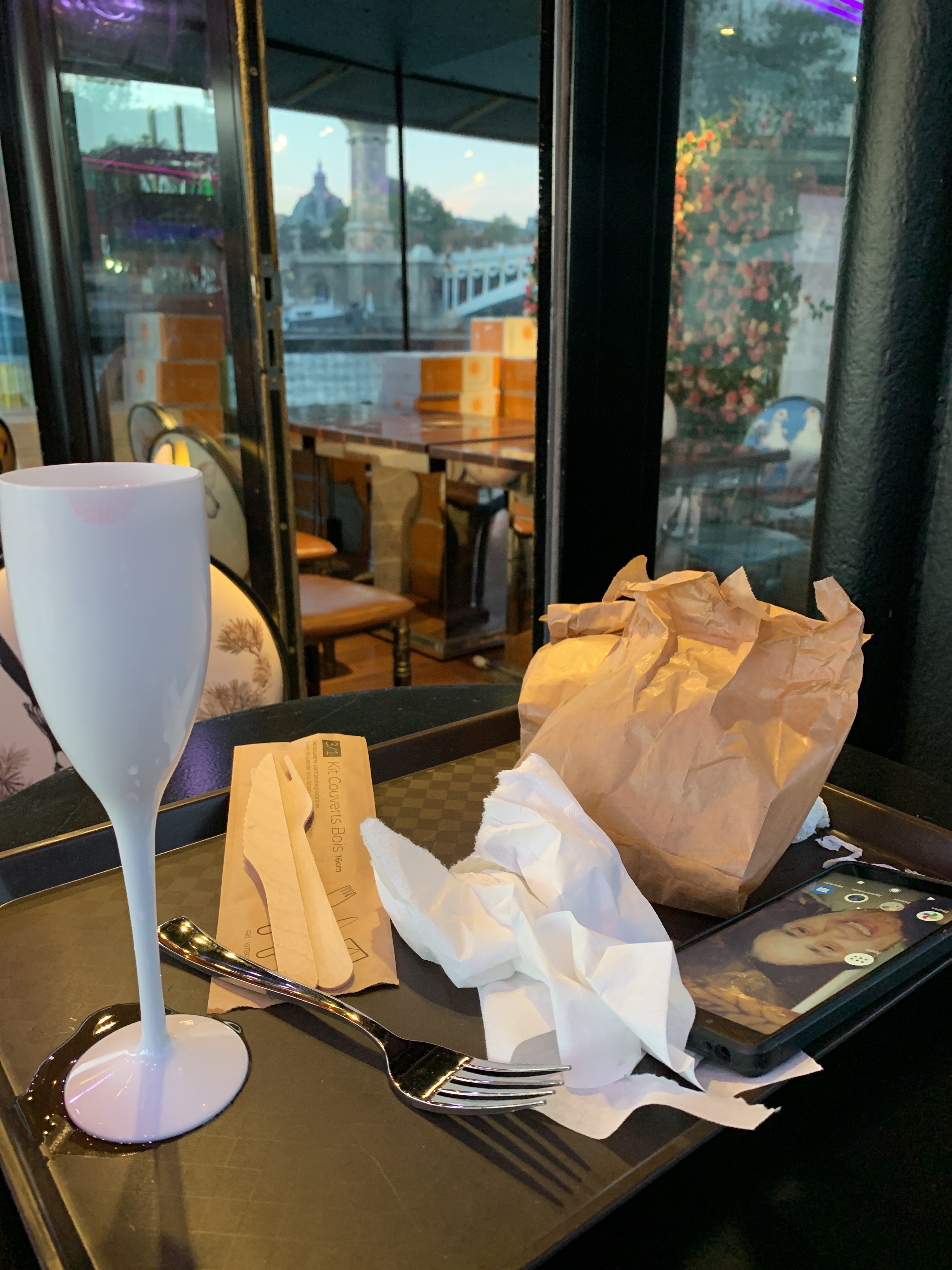 Pour une pause en bord de Seine, le spot était parfait. Jusqu'à ce qu'on nous serve nos boissons... Tout en plastique à usage unique, gobelets sodas, bouteille d'eau, tasse à café ... je ne parle pas de la péniche mais du container en face.