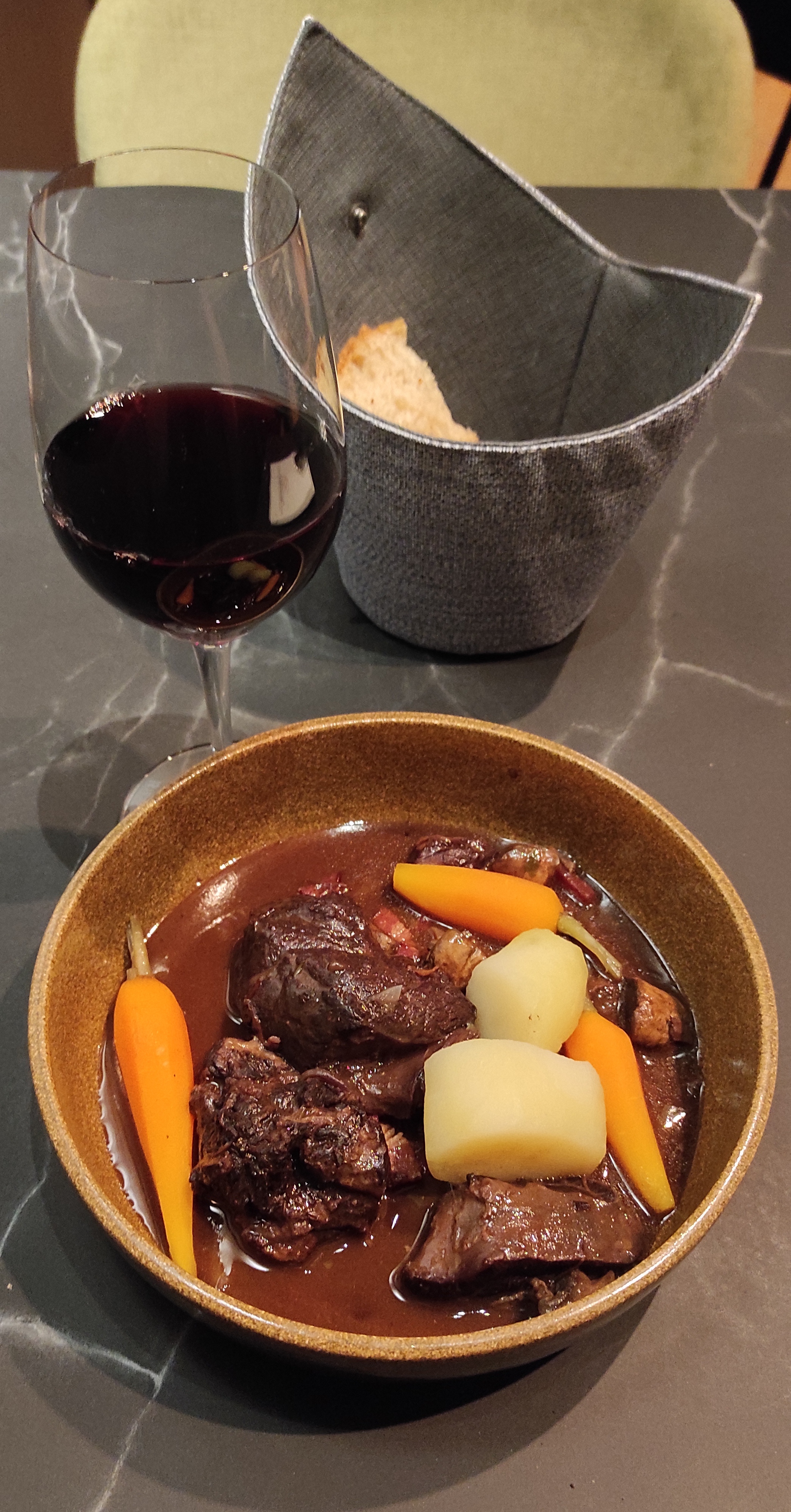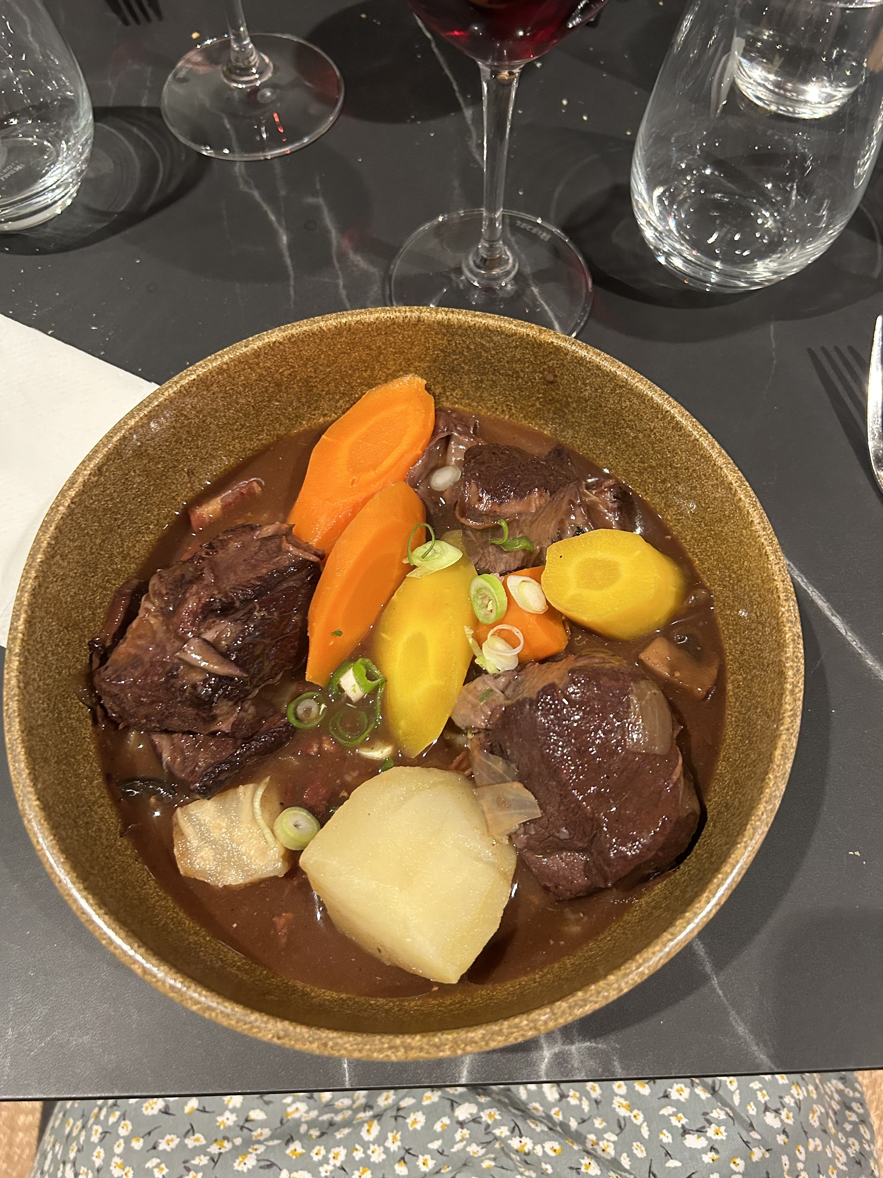 Bon apétit, un bon boeuf bourguignon bien présenté dans sa petite casserole. Kir bien dosé. Personne agréable. Petit bémol sur les Champignons, dommage qu'ils n étaientt pas tout frais.