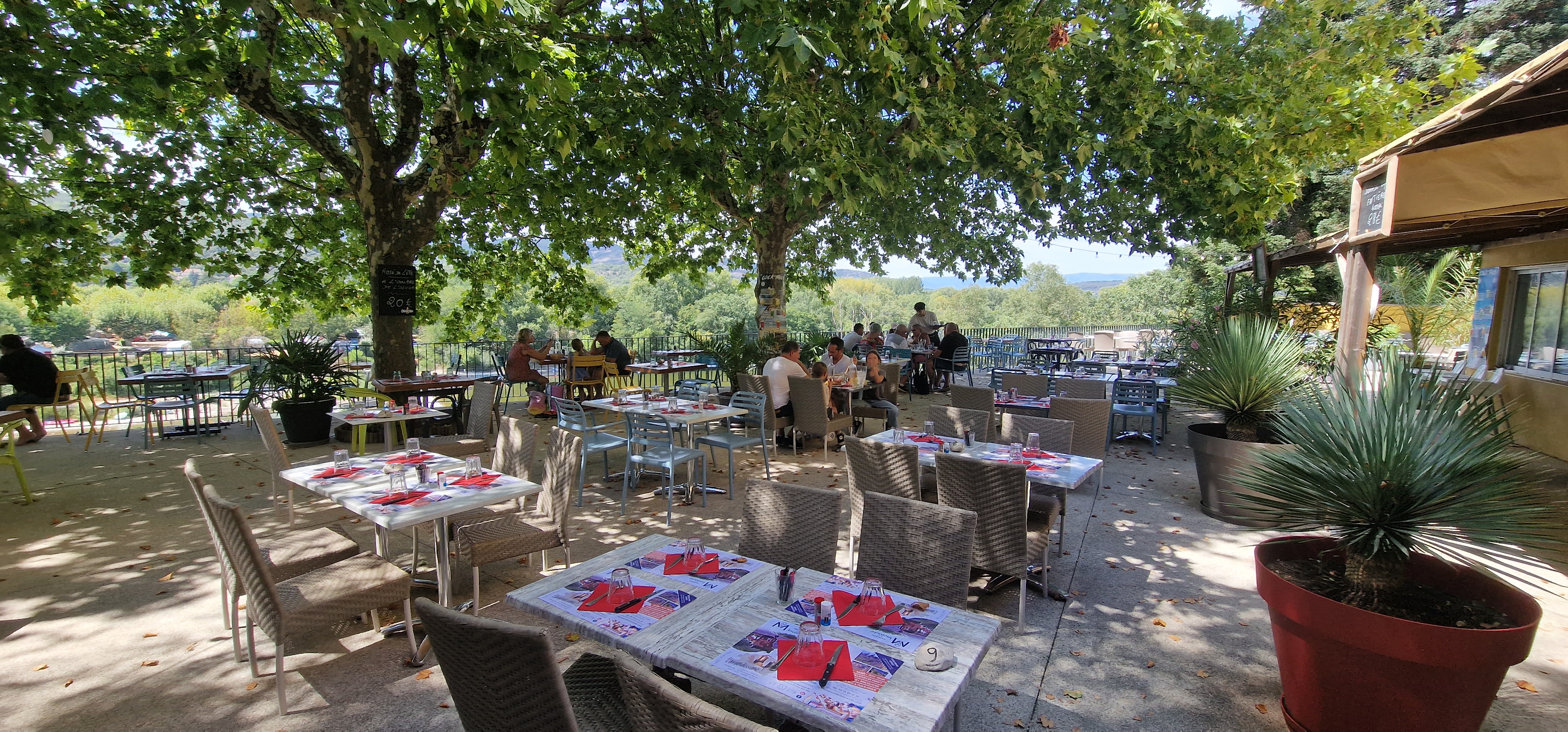 Bon ambiance avec vu sur la descente de canoë, produit de qualité... bémol les fumeurs. Sinon ombragée, spacieux... c'est un peu chers.