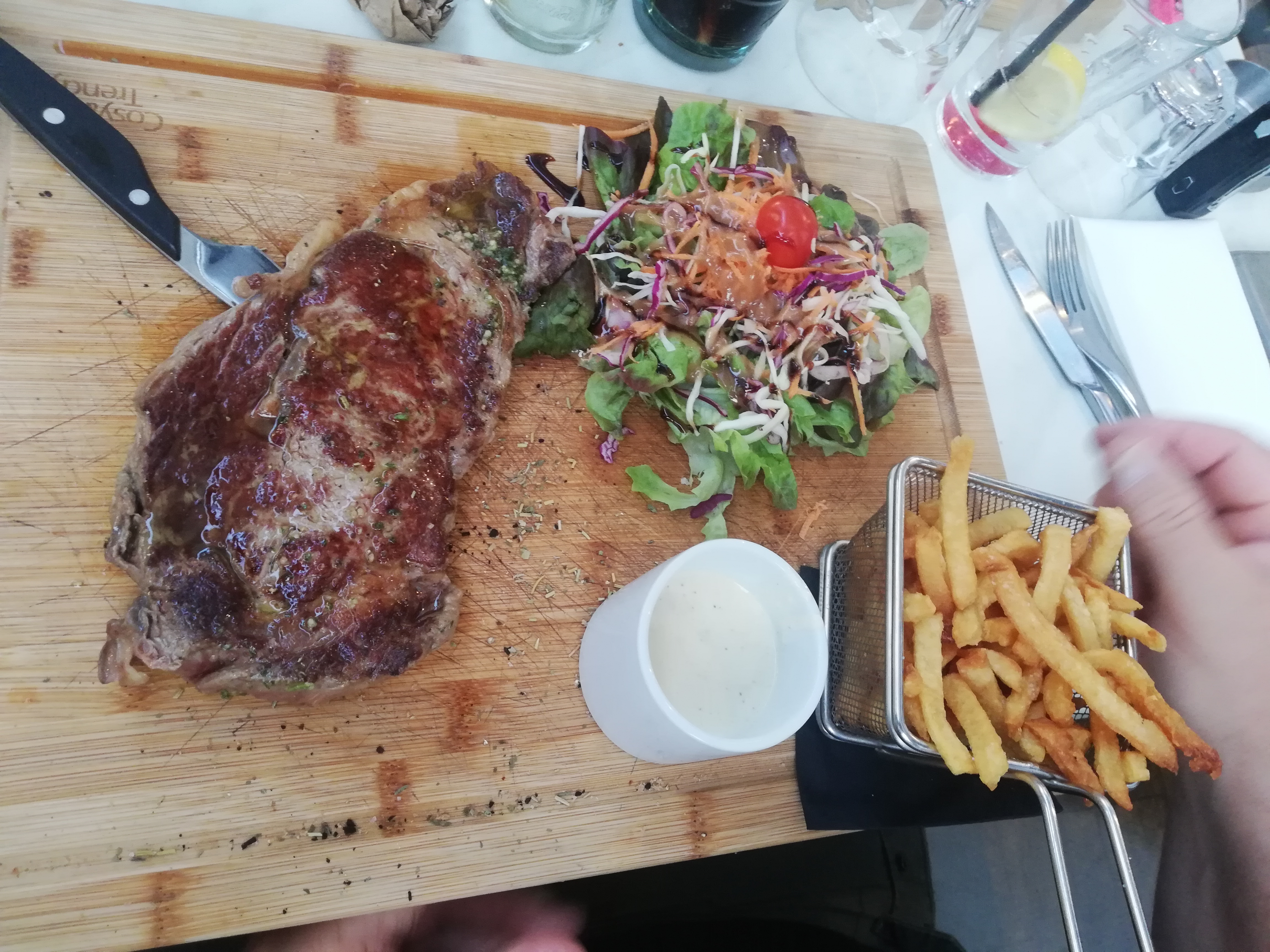 Le cadre fait classe, environnement agréable mais ça s'arrête là . Viande hyper dure (je ne l'ai pas finie), l'accompagnement des pâtes sauce tomate sans saveur. Aucune sauce proposé pour la semelle qui sert de viande. Franchement autant aller à buffalo grill cher pour ce que c'est. Bonjour et adieu