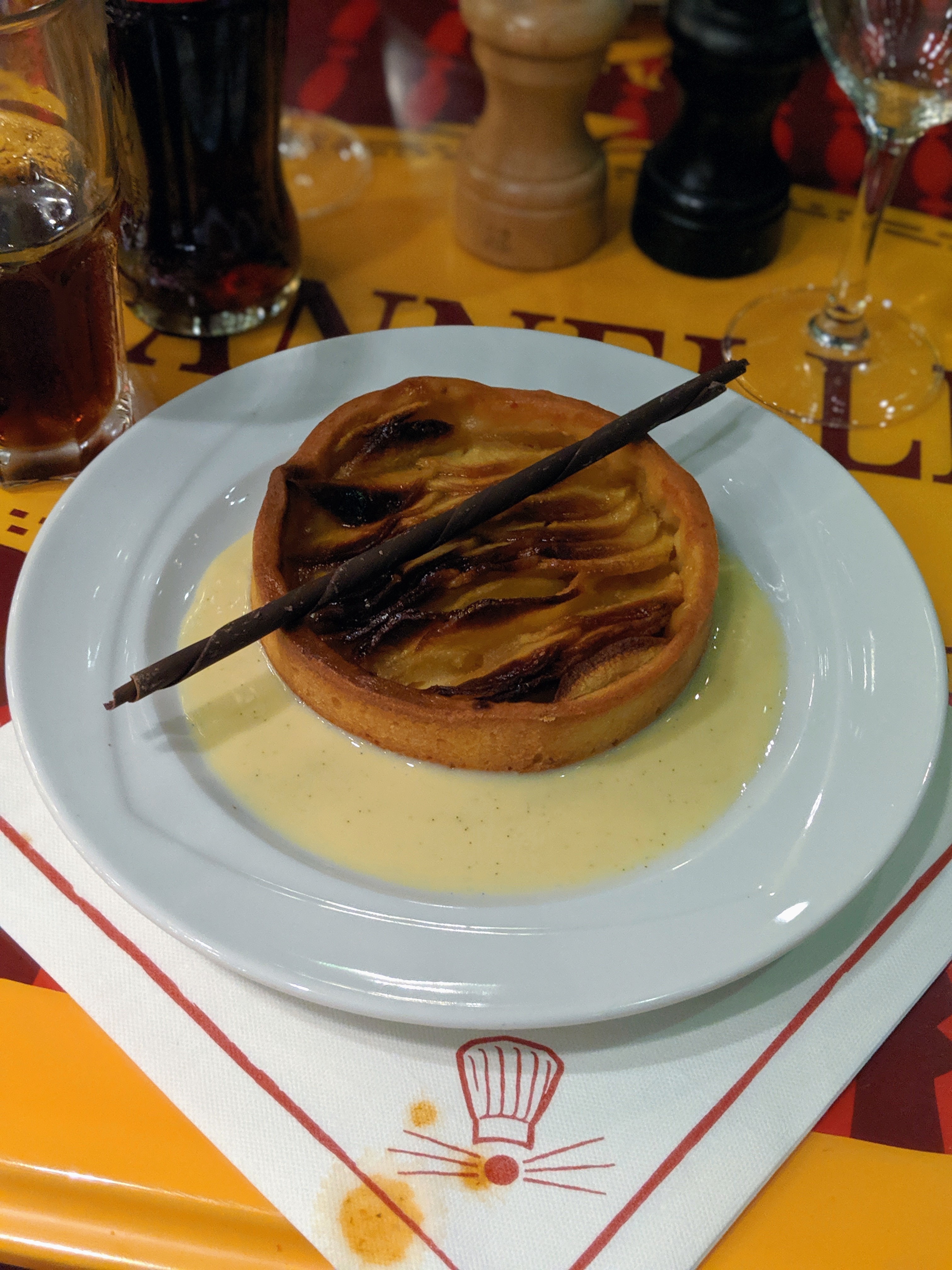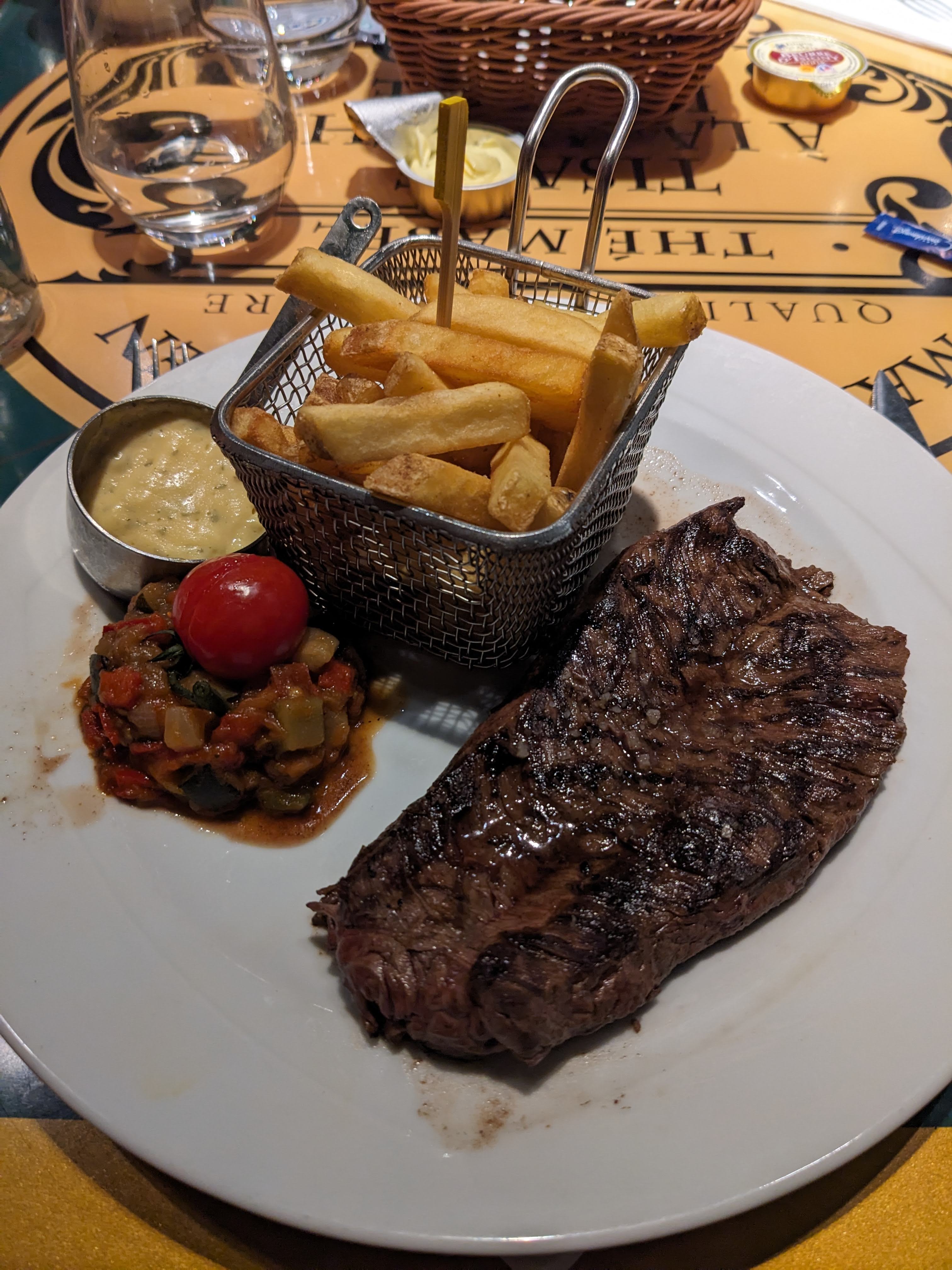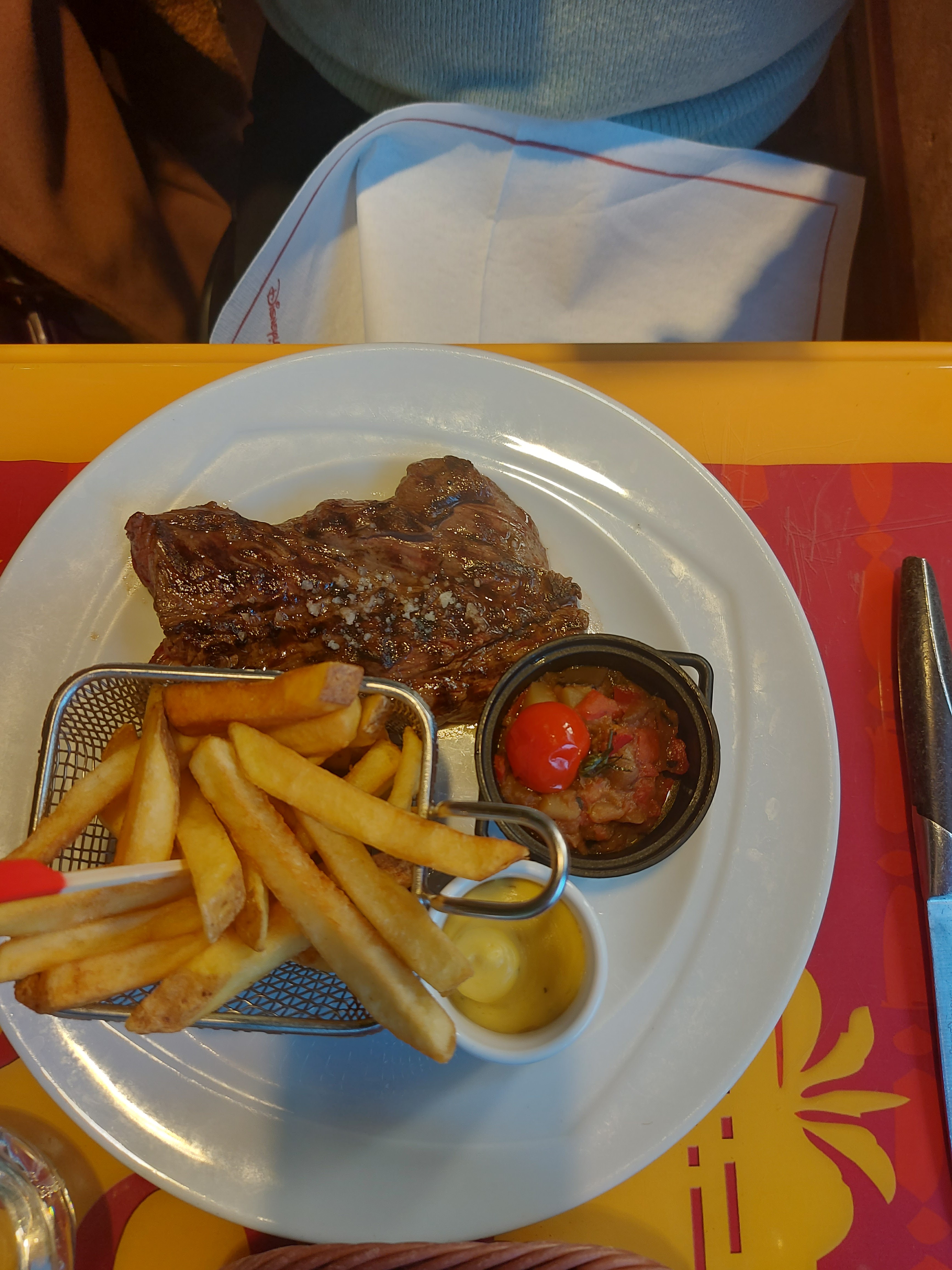 Bon endroit pour un repas mais assurez-vous de réserver car il est très populaire. La soupe est un incontournable et se marie très bien avec le pain. Le pâté de canard était bon aussi et est accompagné de salade. Le poisson était bon et accompagné de purée de pommes de terre et de ratatouille. Le steak est très moelleux, alors coupez-le finement et à contre-courant. Livré avec frites et ratatouille. La tarte tartin et le dessert spécial étaient tous deux très bons. Le dessert spécial ressemble à du fromage mais a un goût de framboise !